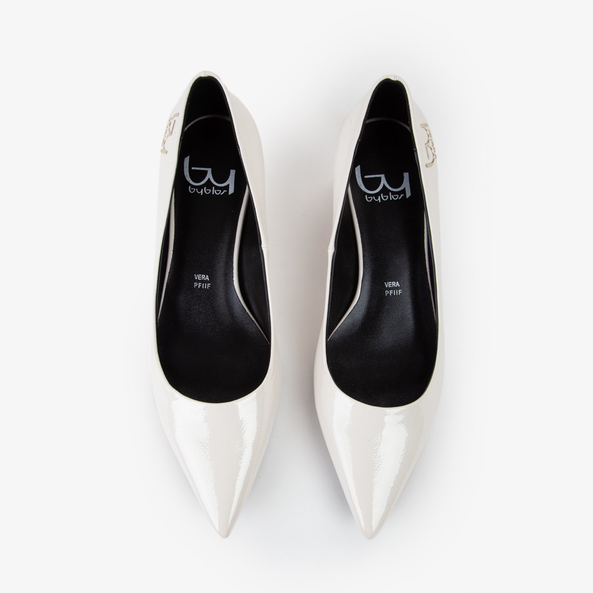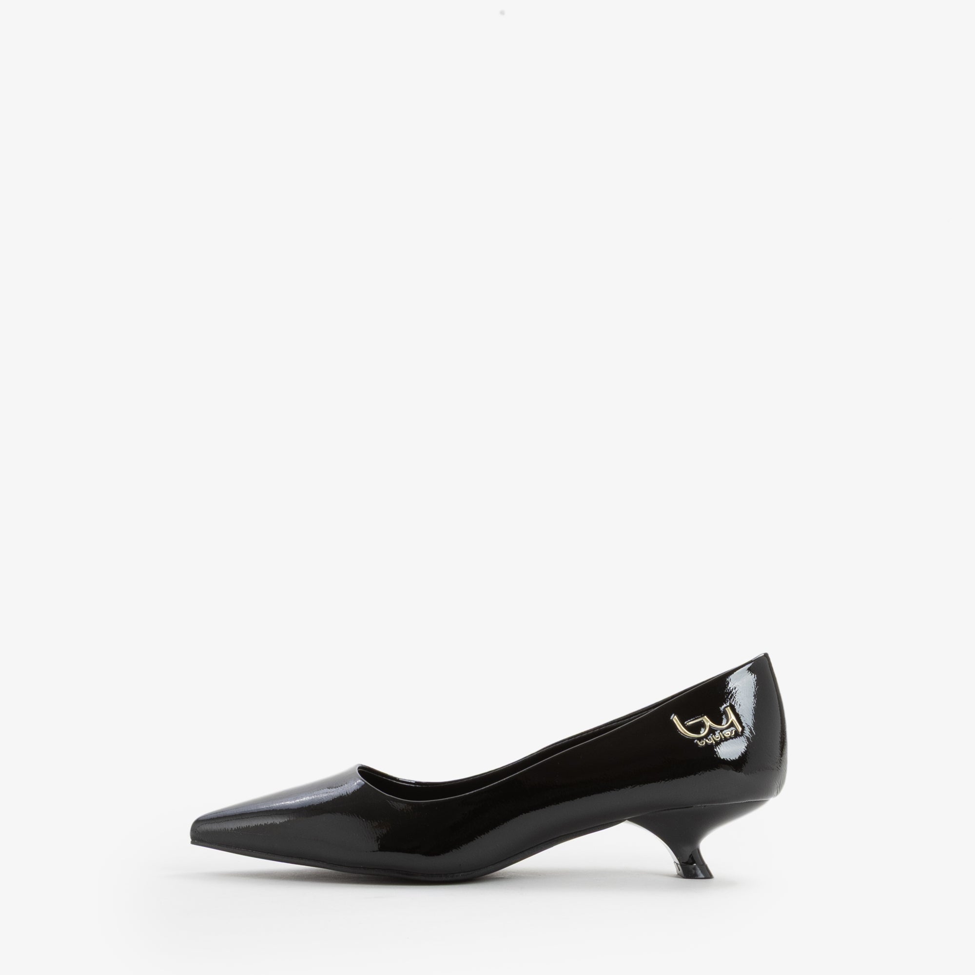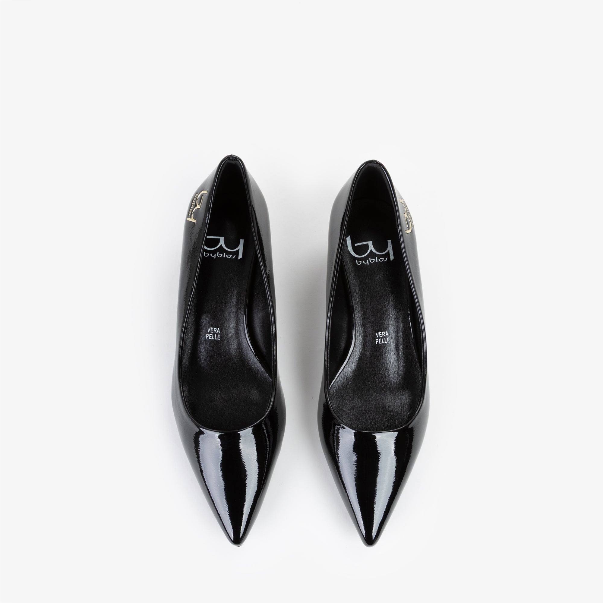 Décolleté in vernice, unicona di eleganza intramontabile con un twist contemporaneo. La punta sfilata slancia la silhouette, mentreil tacco kitten heel offre comodità senza rinunciare al fascino. Il logo dorato ByByblos, posizionato con discreta raffinatezza sultallone, aggiunge un tocco distintivo e luminoso. Ideale per cerimonie, occasioni speciali o per valorizzare un outfit da ufficio con un accento sofisticato e deciso.