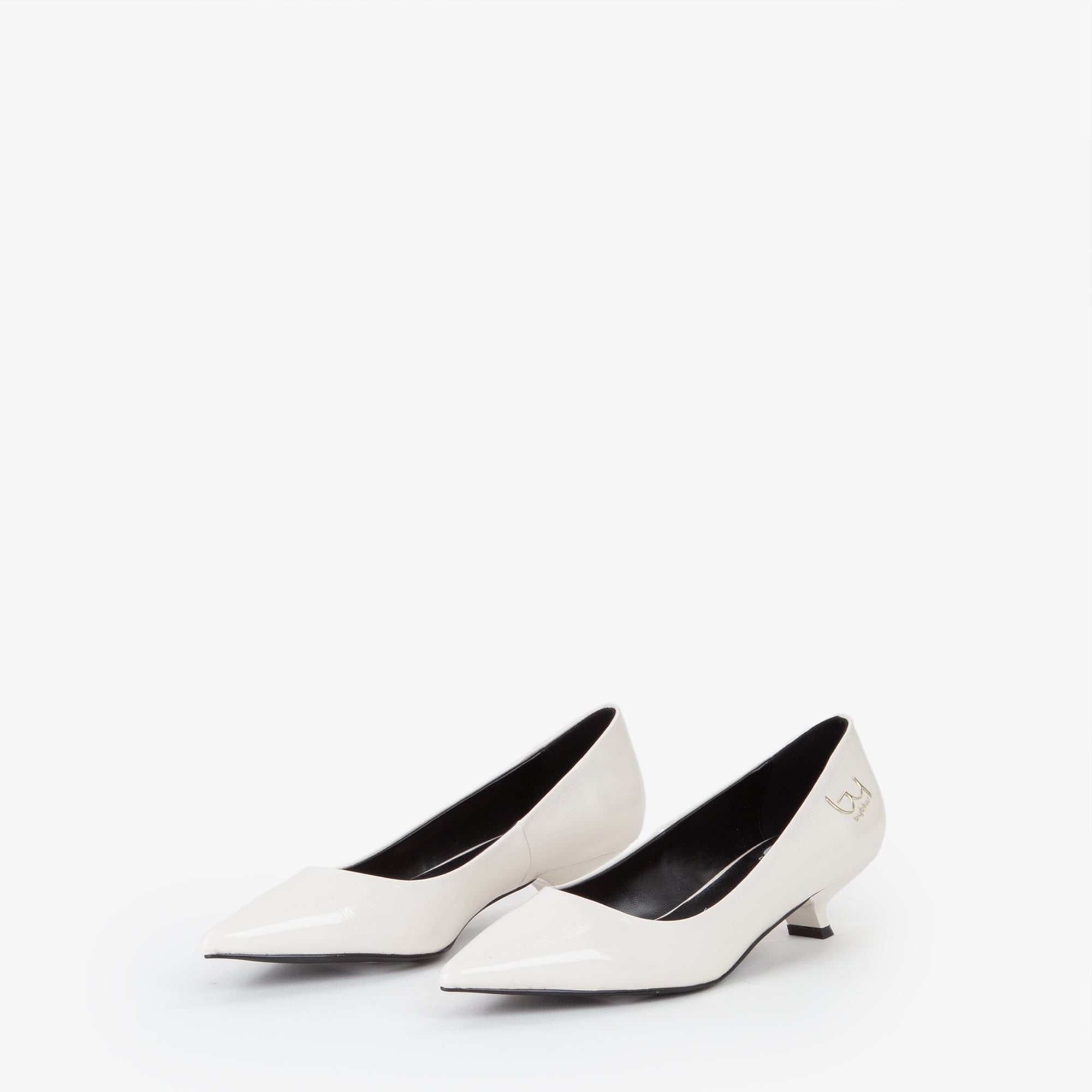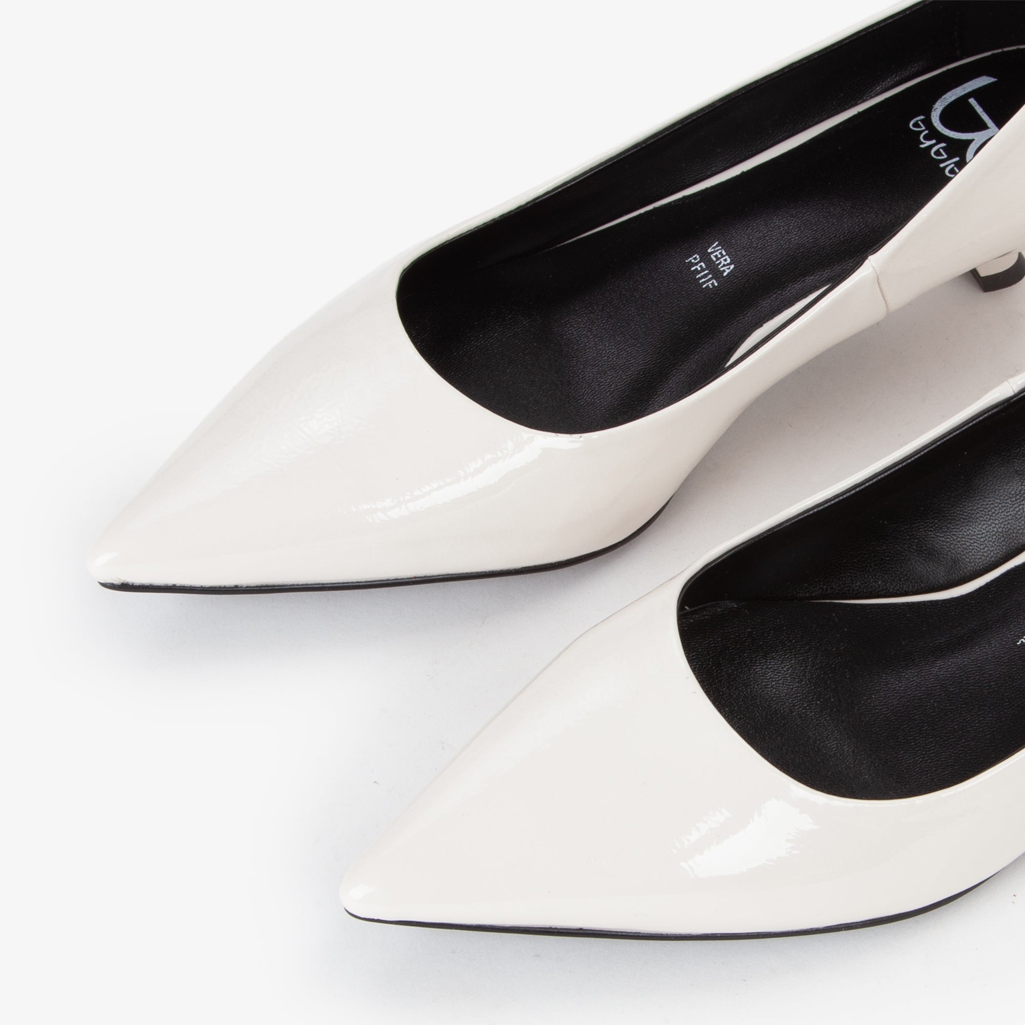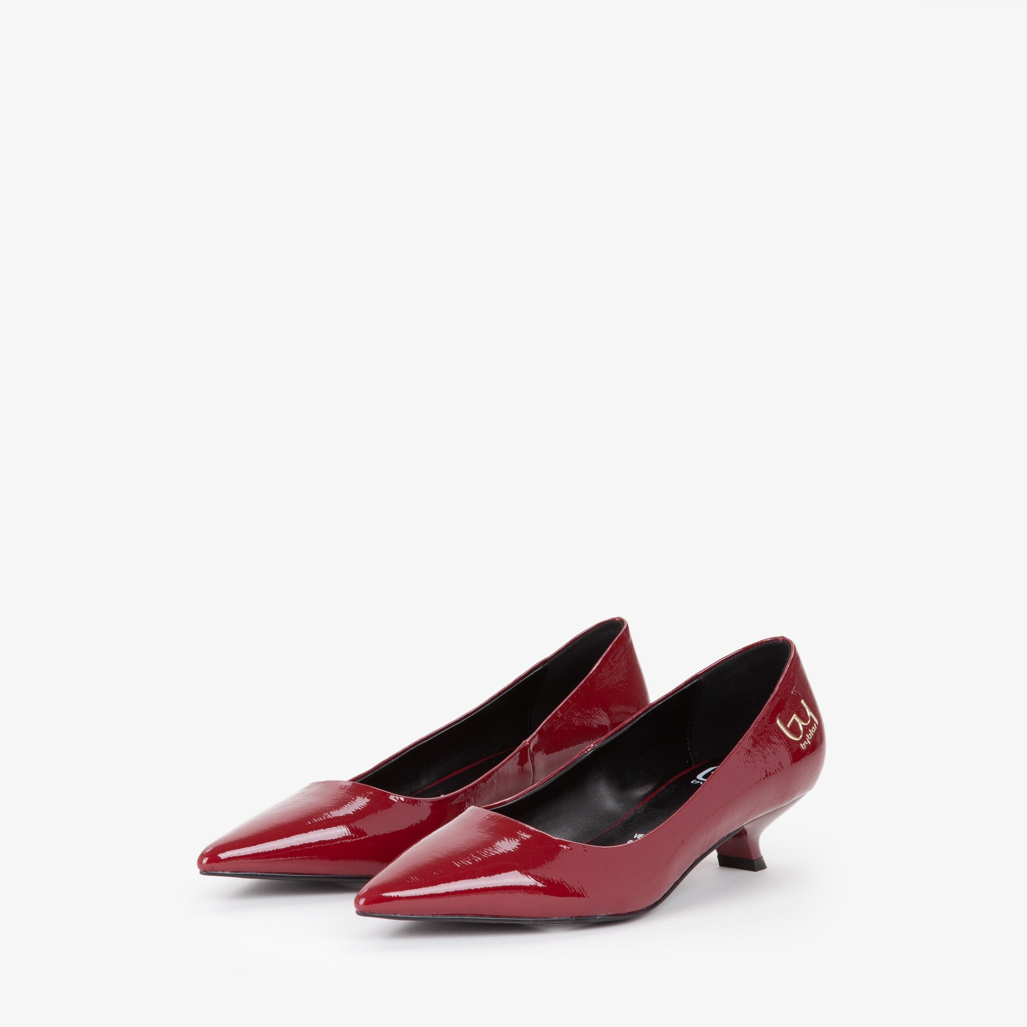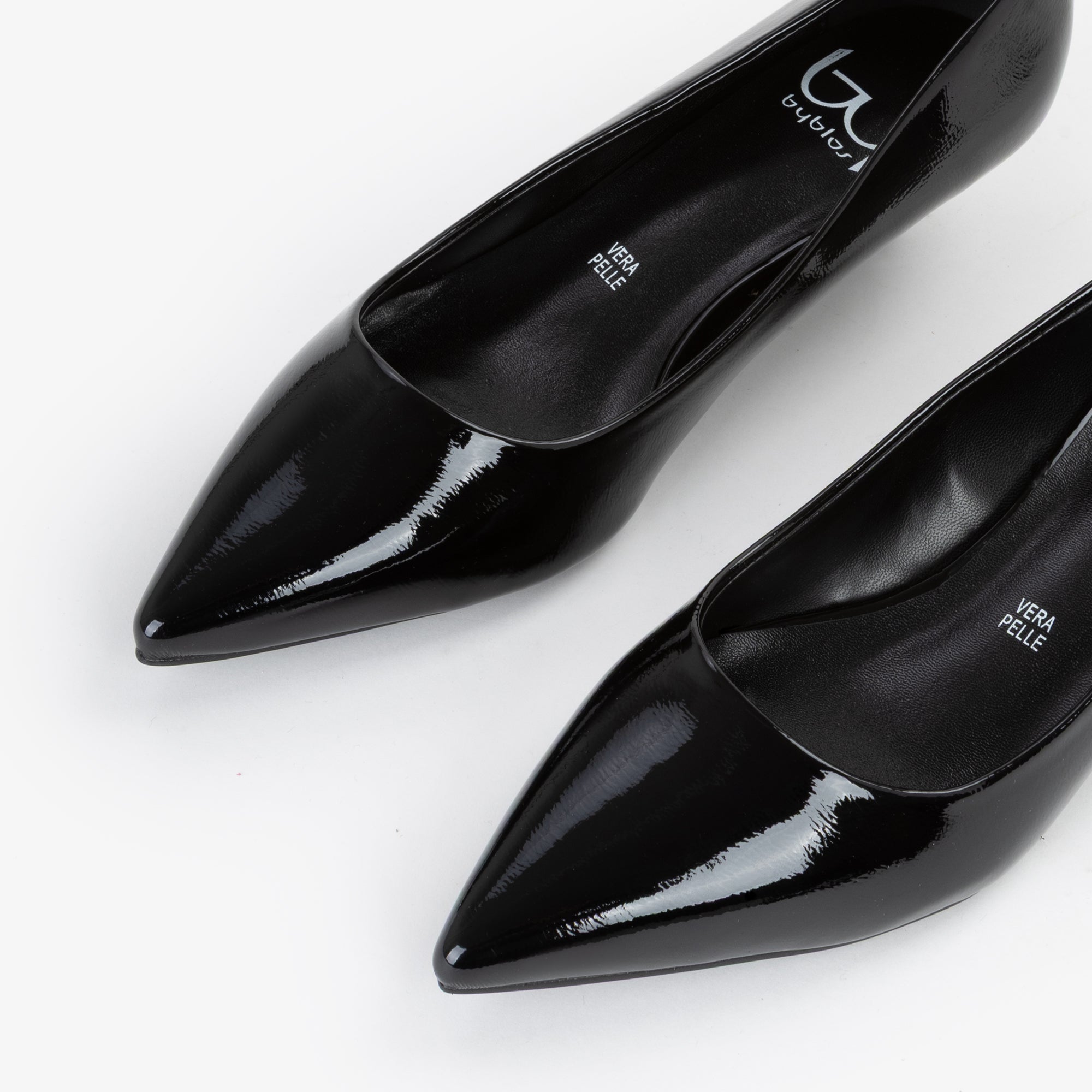 Décolleté in vernice, unicona di eleganza intramontabile con un twist contemporaneo. La punta sfilata slancia la silhouette, mentreil tacco kitten heel offre comodità senza rinunciare al fascino. Il logo dorato ByByblos, posizionato con discreta raffinatezza sultallone, aggiunge un tocco distintivo e luminoso. Ideale per cerimonie, occasioni speciali o per valorizzare un outfit da ufficio con un accento sofisticato e deciso.