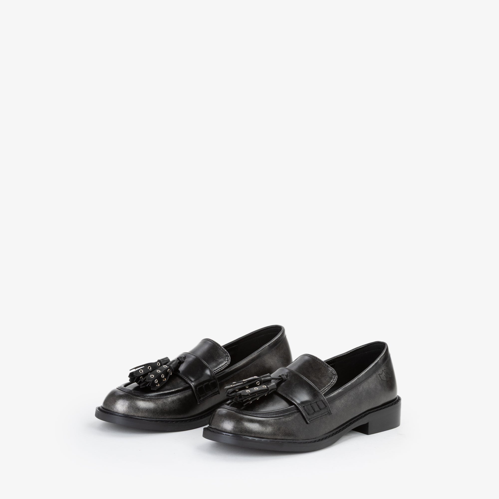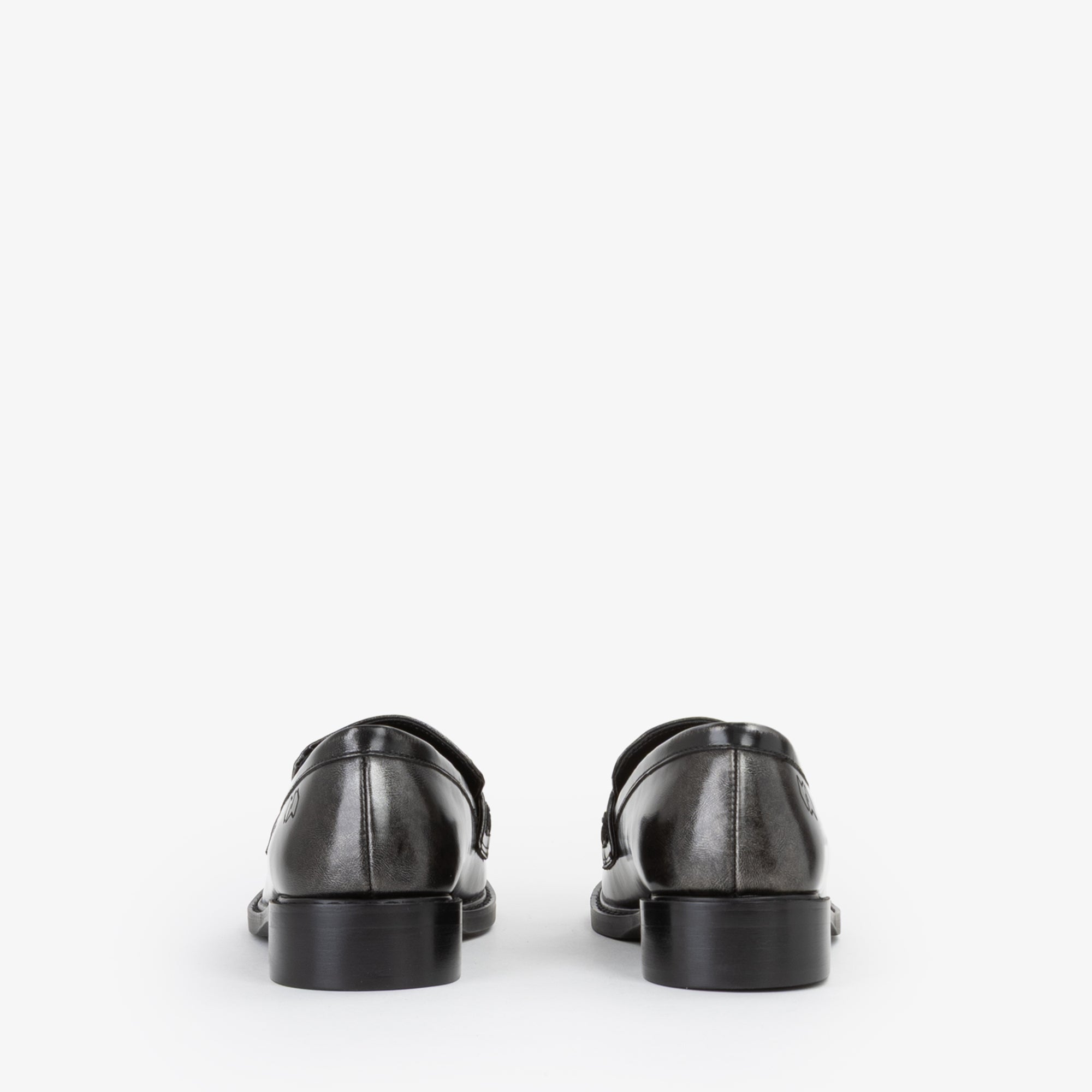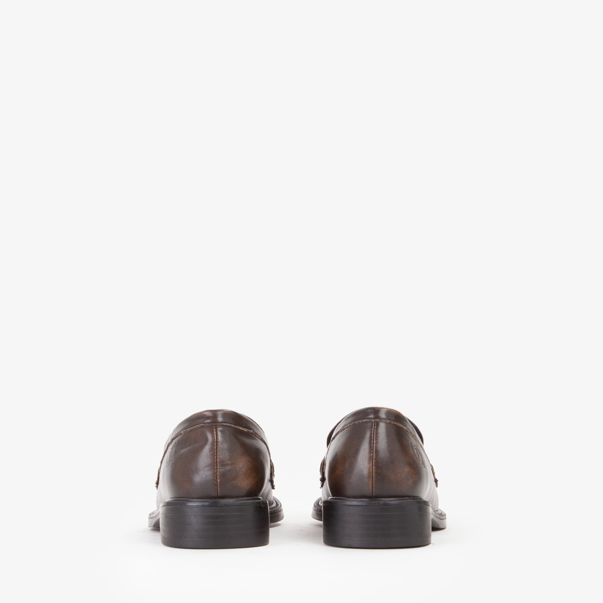 Questo mocassino con tomaia effetto vintage rivisita un grande classico con un tocco deciso. Il design è arricchito da nappine conborchiette metalliche, che donano carattere e originalità. Il tacco basso assicura stabilità e comfort durante la camminata, mentrela costruzione morbida lo rende adatto a un uso quotidiano. Un modello versatile, perfetto per completare look casual-chic o aggiungere un accento grintoso a outfit più formali.