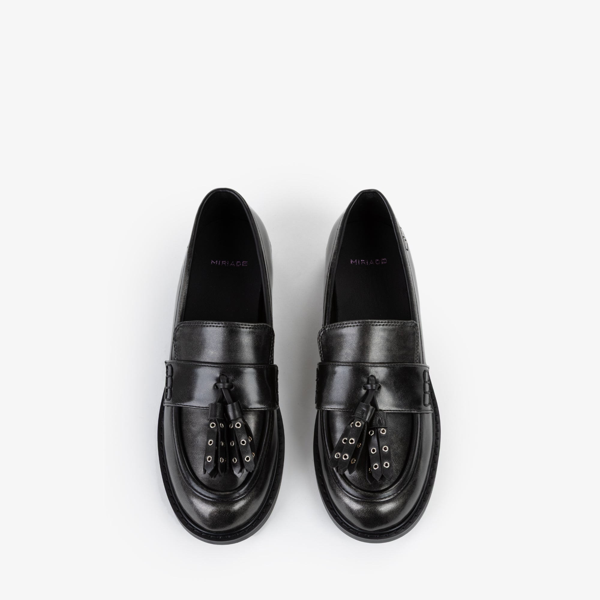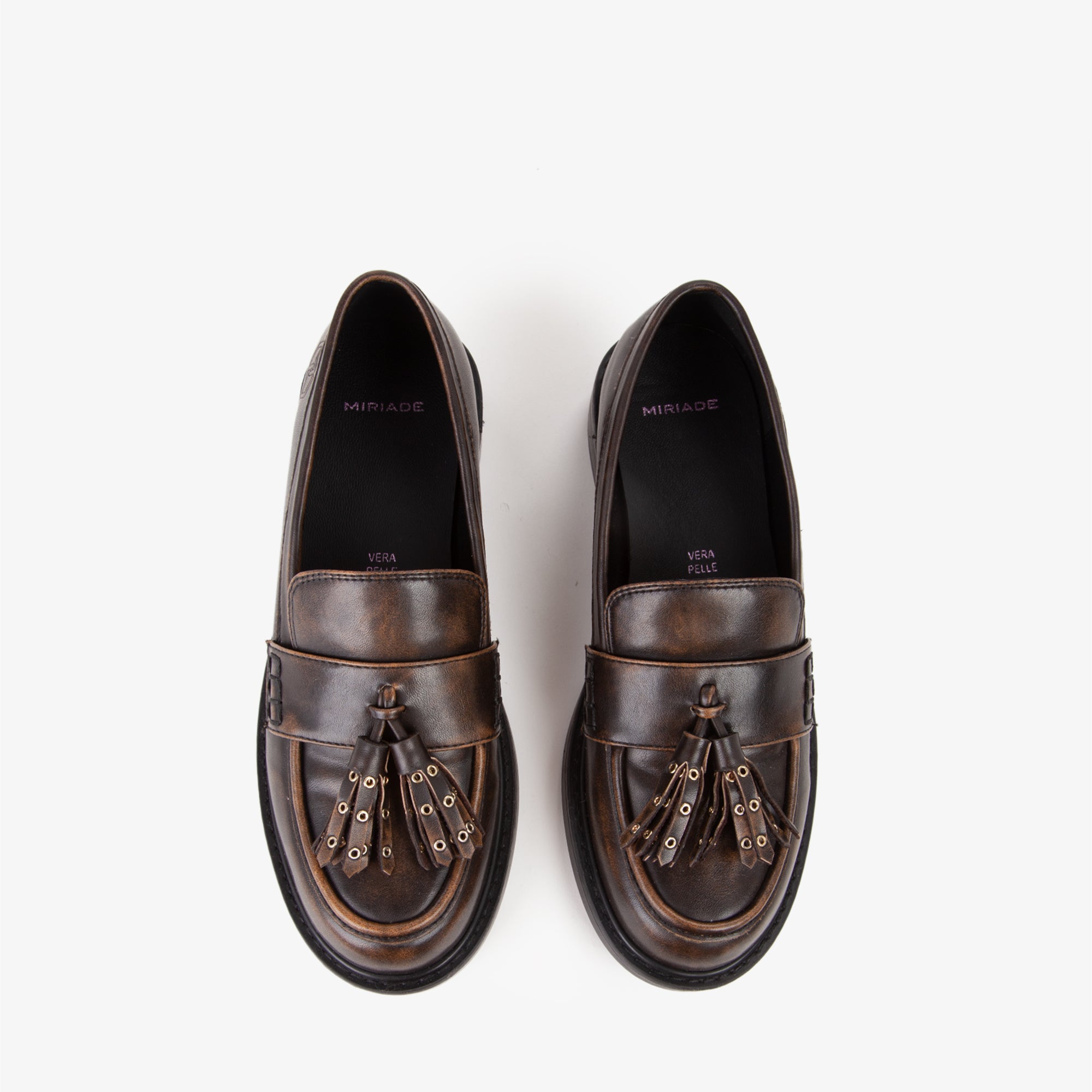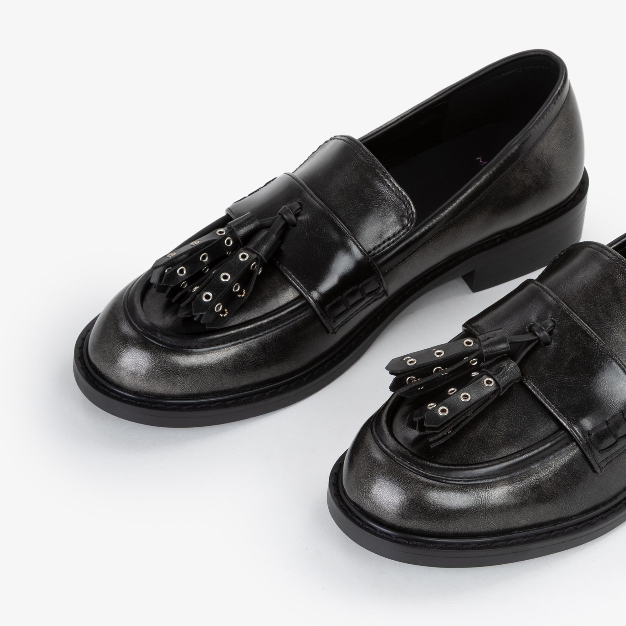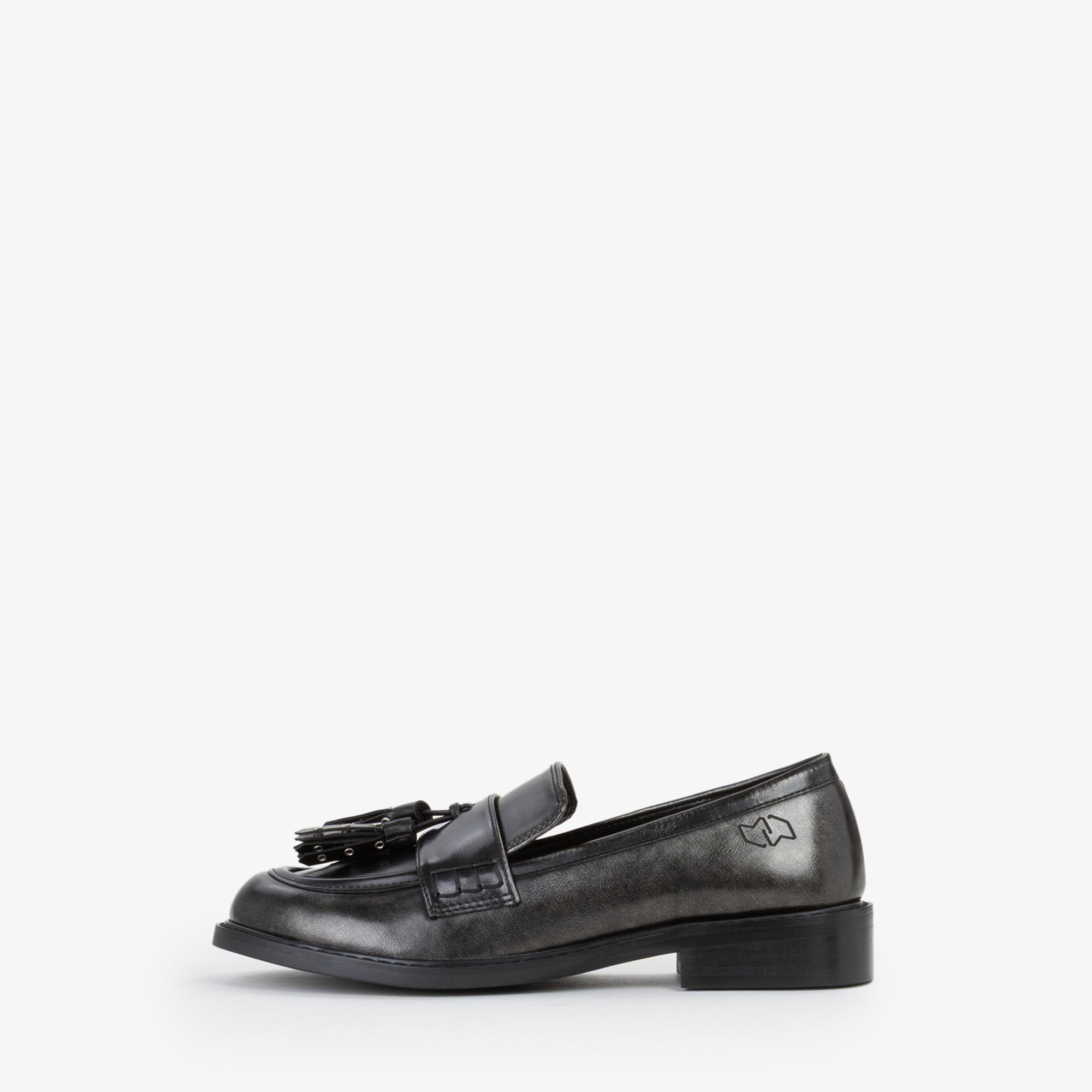 Questo mocassino con tomaia effetto vintage rivisita un grande classico con un tocco deciso. Il design è arricchito da nappine conborchiette metalliche, che donano carattere e originalità. Il tacco basso assicura stabilità e comfort durante la camminata, mentrela costruzione morbida lo rende adatto a un uso quotidiano. Un modello versatile, perfetto per completare look casual-chic o aggiungere un accento grintoso a outfit più formali.