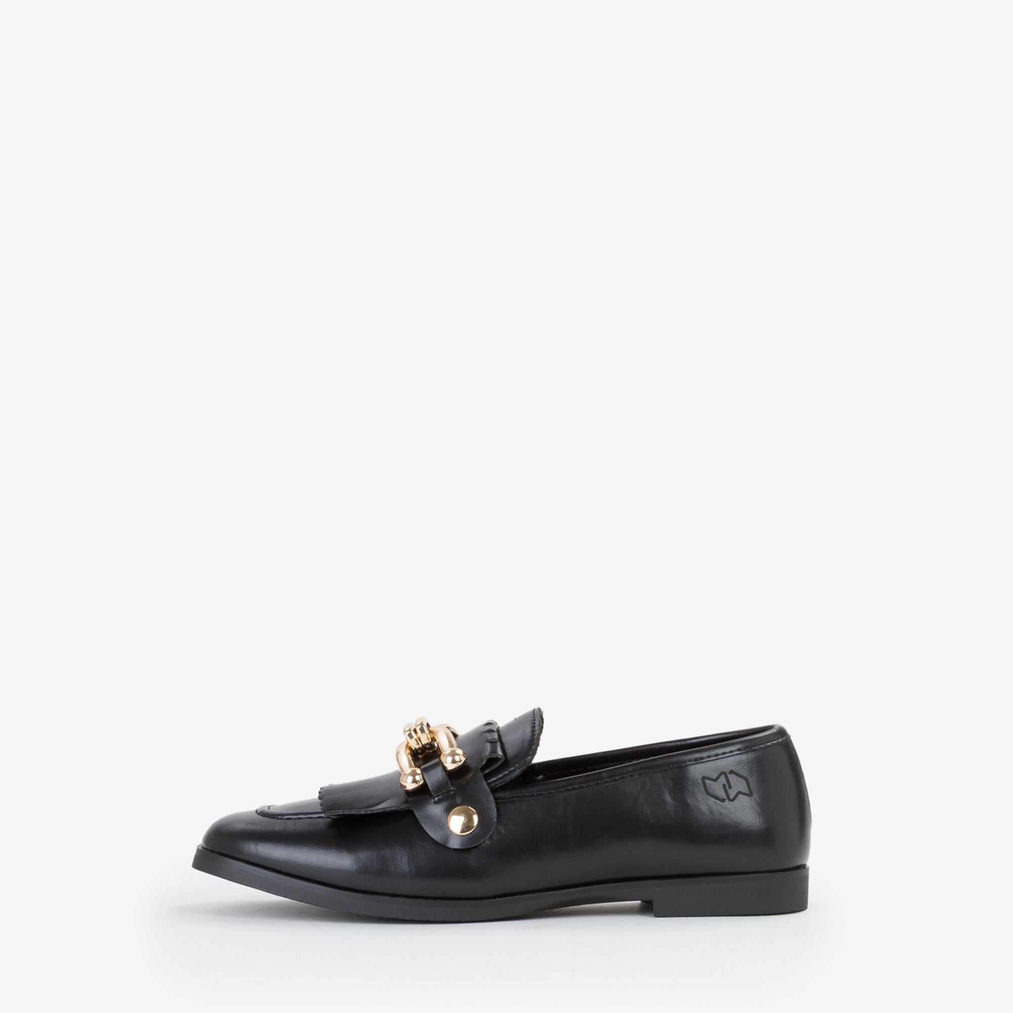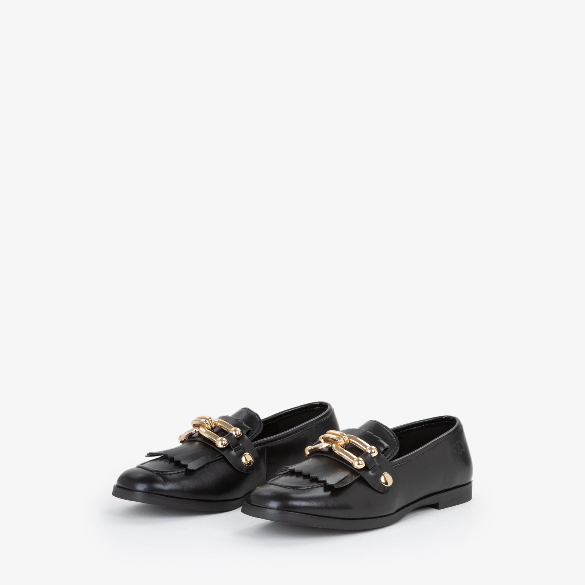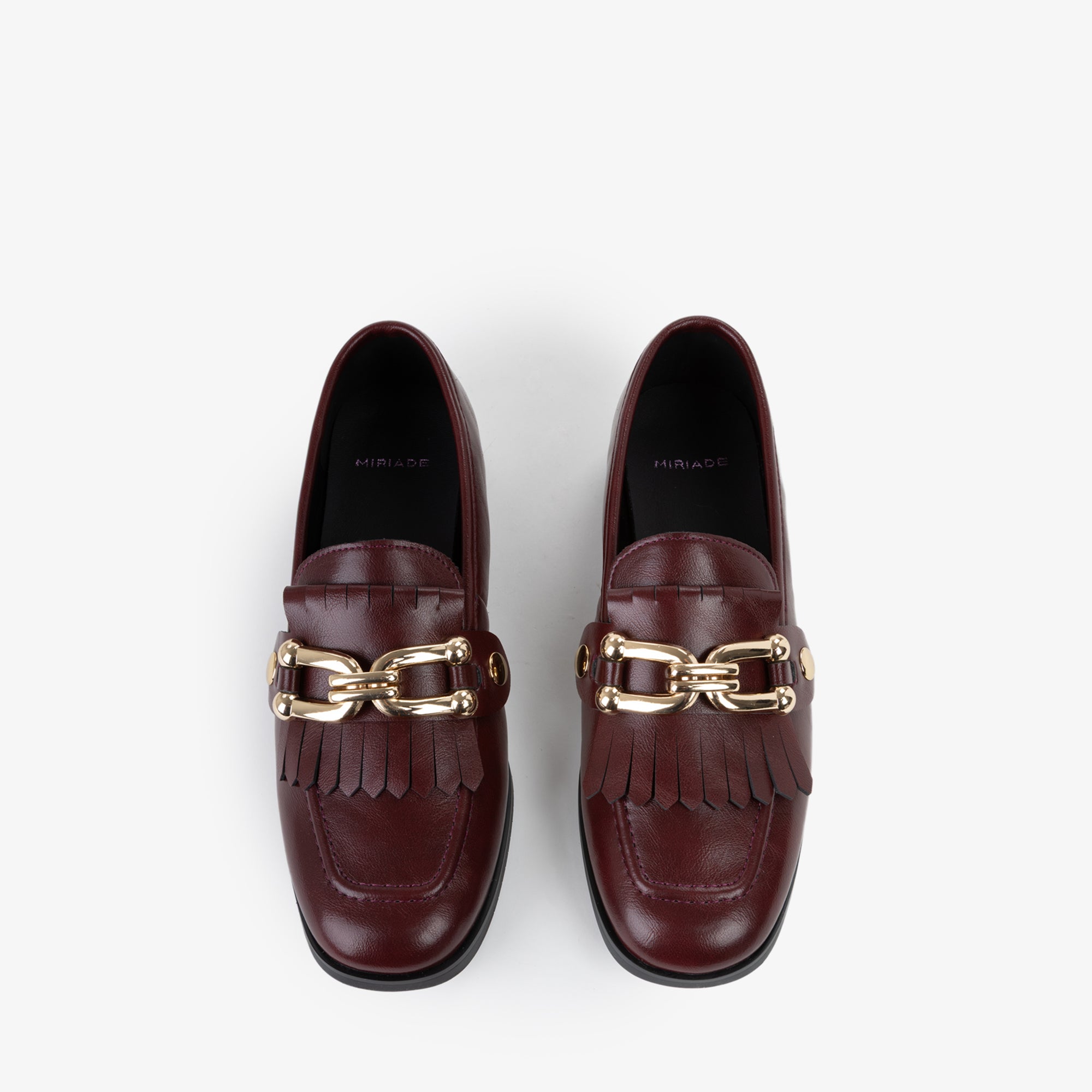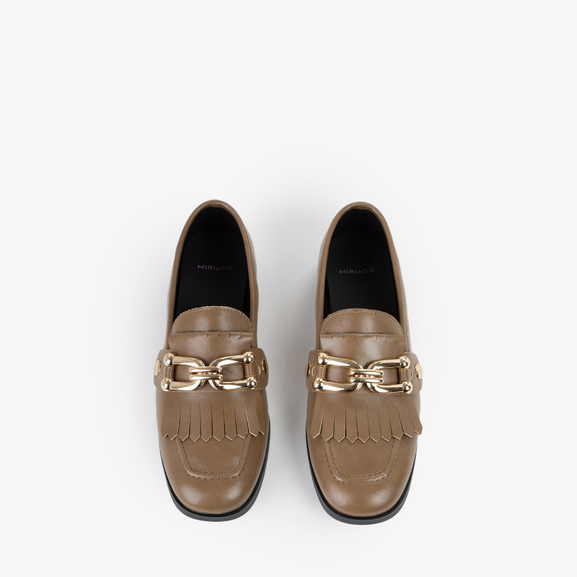 Mocassino dal design elegante e versatile, arricchito da doppio accessorio intercabiabile, uno con frange e fibbia dorata, l'altrosemplice con il logo MIRIADE. Gli accessori consentono di personalizzare il look in base alloccasione. La suola bassa garantisce comfort per un uso quotidiano, mentre le finiture metalliche donano un tocco sofisticato. Perfetto per passare con disinvoltura da unoutfit formale a uno casual-chic.