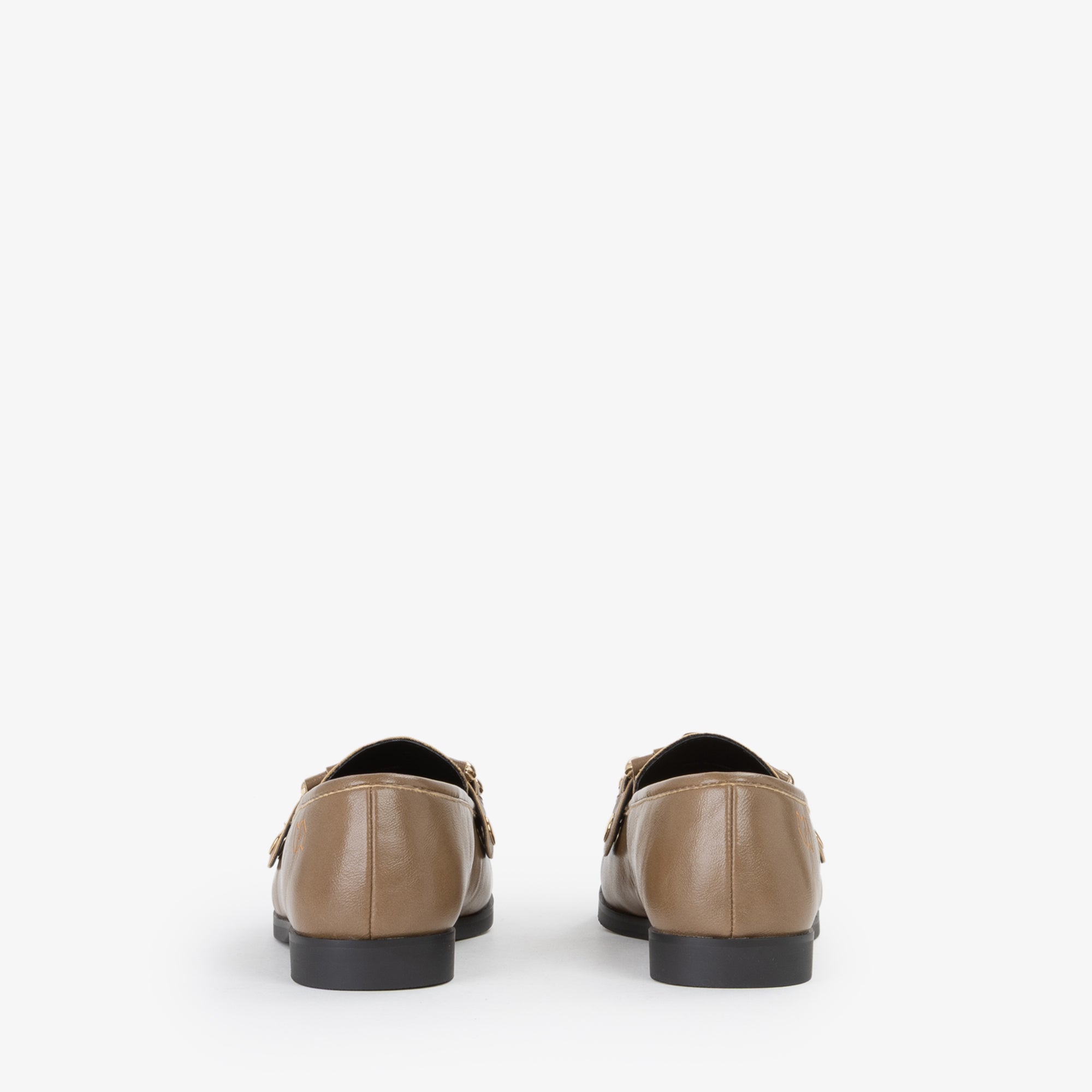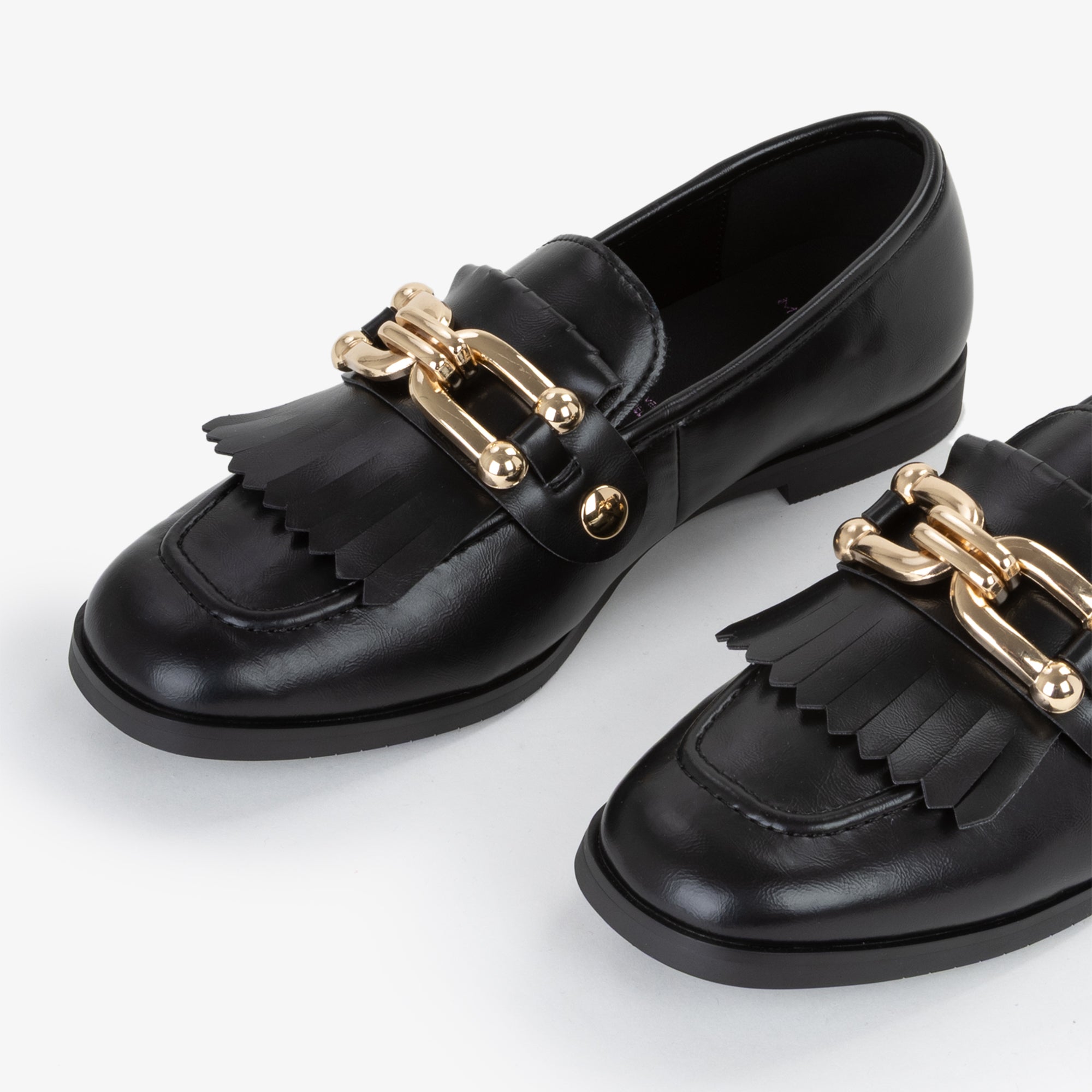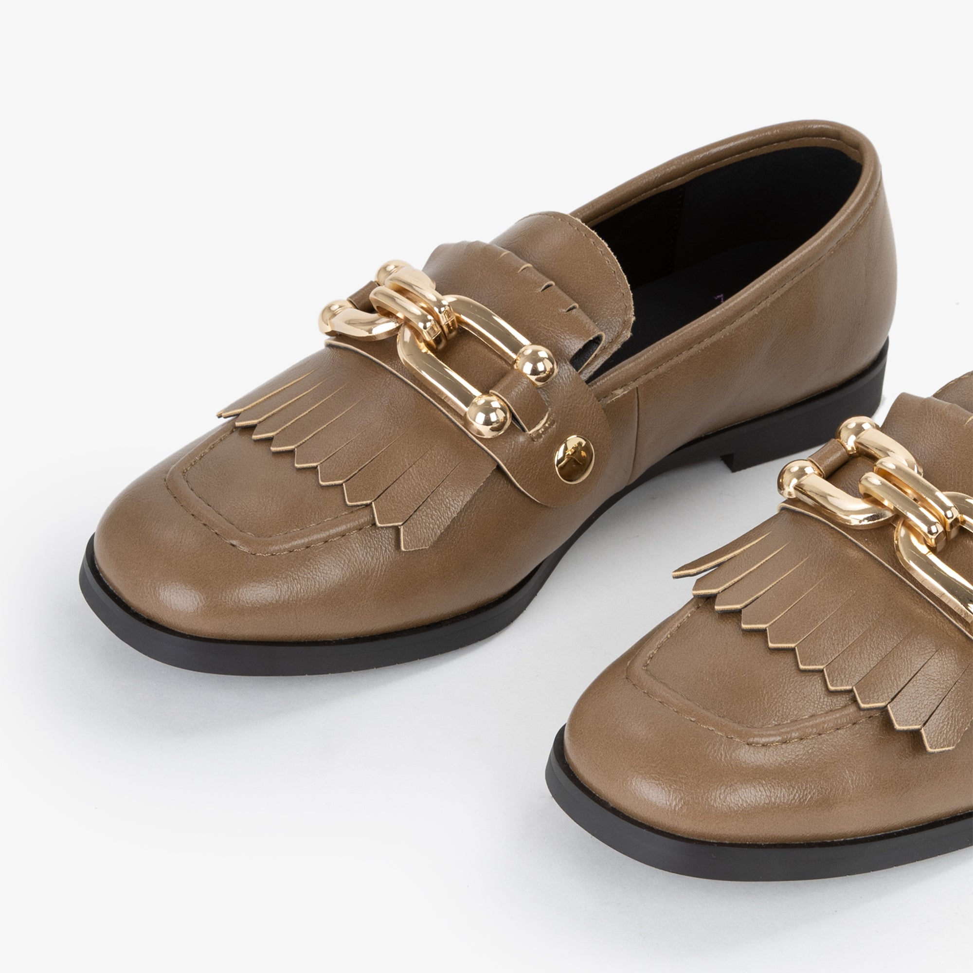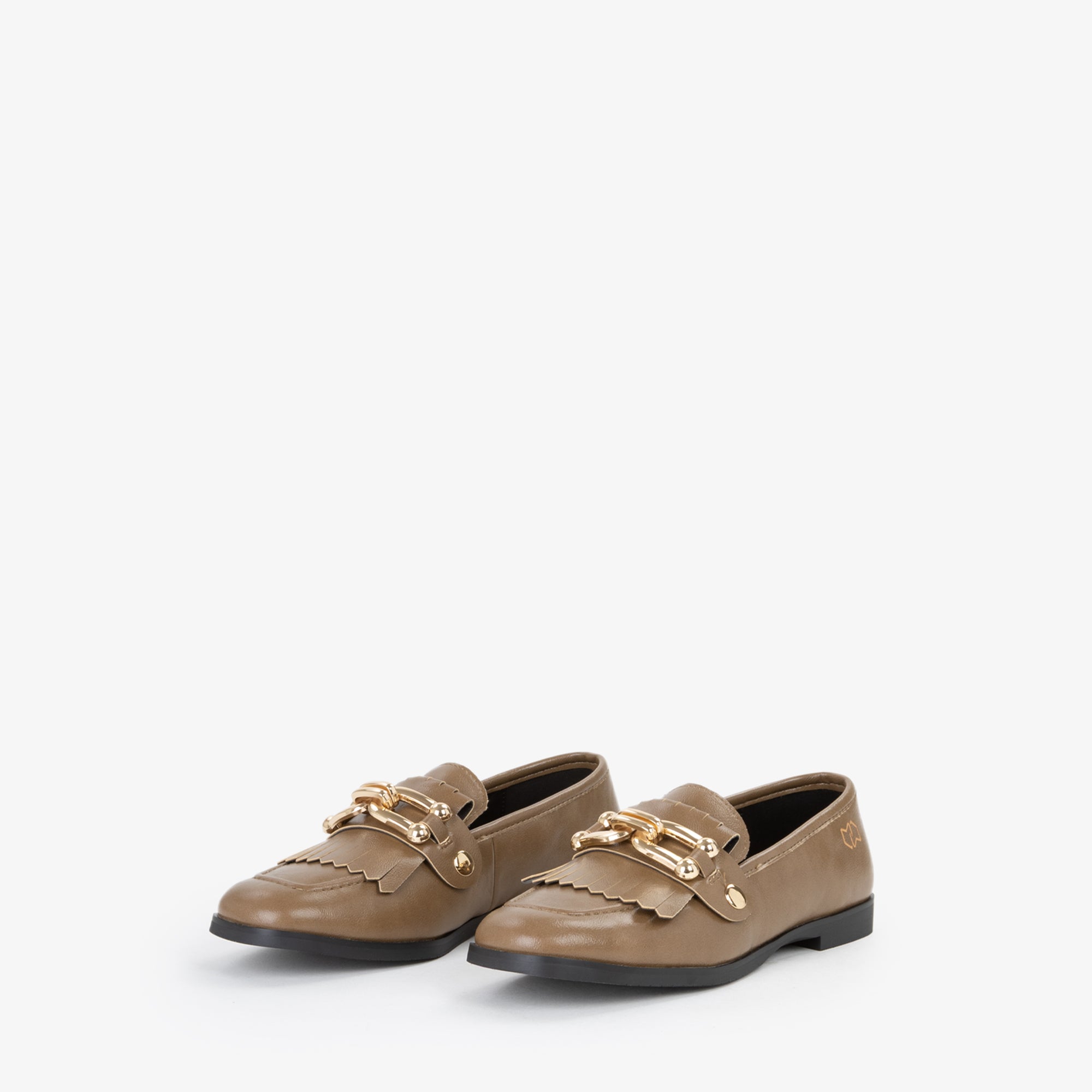 Mocassino dal design elegante e versatile, arricchito da doppio accessorio intercabiabile, uno con frange e fibbia dorata, l'altrosemplice con il logo MIRIADE. Gli accessori consentono di personalizzare il look in base alloccasione. La suola bassa garantisce comfort per un uso quotidiano, mentre le finiture metalliche donano un tocco sofisticato. Perfetto per passare con disinvoltura da unoutfit formale a uno casual-chic.