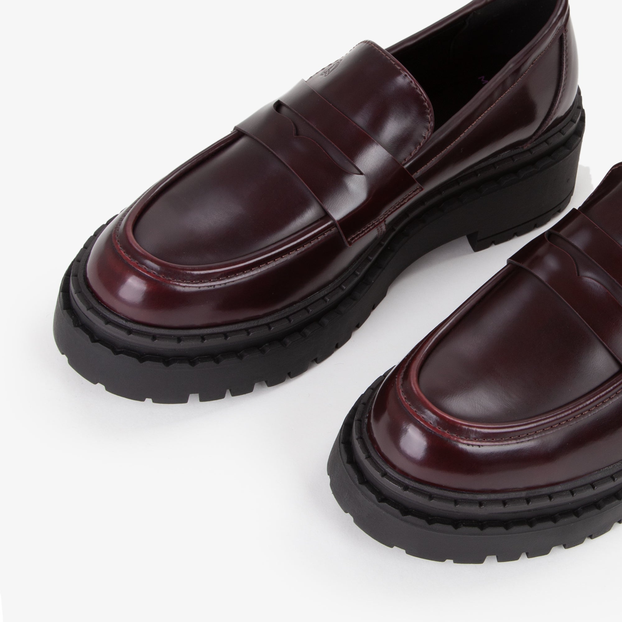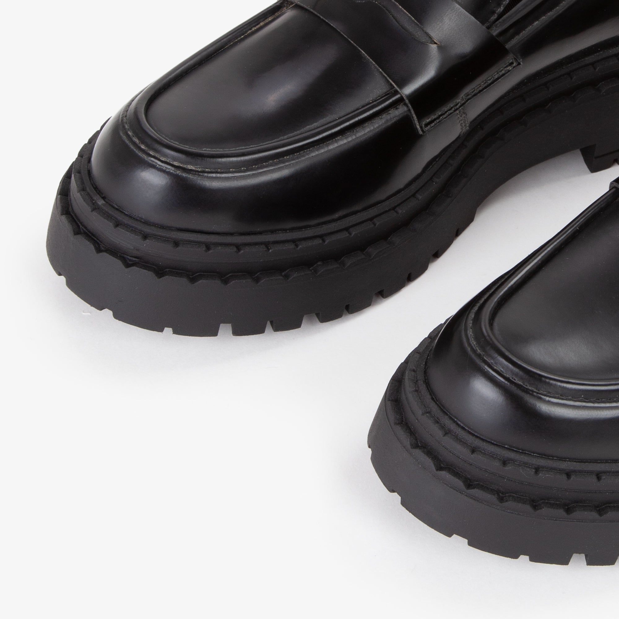 Mocassino in materiale sintetico lucido, con tomaia liscia e classica cucitura a mocassino sulla punta. Il fondo in gomma carrarmato, alto e robusto, conferisce un tocco moderno e grintoso, garantendo ottima aderenza e durata. Ideale per un look urban chic, si abbina perfettamente a pantaloni a sigaretta o jeans skinny. Perfetto per chi cerca comfort senza rinunciare a uno stile deciso e contemporaneo.
