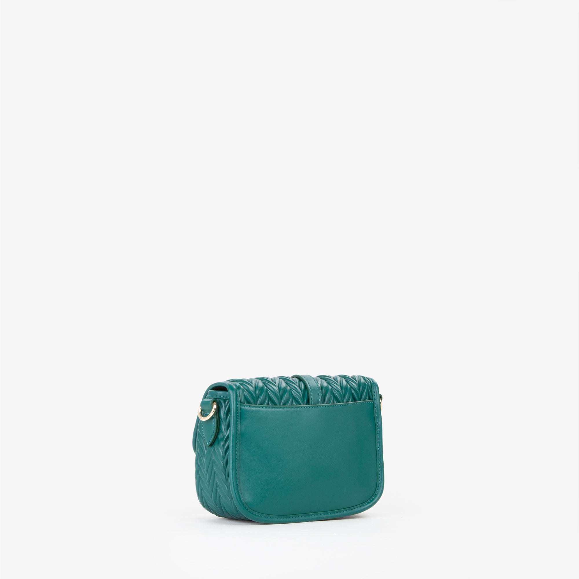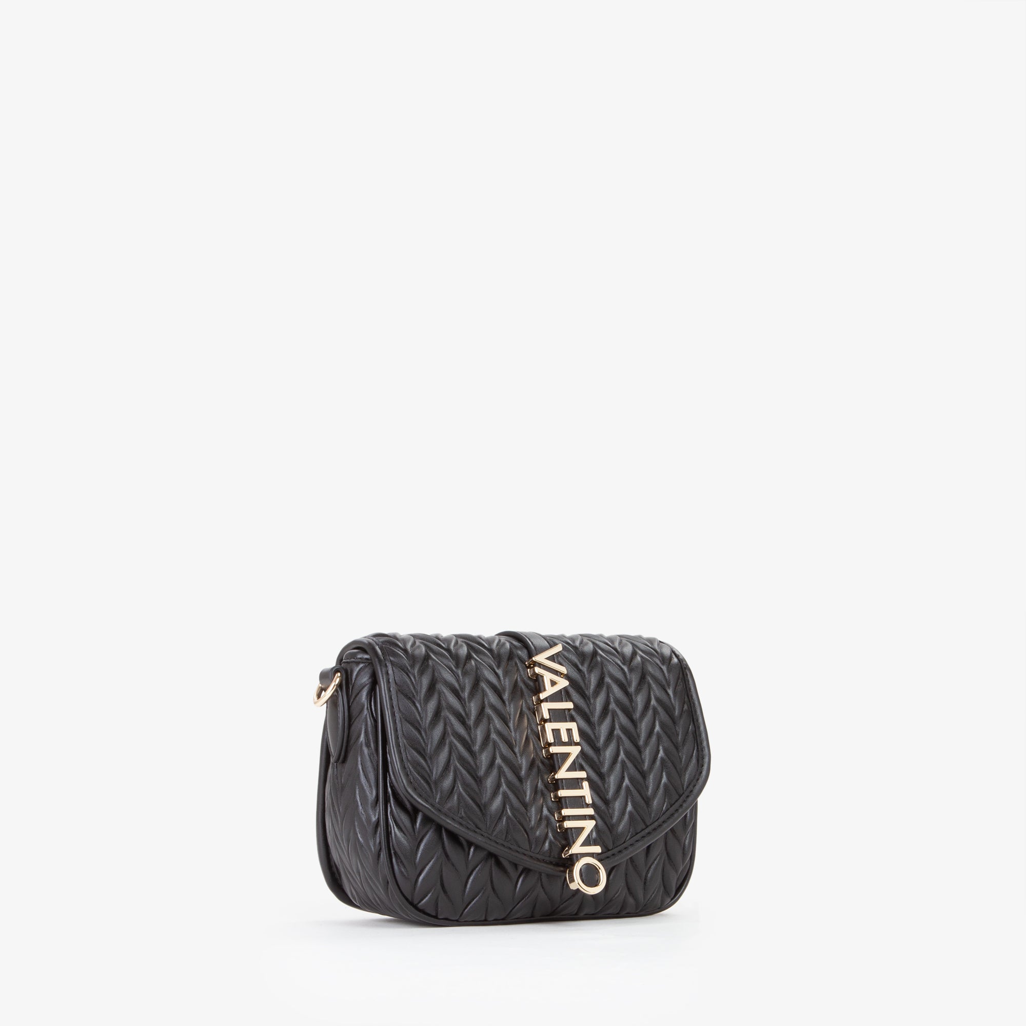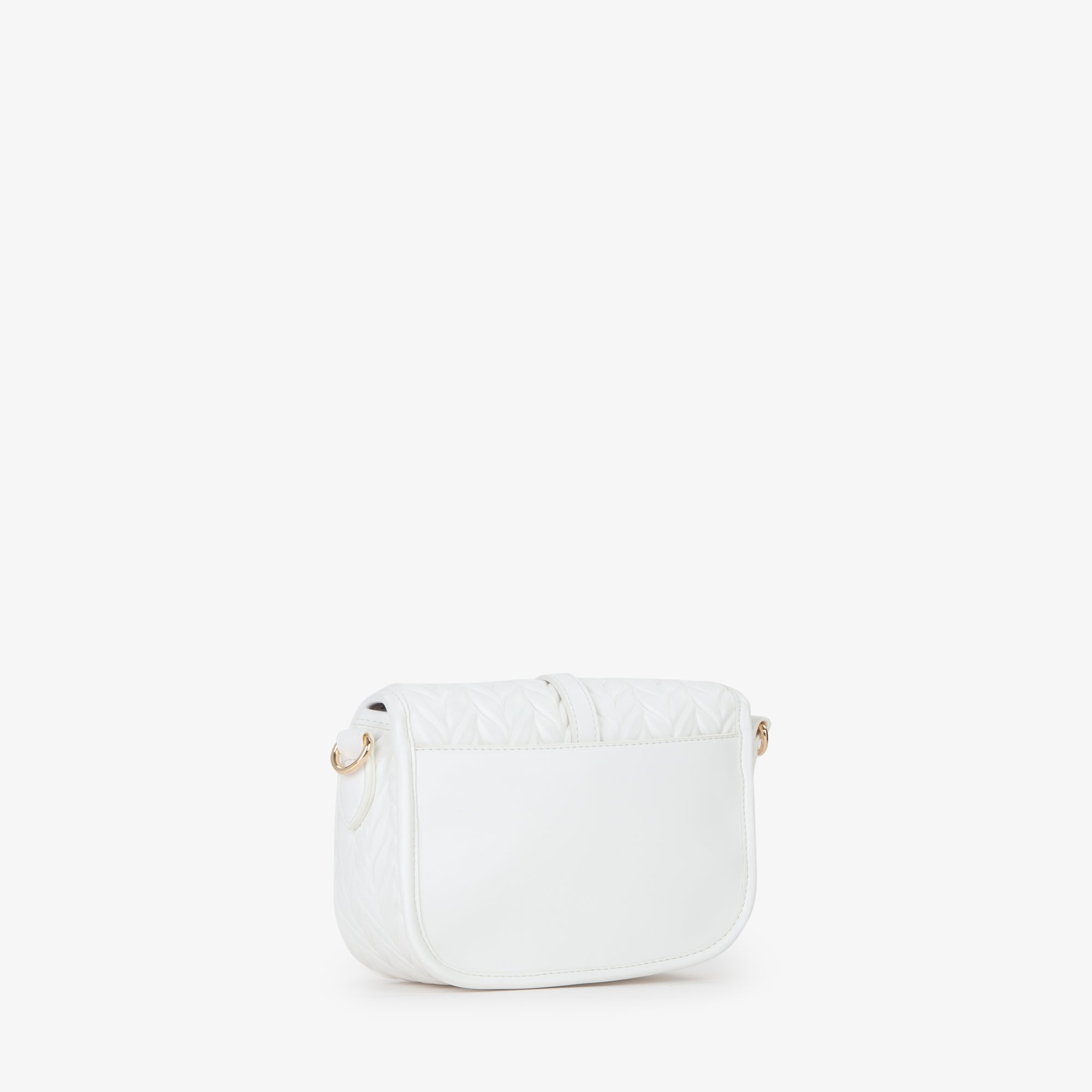 Pattina dalla finitura goffrata, con logo di metallo, dorato, che si poggia sul davanti in verticale.