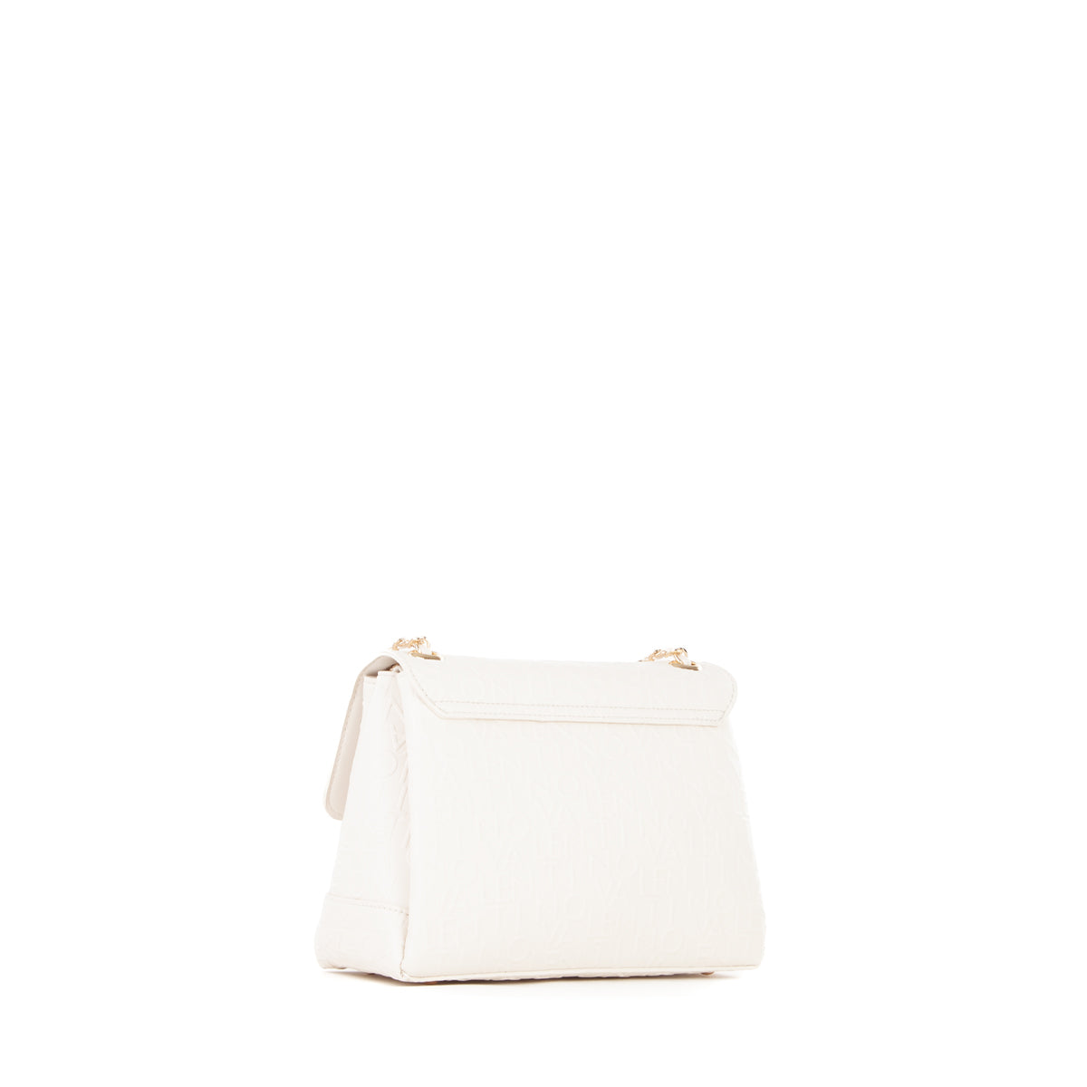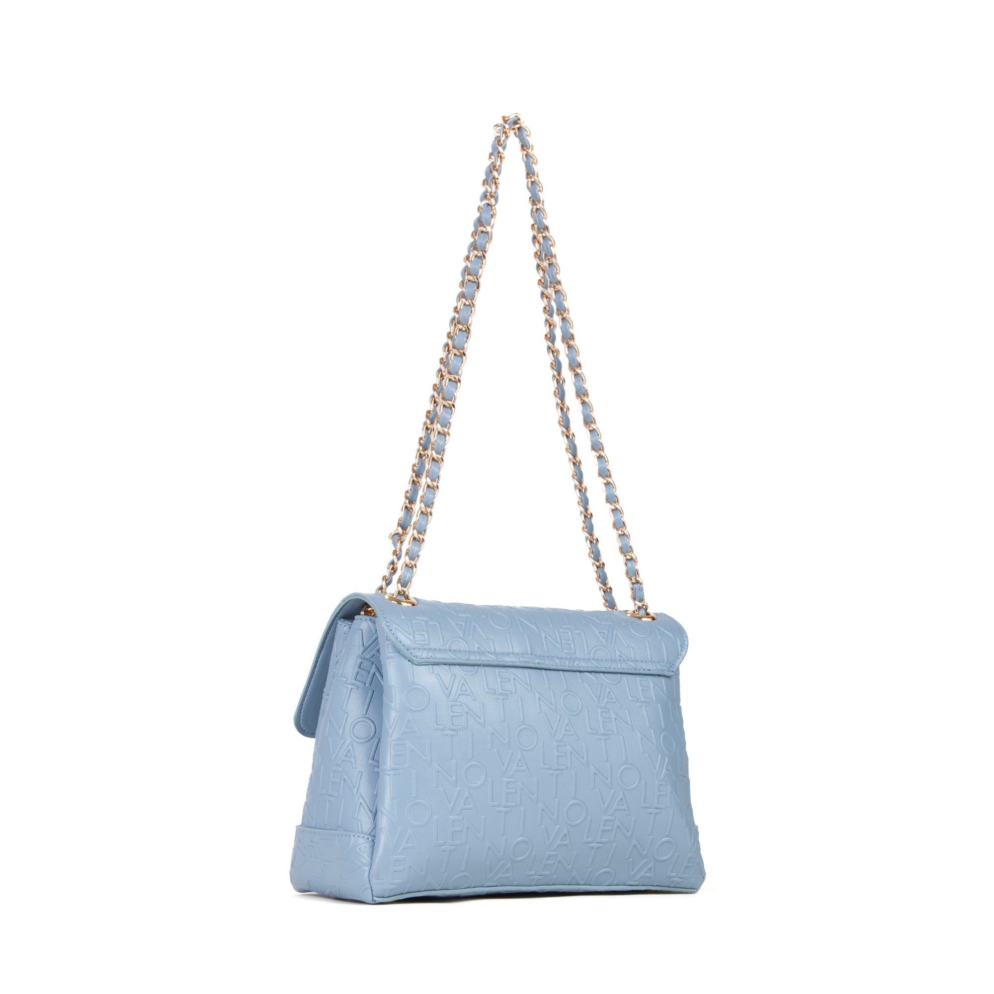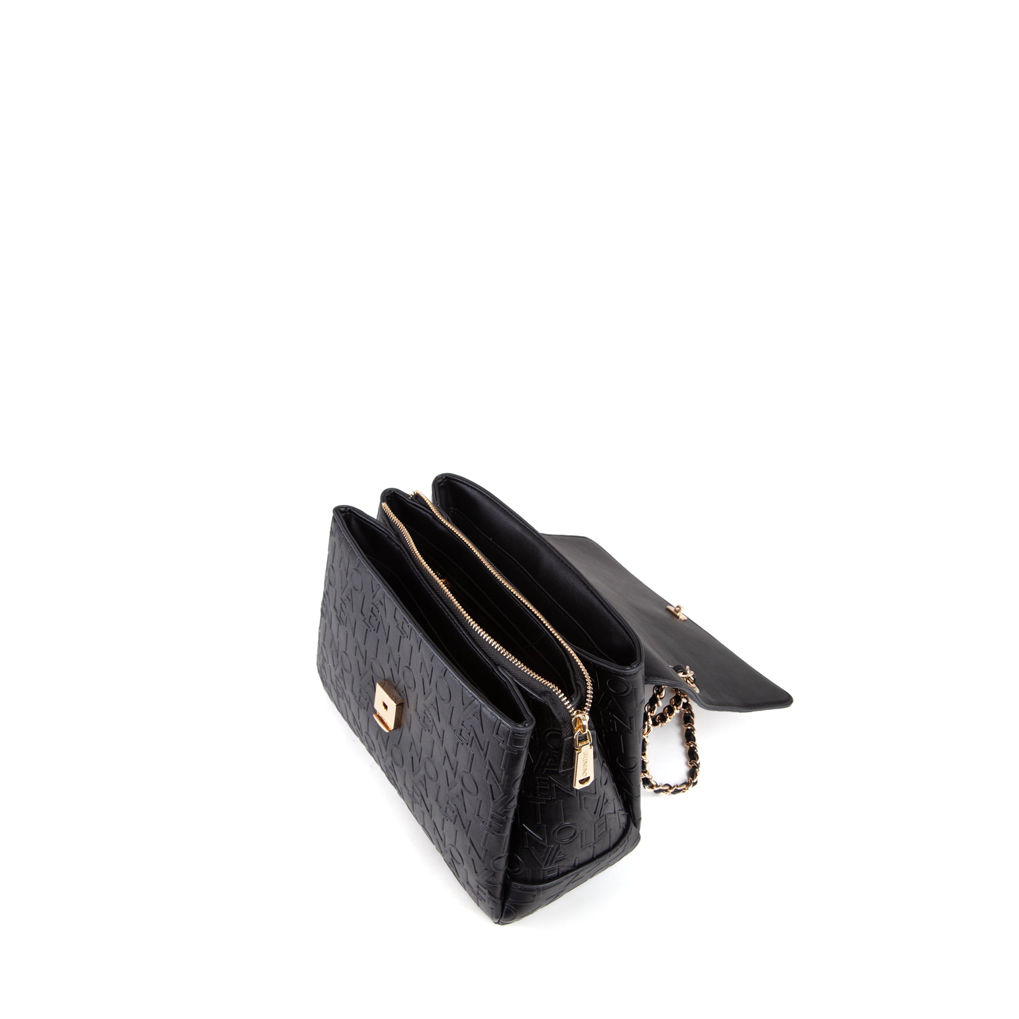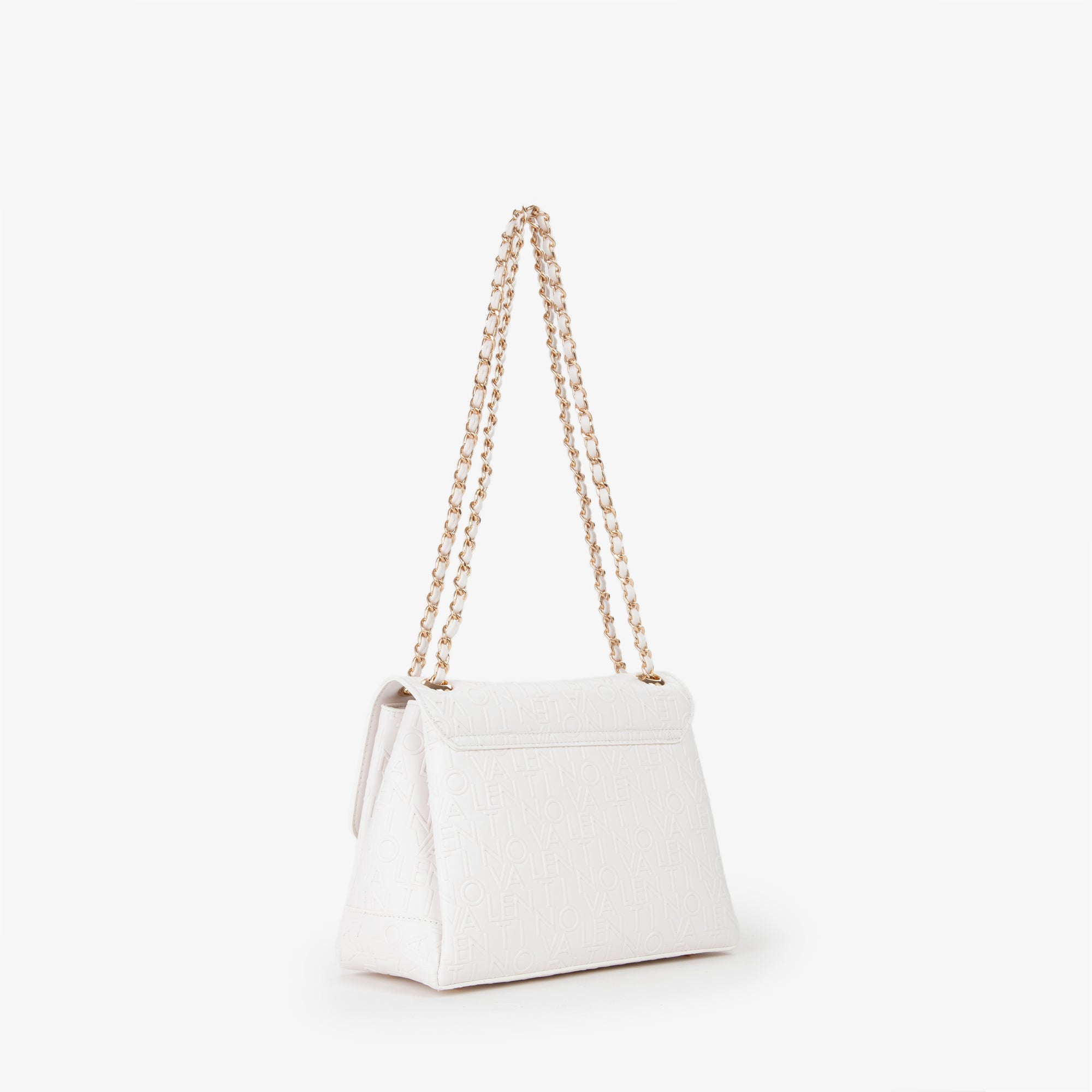 tracolla in nappa morbida logata con artwork allover rised up. Tracolla regolabile in catena infilata. Personalizzazione con letteremetalliche su patta.