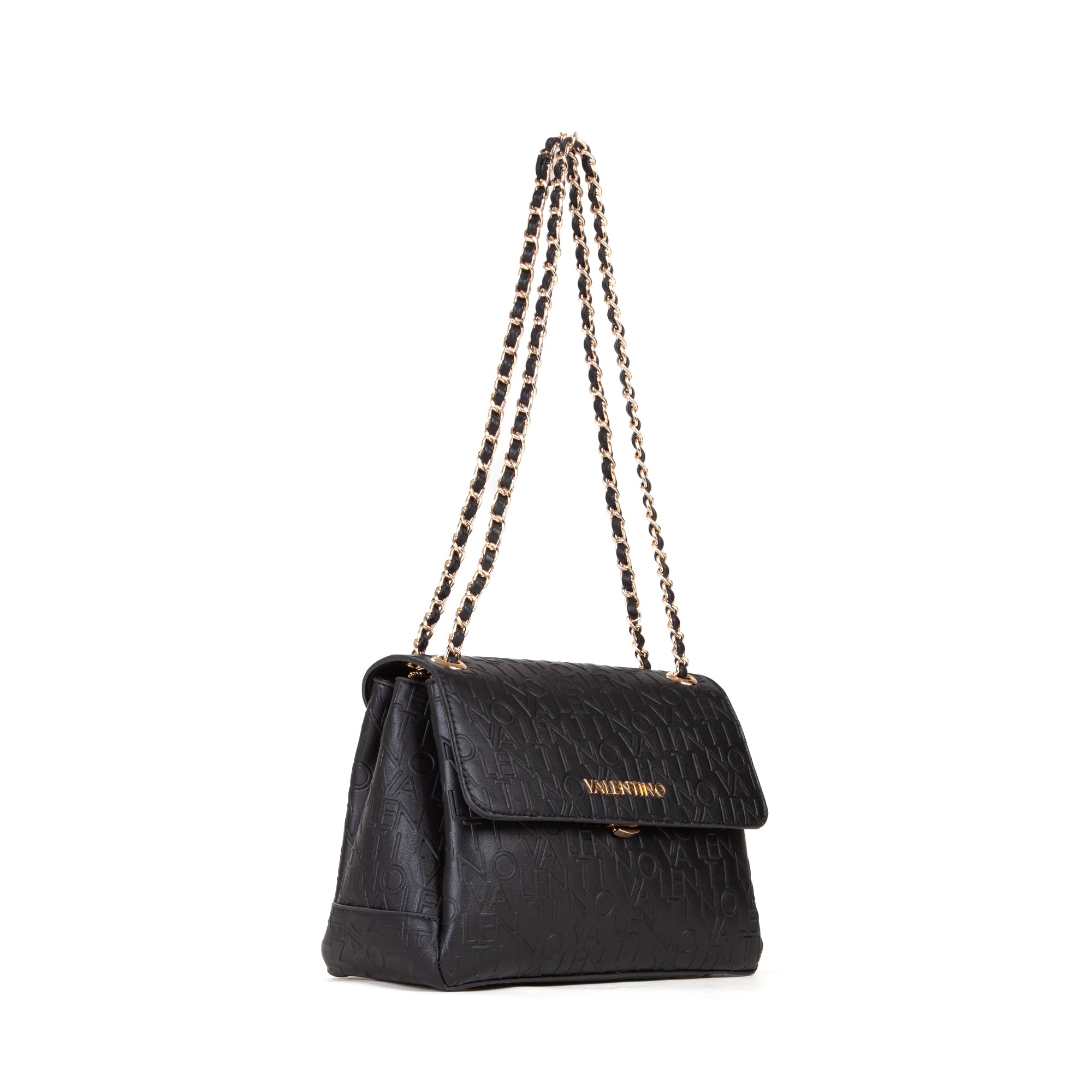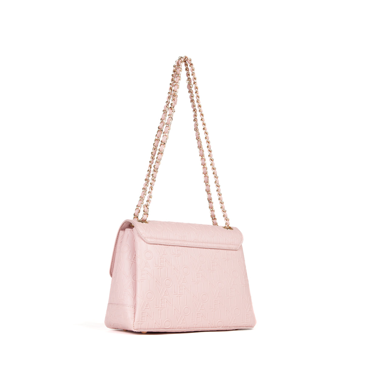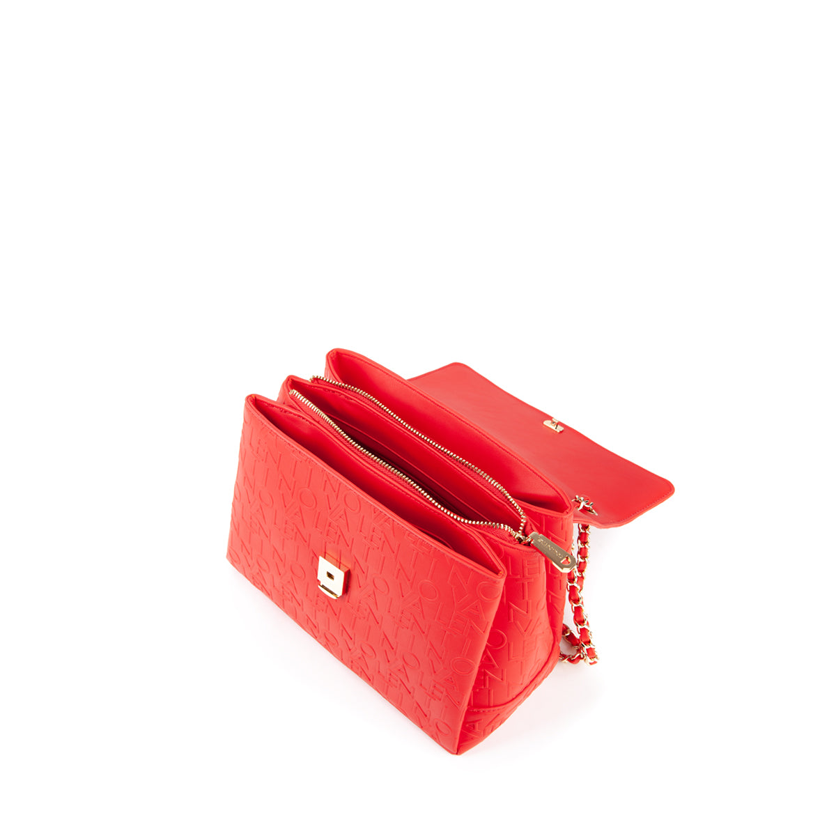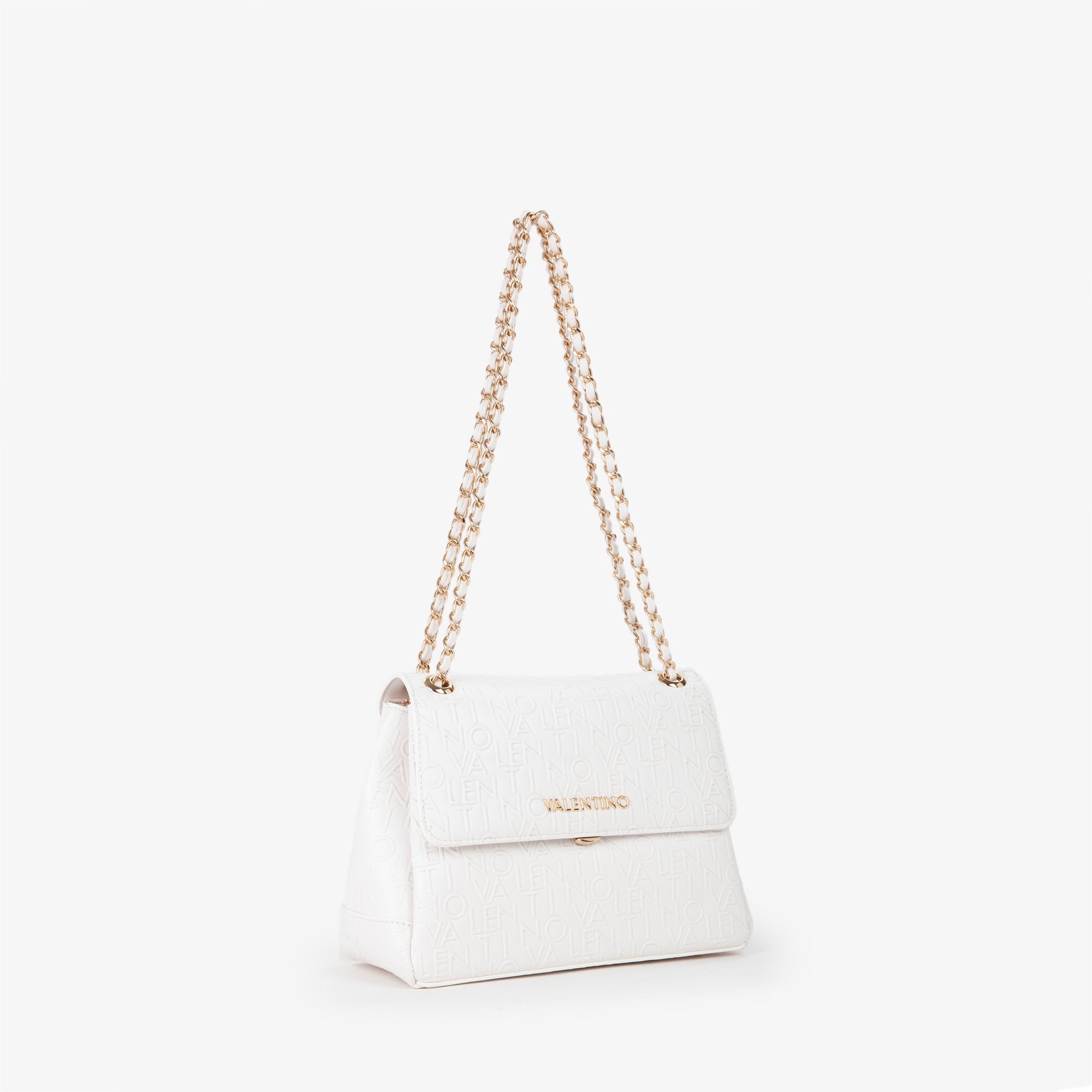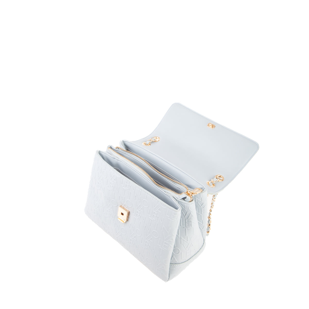 tracolla in nappa morbida logata con artwork allover rised up. Tracolla regolabile in catena infilata. Personalizzazione con letteremetalliche su patta.