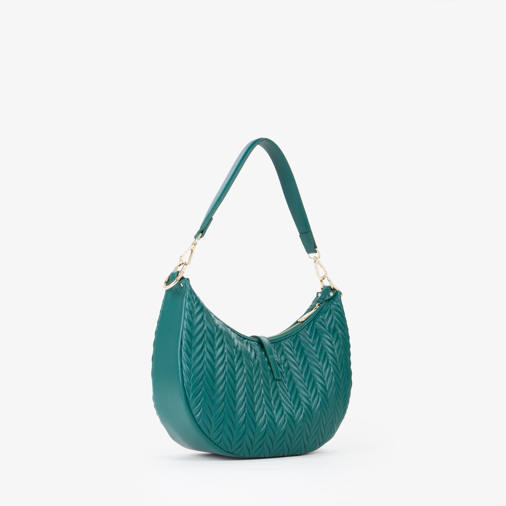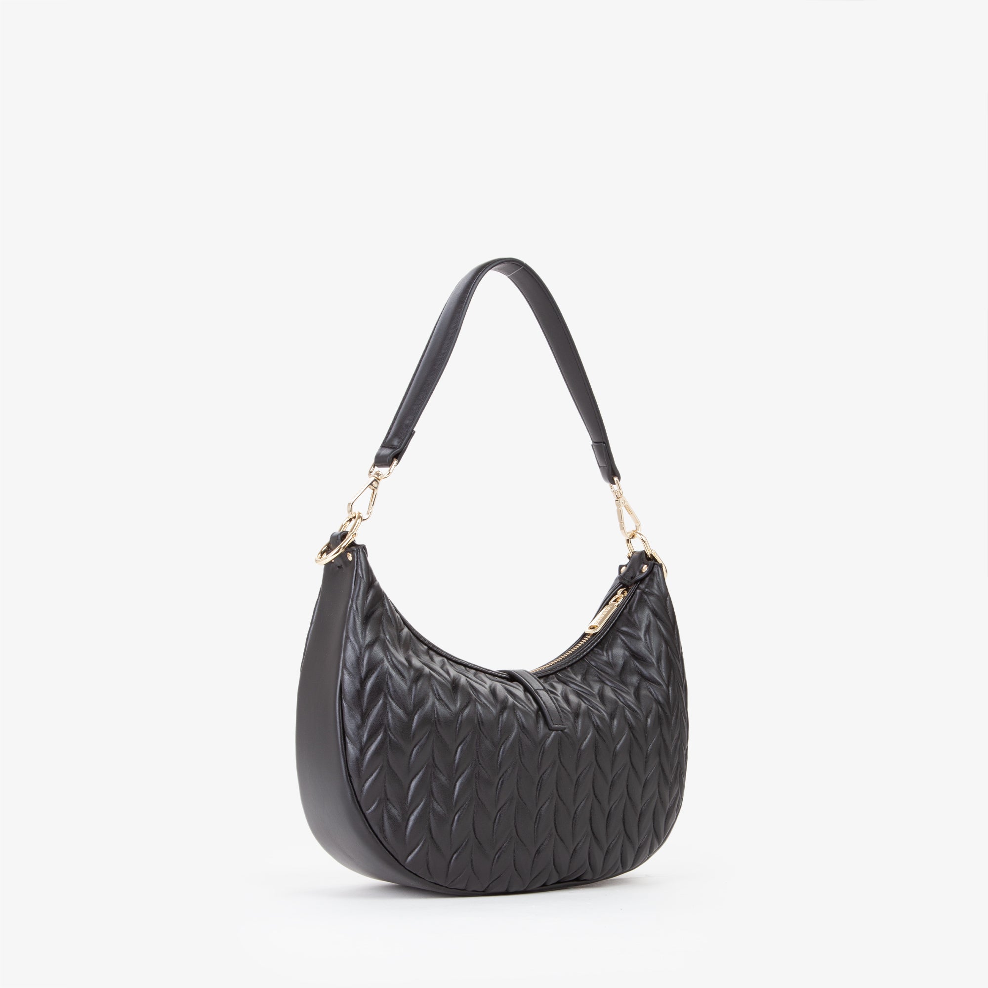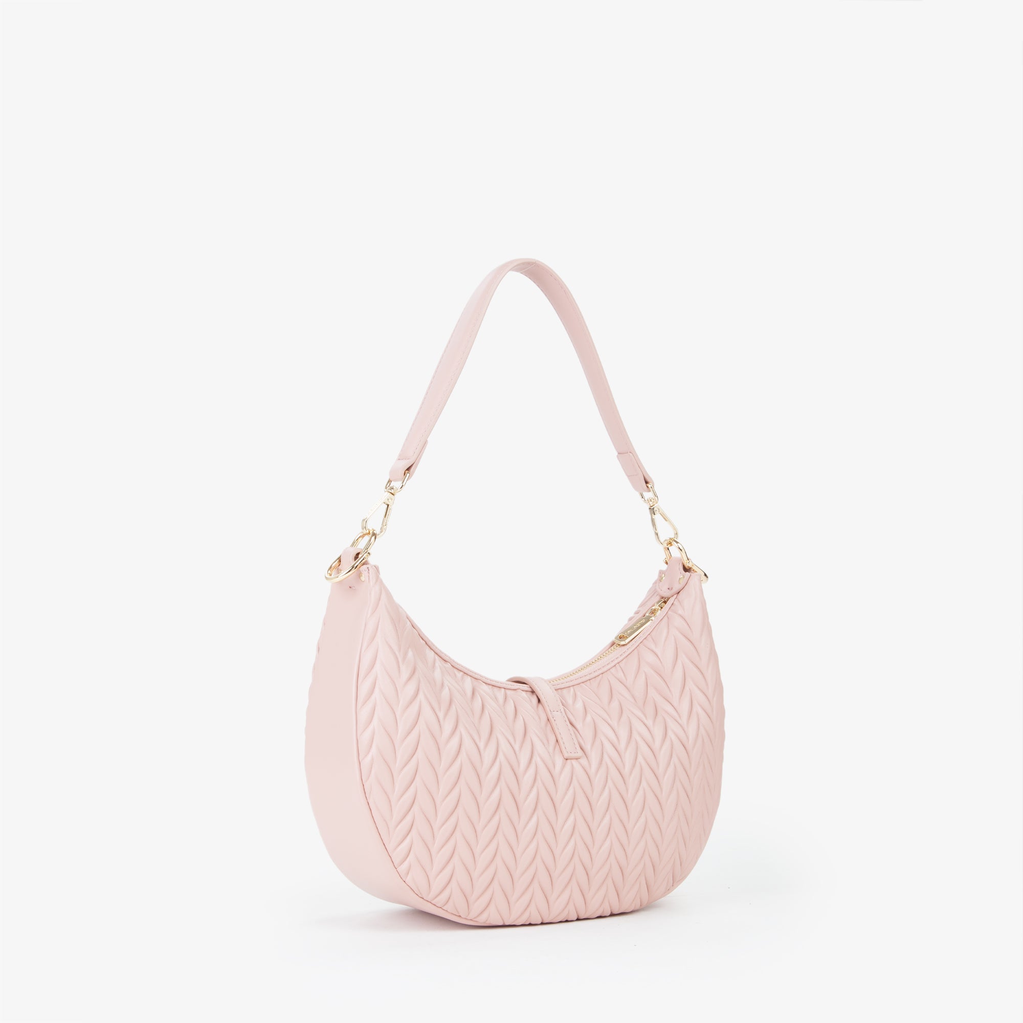 Sacca dalla finitura goffrata, con logo di metallo, dorato, che si poggia sul davanti in verticale.