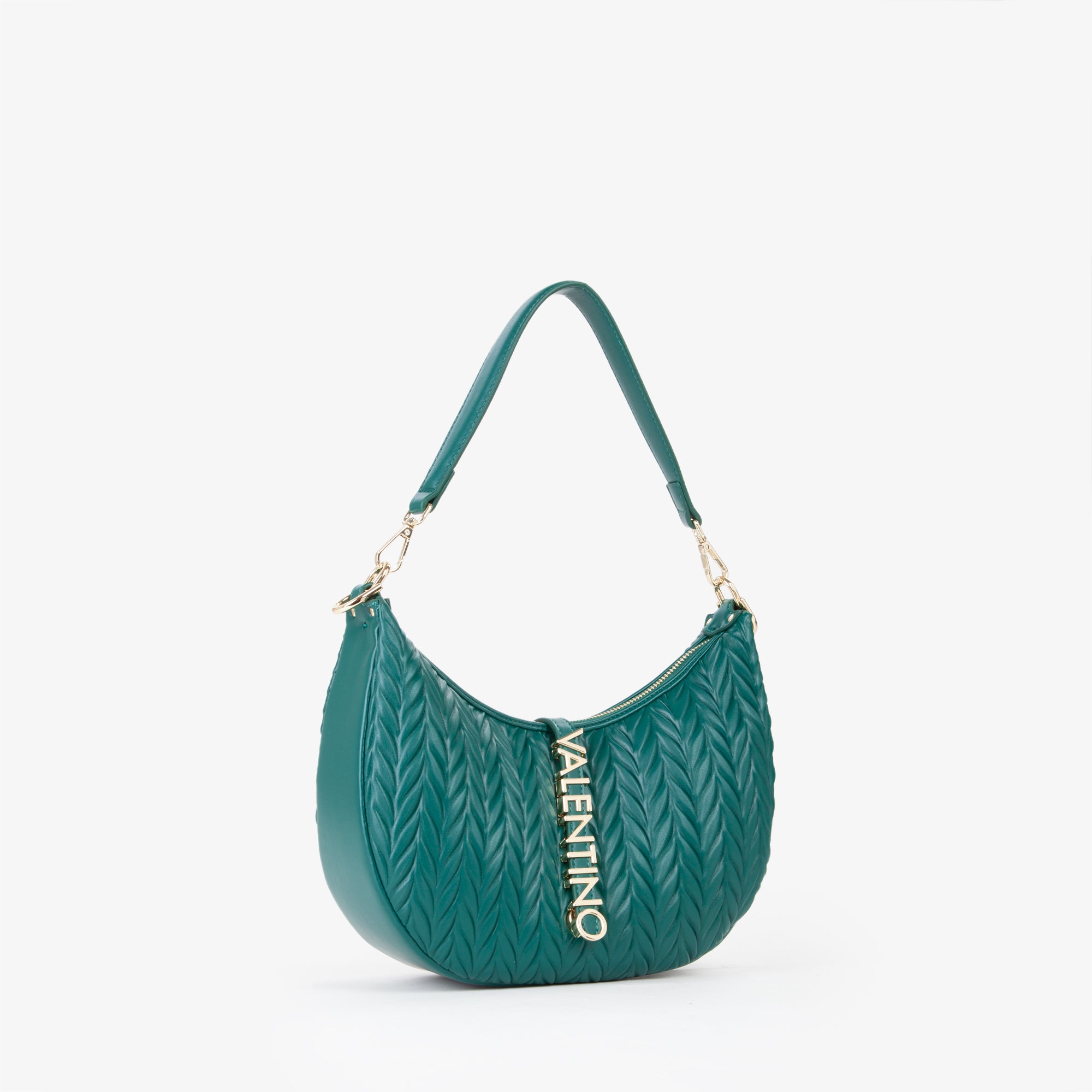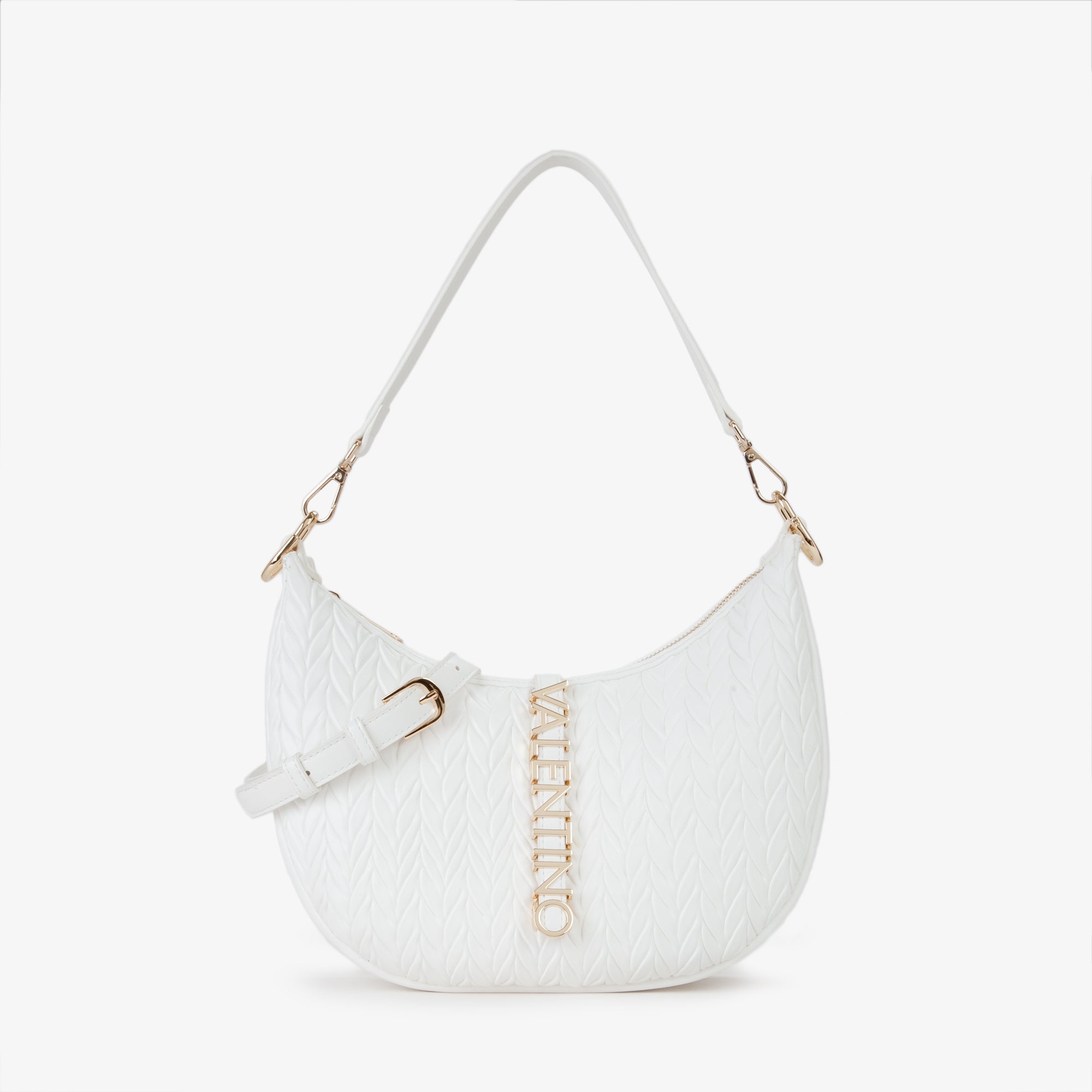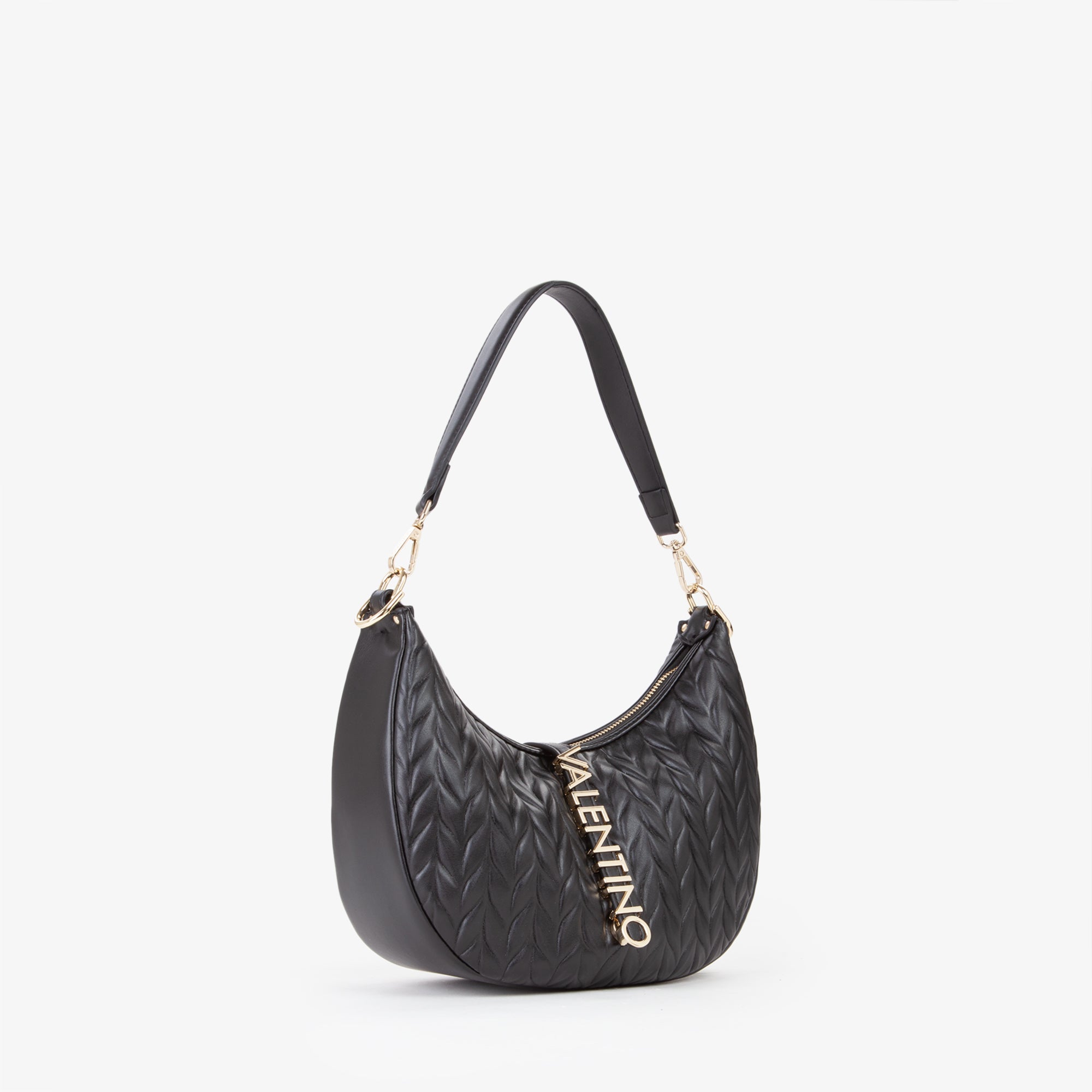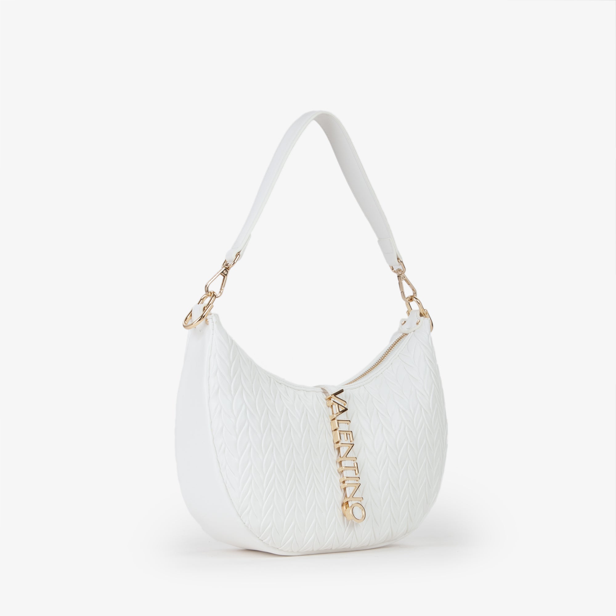 Sacca dalla finitura goffrata, con logo di metallo, dorato, che si poggia sul davanti in verticale.