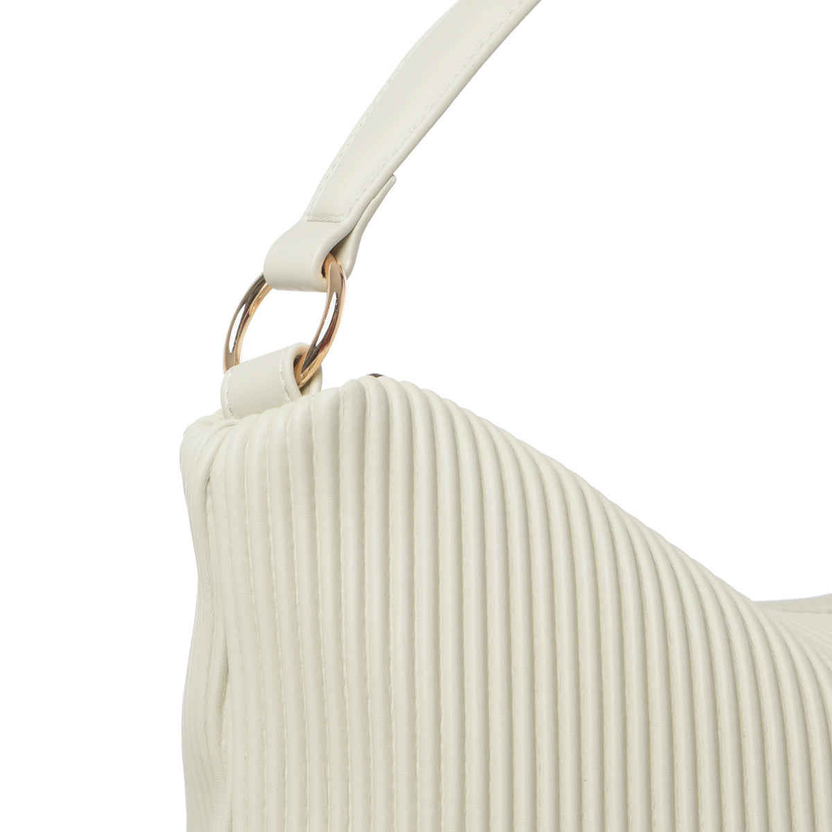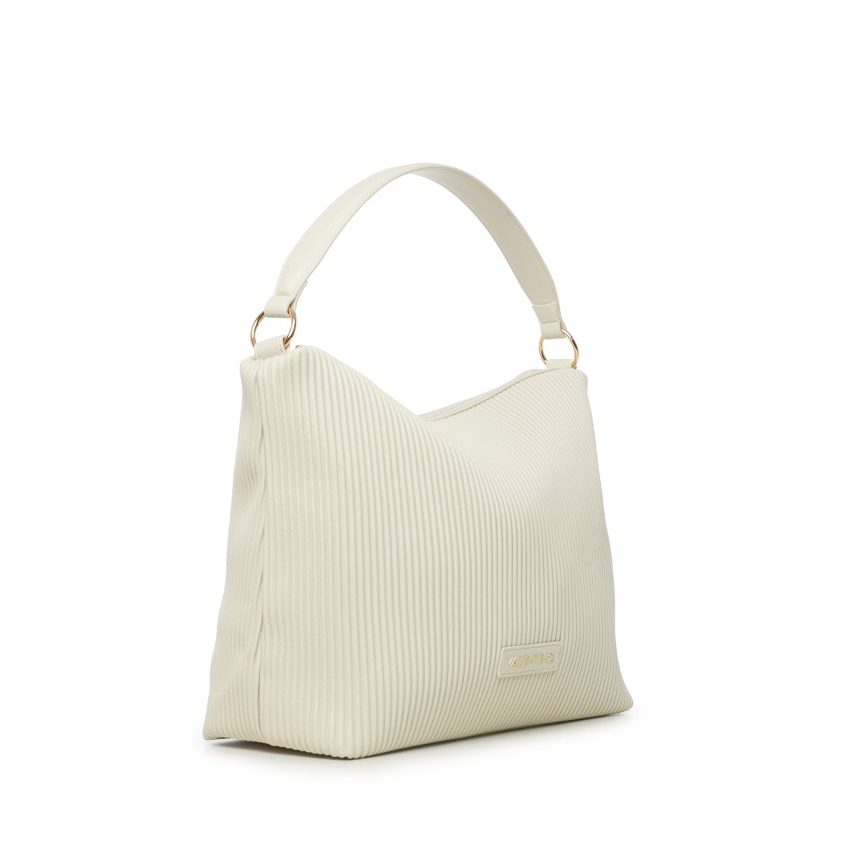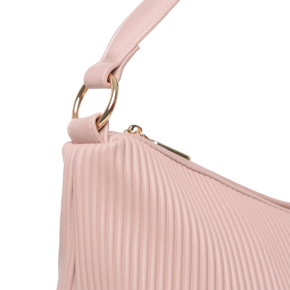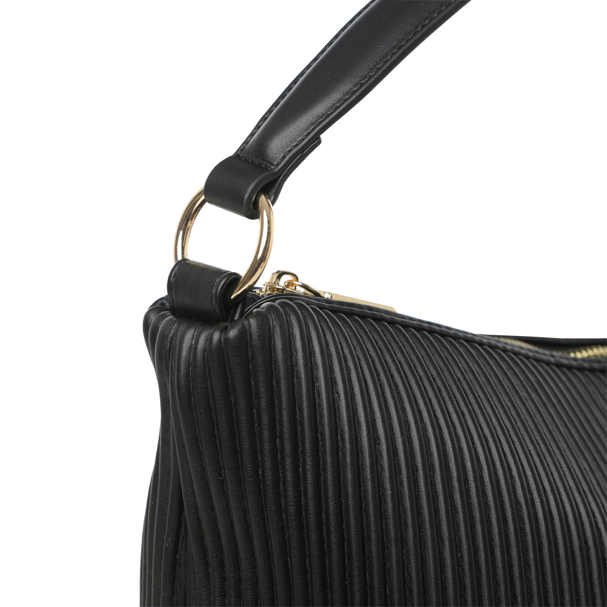 sottospalla in morbido plissé con riporti in nappa in tono. Chiusura con zip, tracolla extra regolabile e personalizzazione con lettere metalliche su patch.