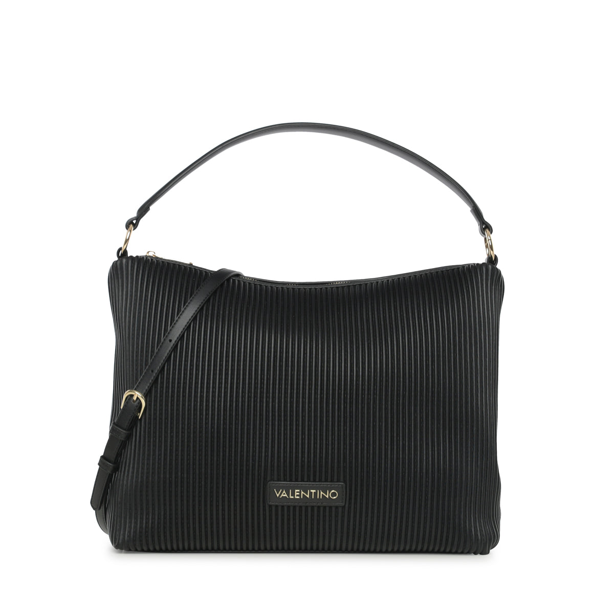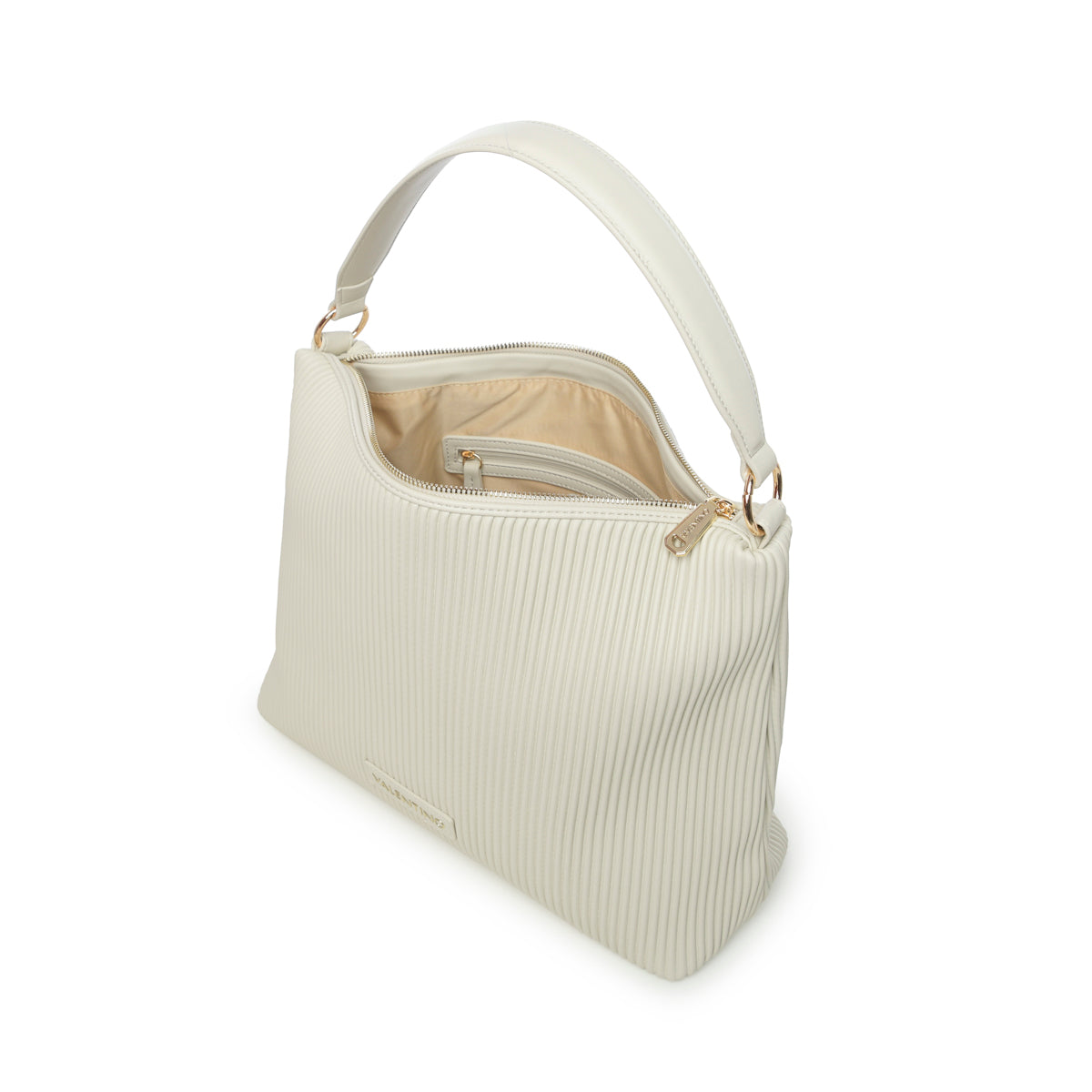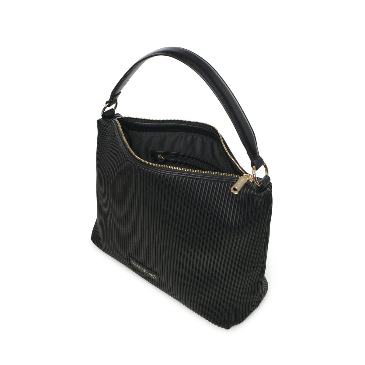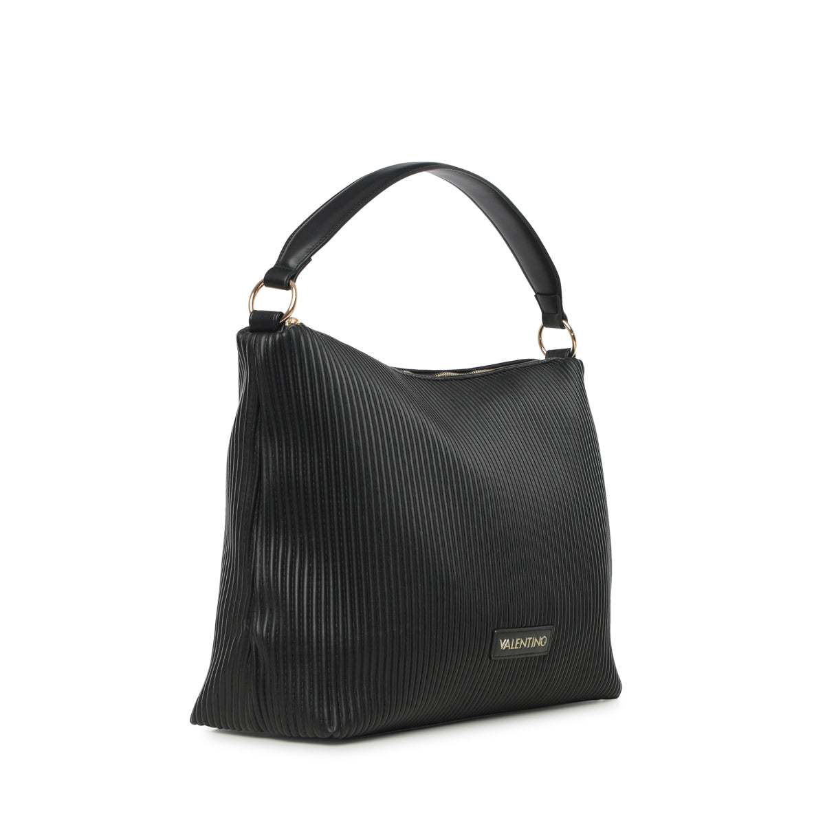 sottospalla in morbido plissé con riporti in nappa in tono. Chiusura con zip, tracolla extra regolabile e personalizzazione con lettere metalliche su patch.