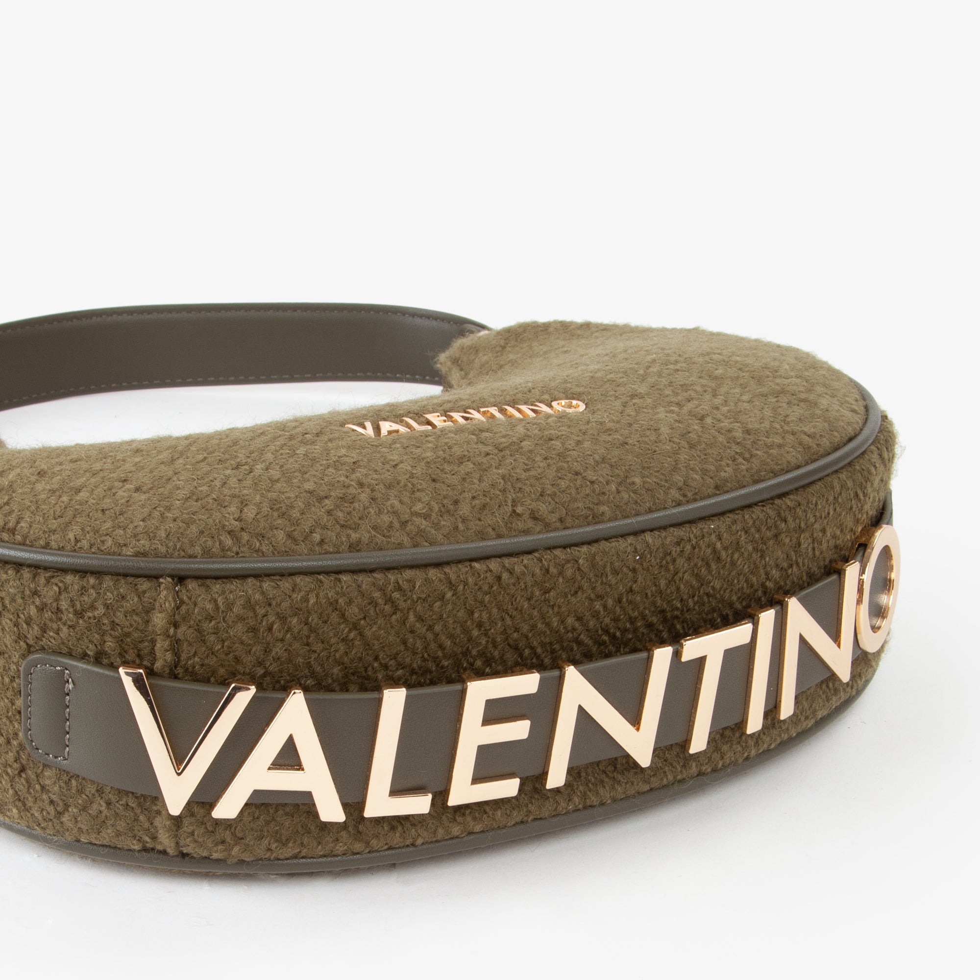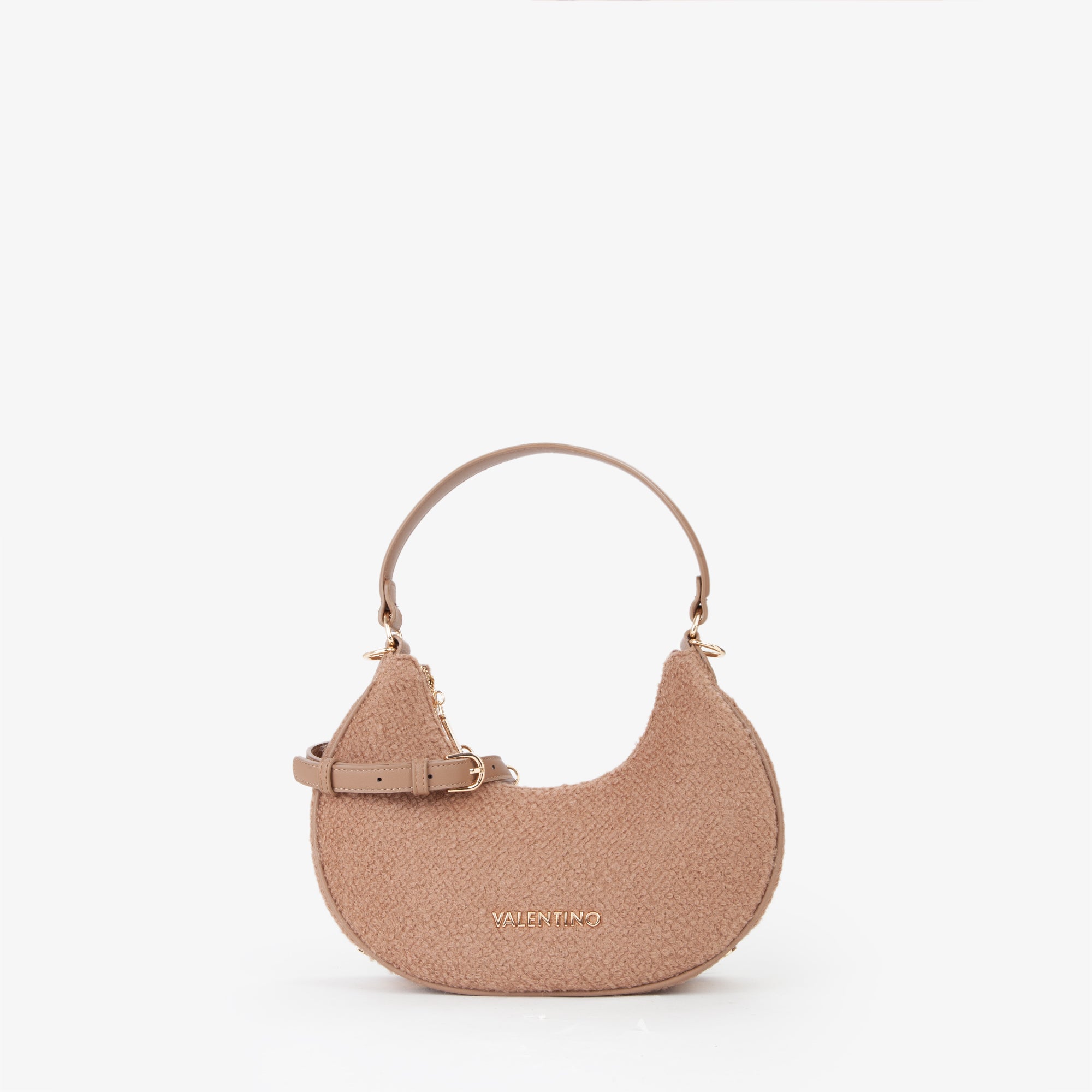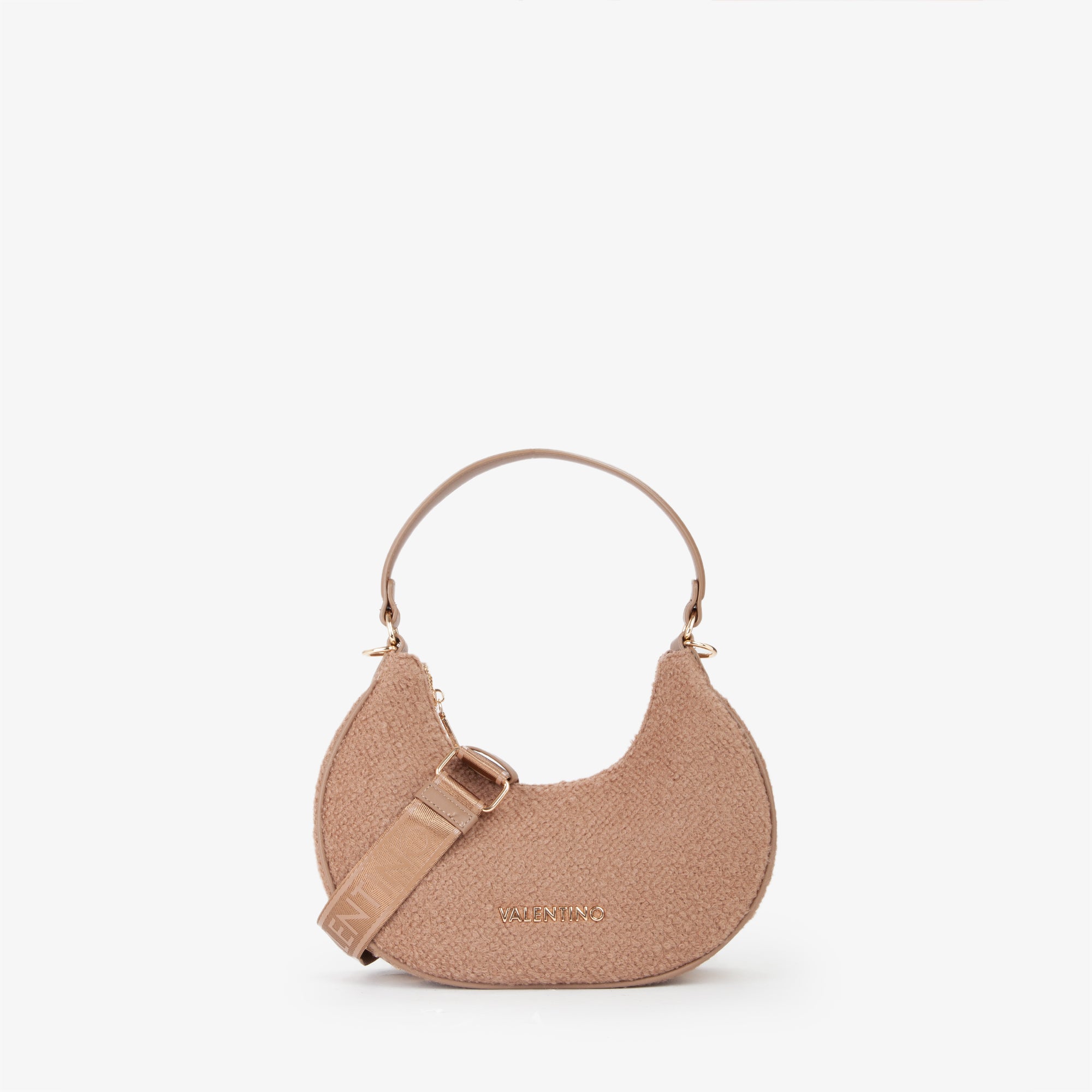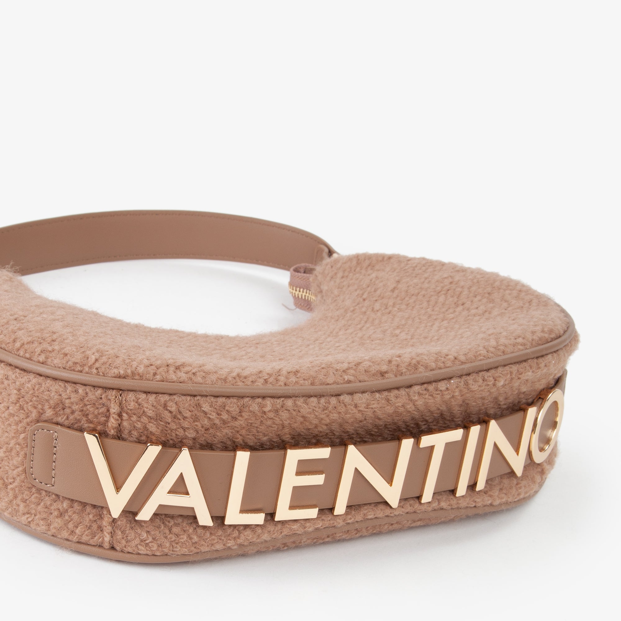 Sacca dalle forme fashion, con logo di metallo sul davanti e logo in lettere di metallo, di dimensioni maggiori, sul fondo.