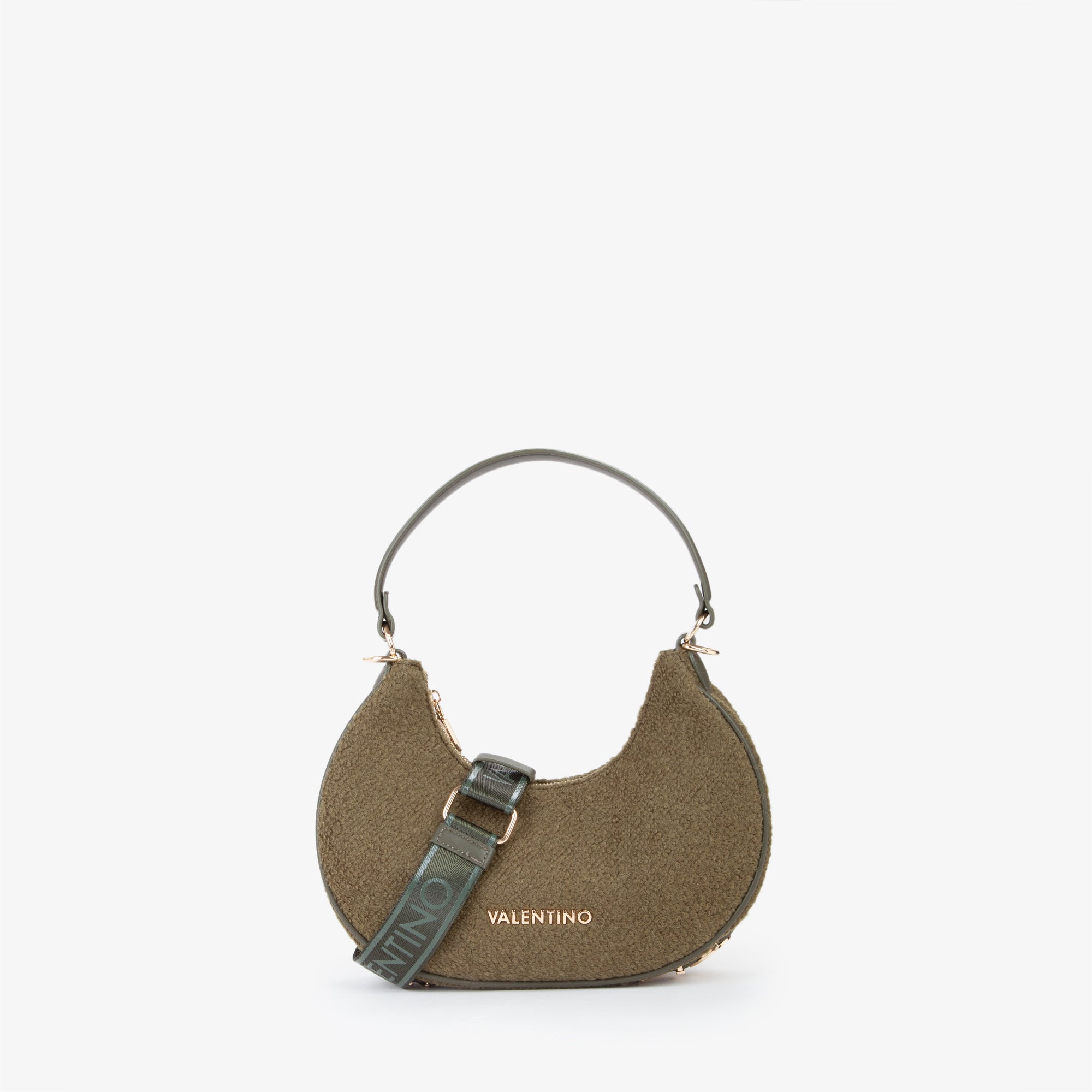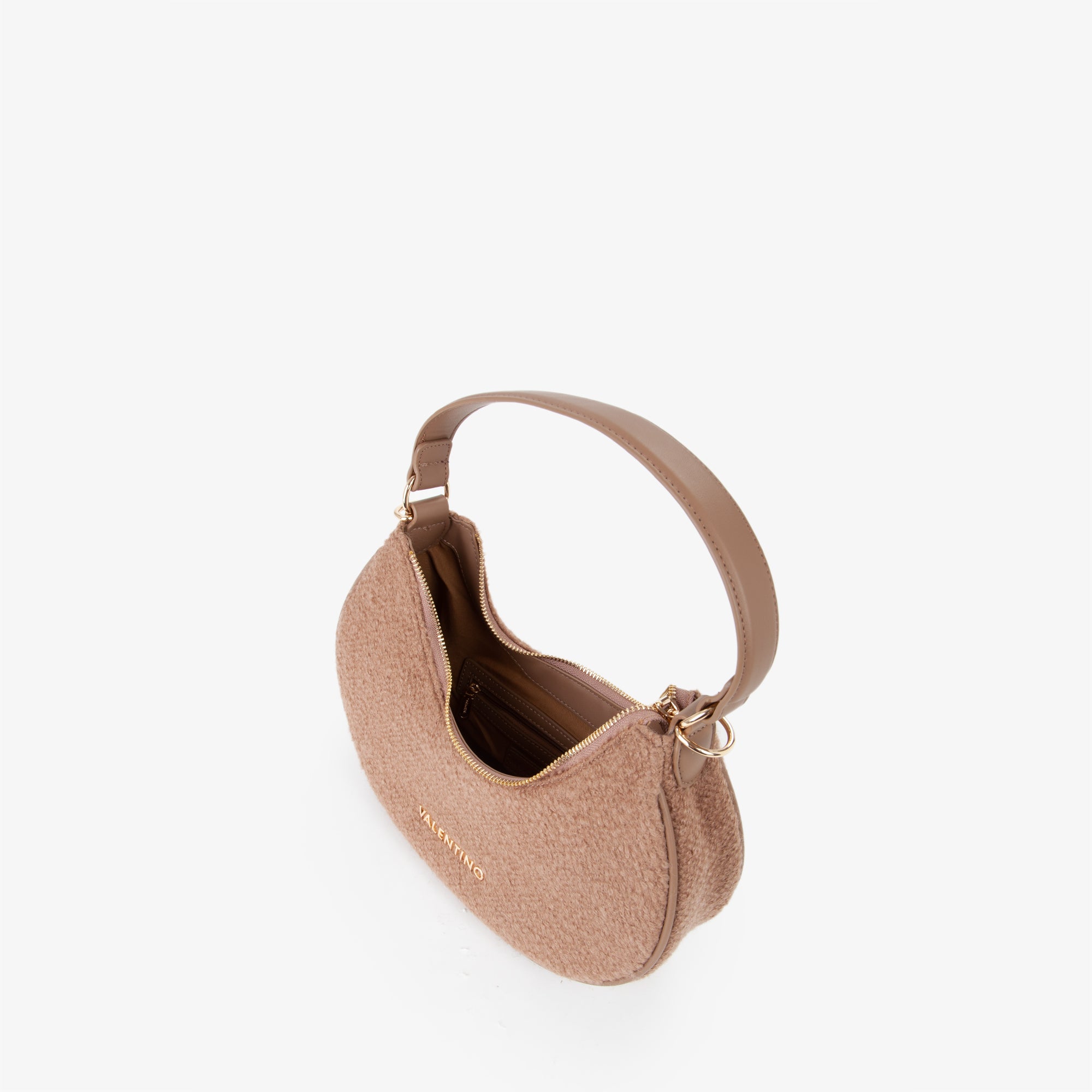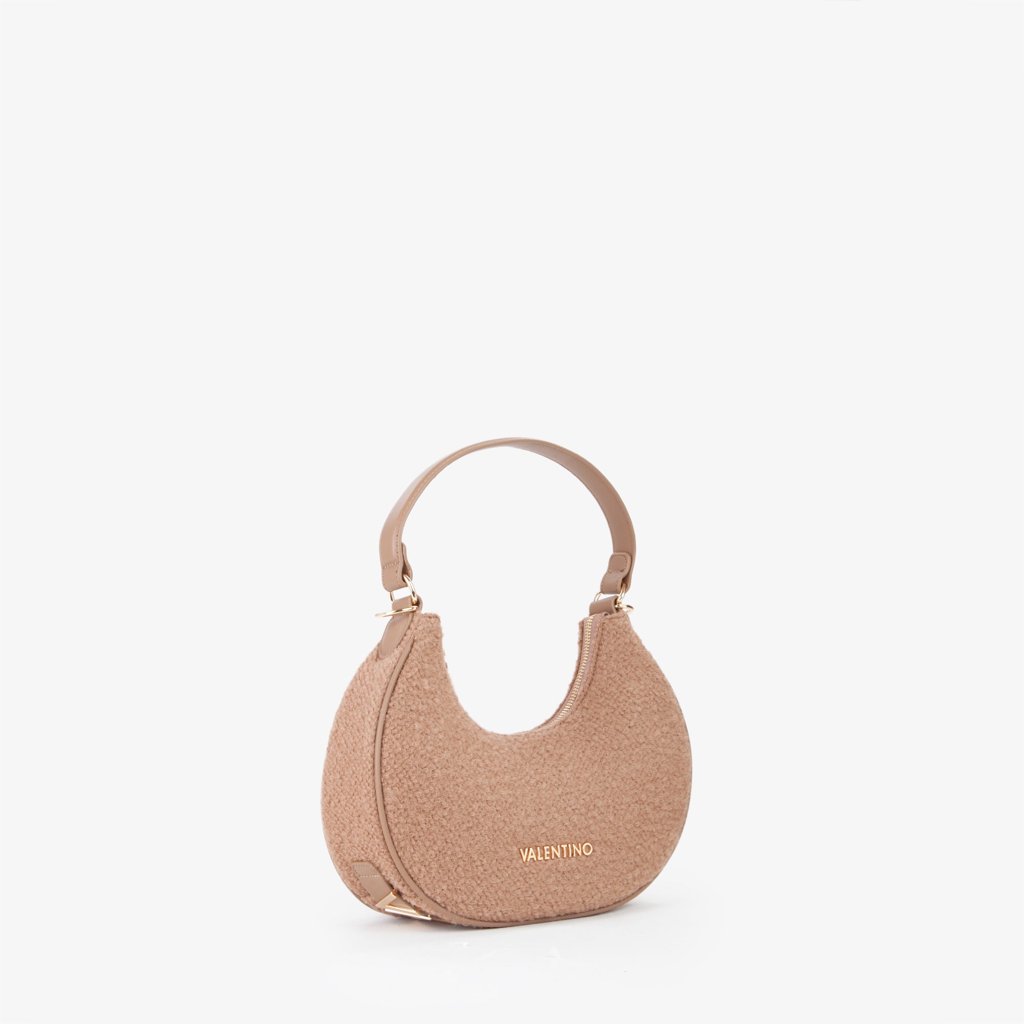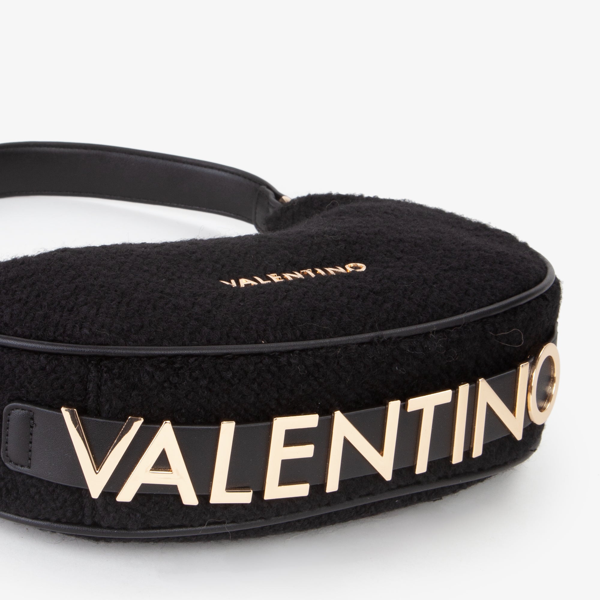 Sacca dalle forme fashion, con logo di metallo sul davanti e logo in lettere di metallo, di dimensioni maggiori, sul fondo.