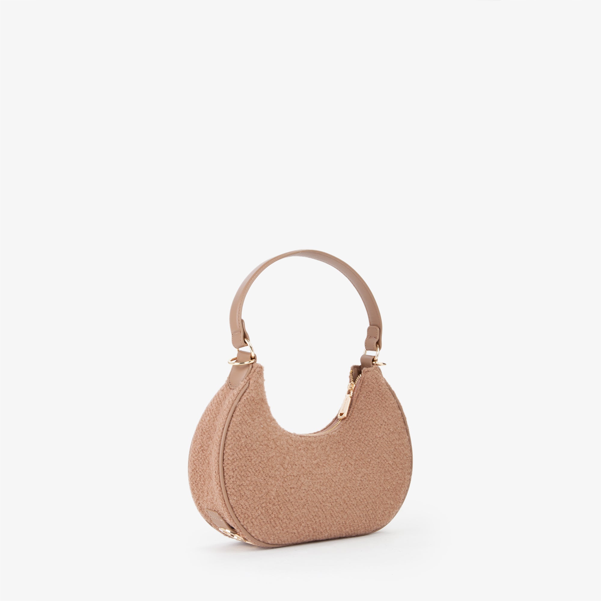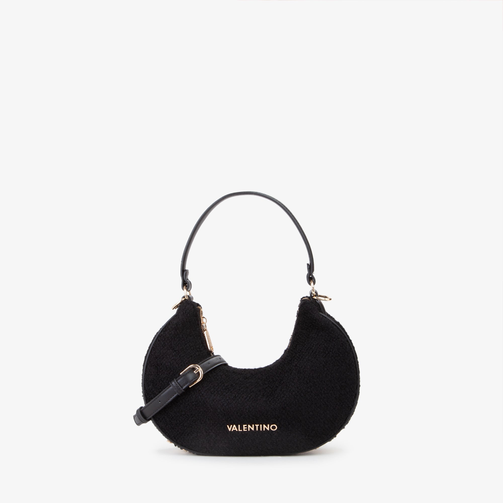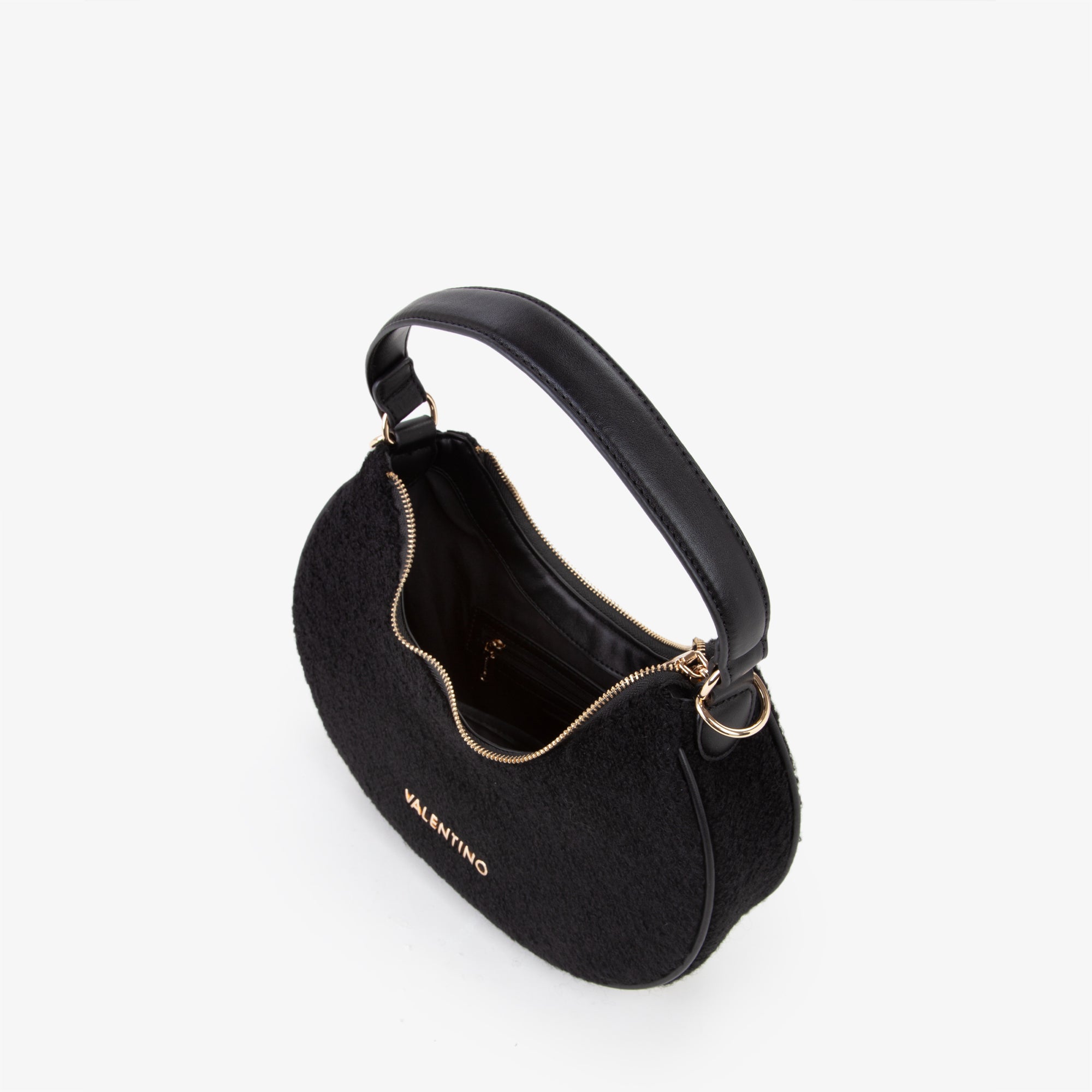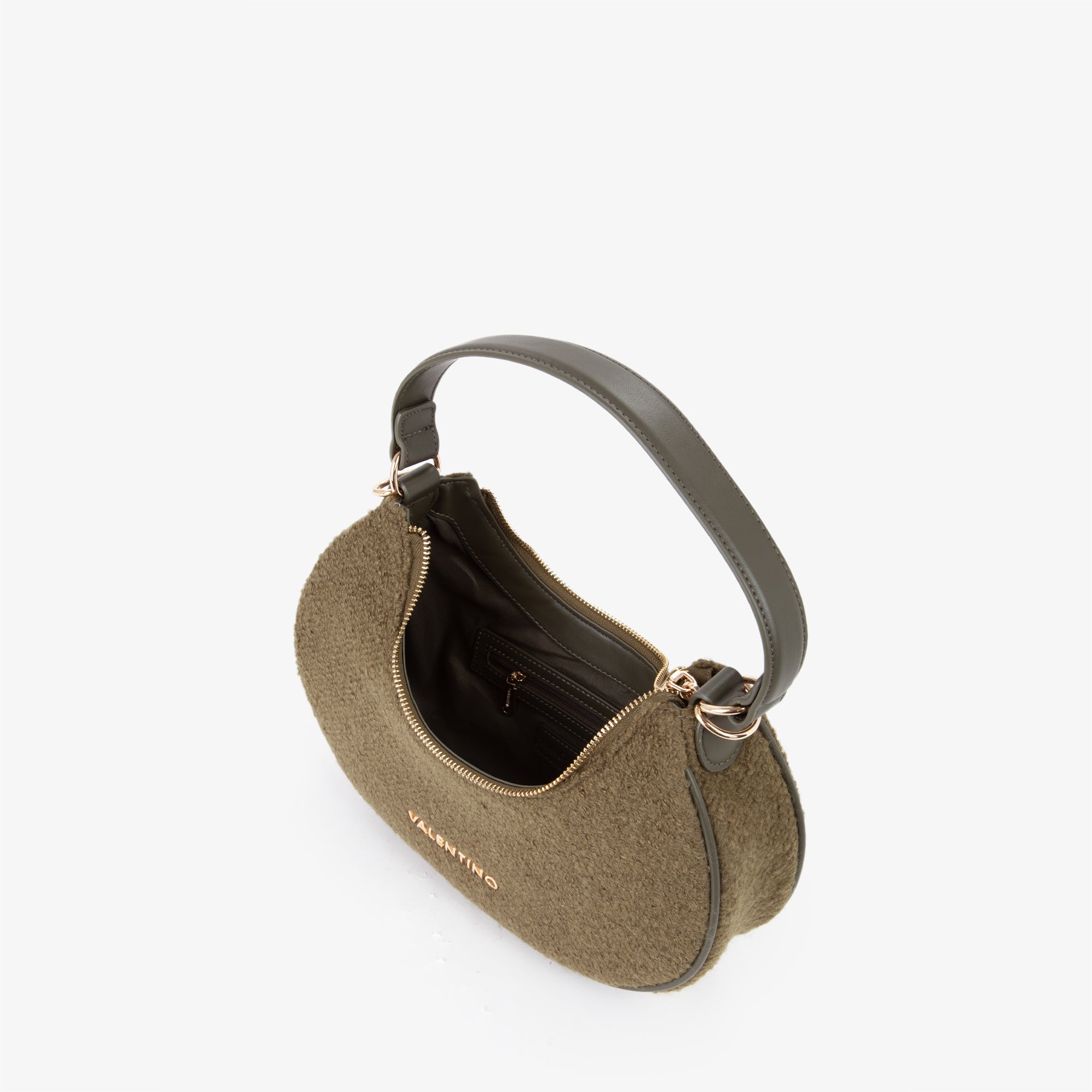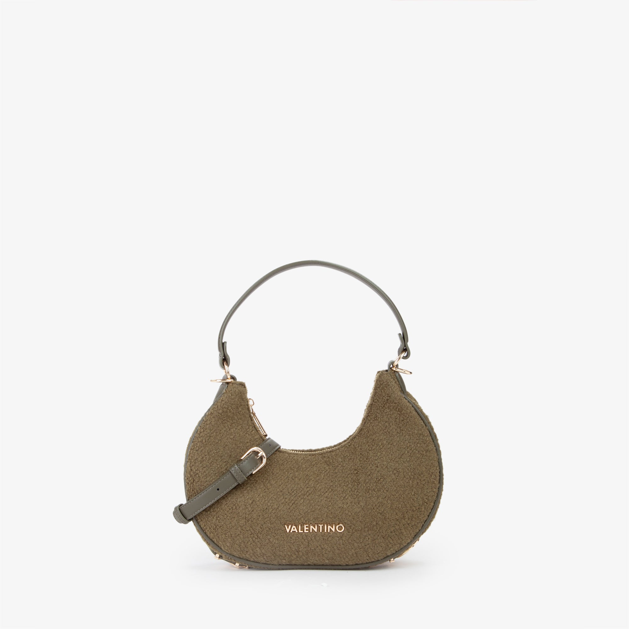Sacca dalle forme fashion, con logo di metallo sul davanti e logo in lettere di metallo, di dimensioni maggiori, sul fondo.