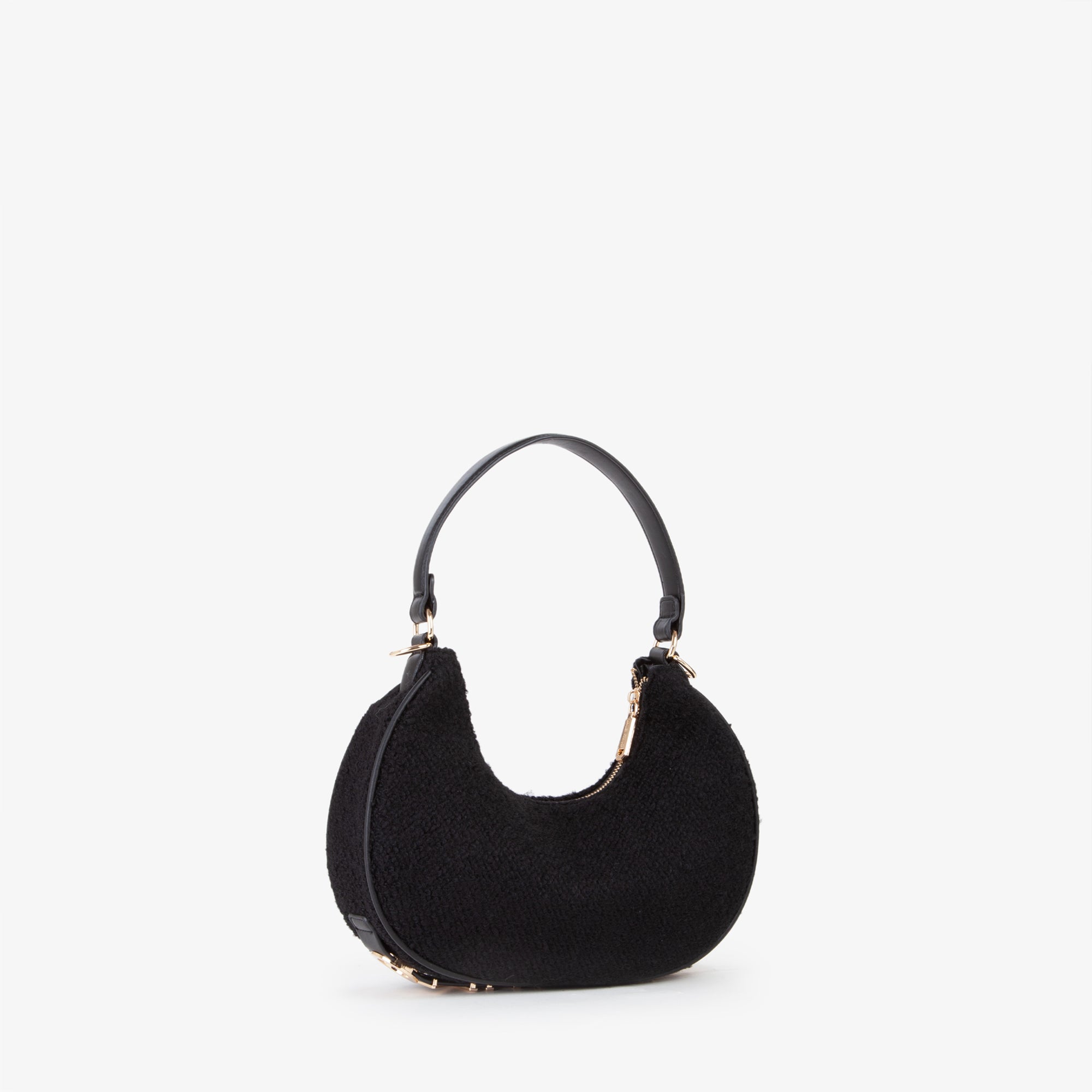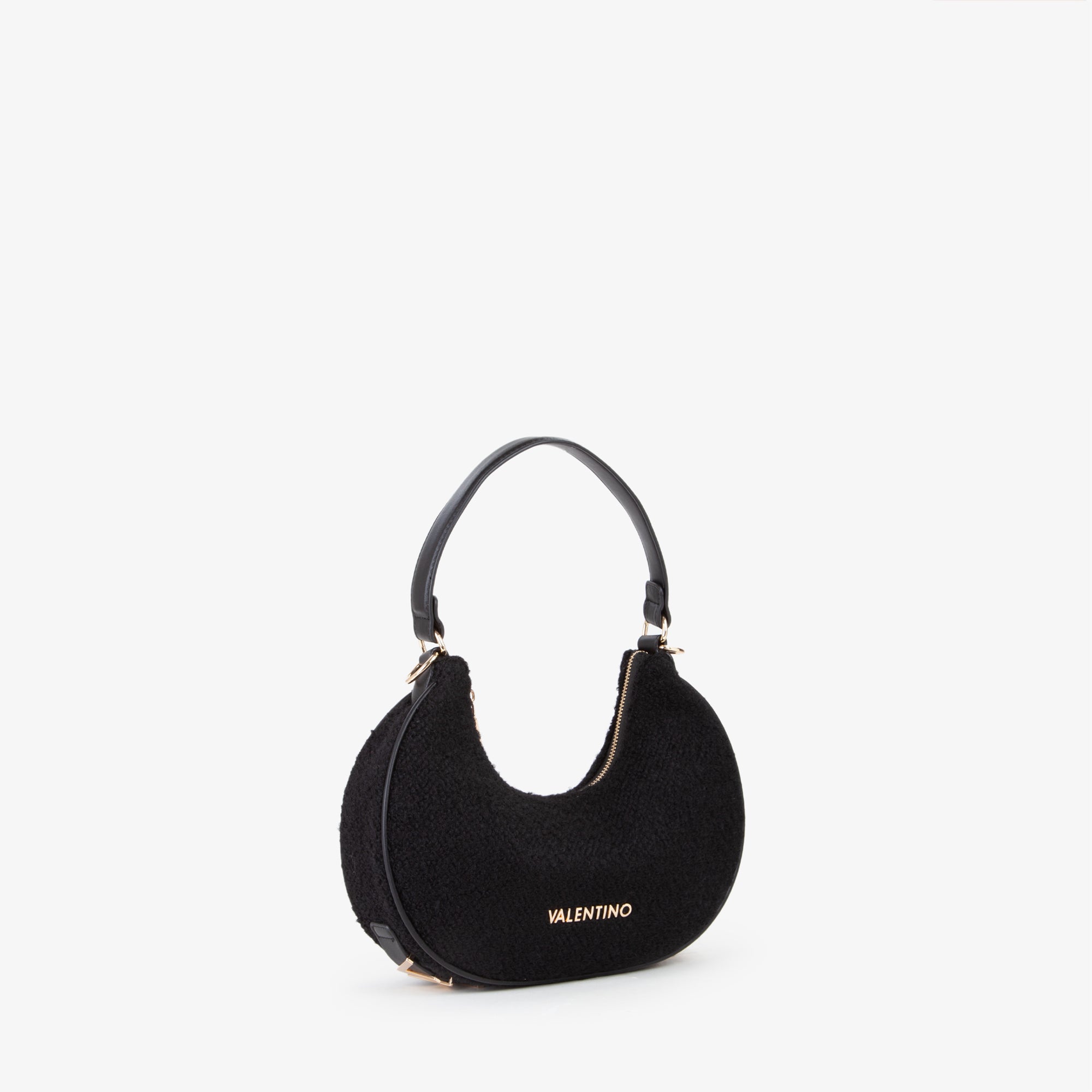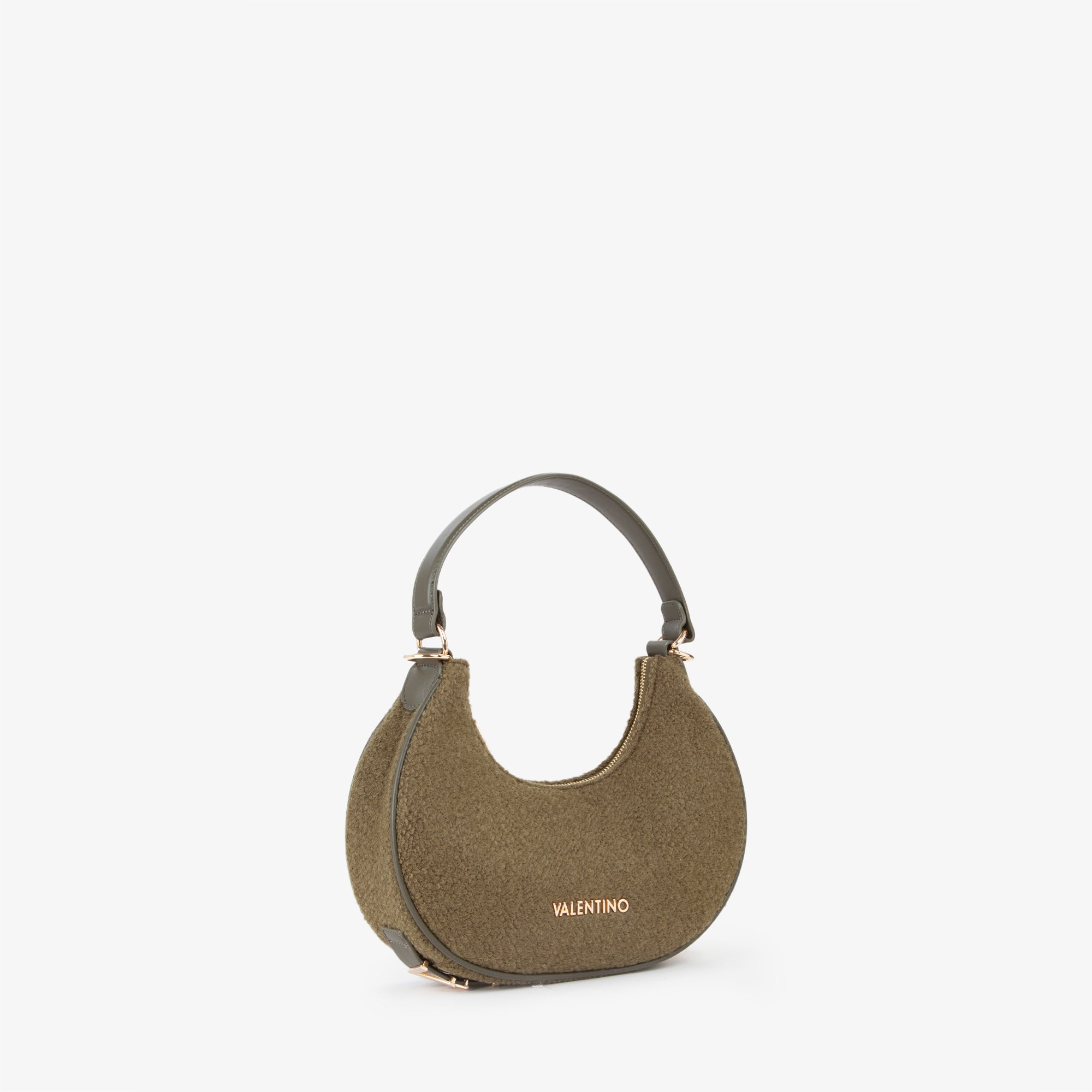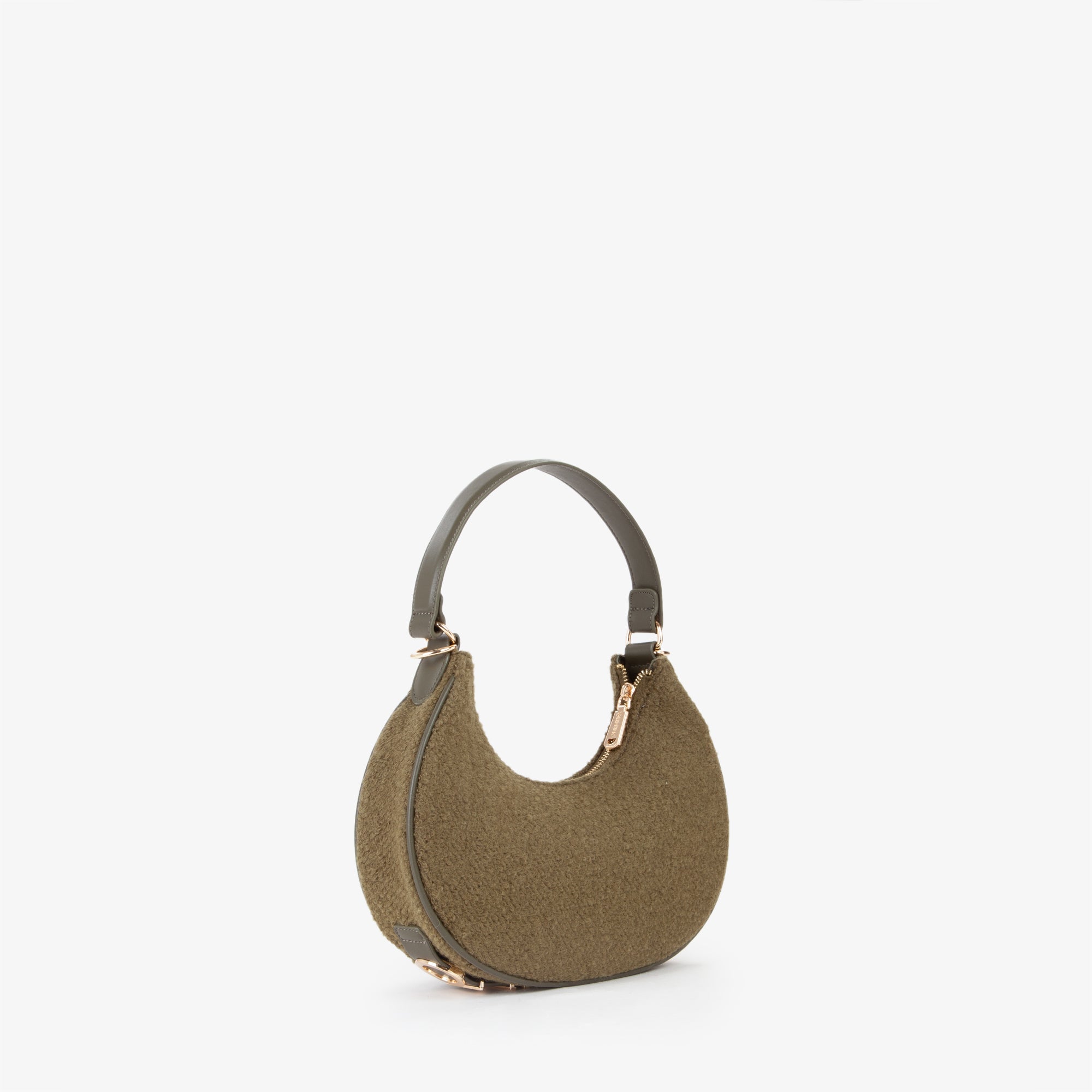 Sacca dalle forme fashion, con logo di metallo sul davanti e logo in lettere di metallo, di dimensioni maggiori, sul fondo.