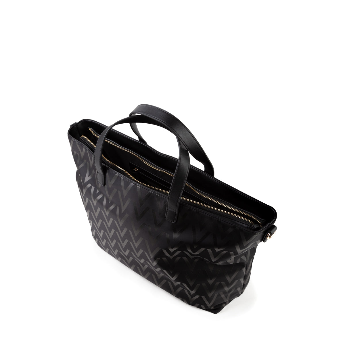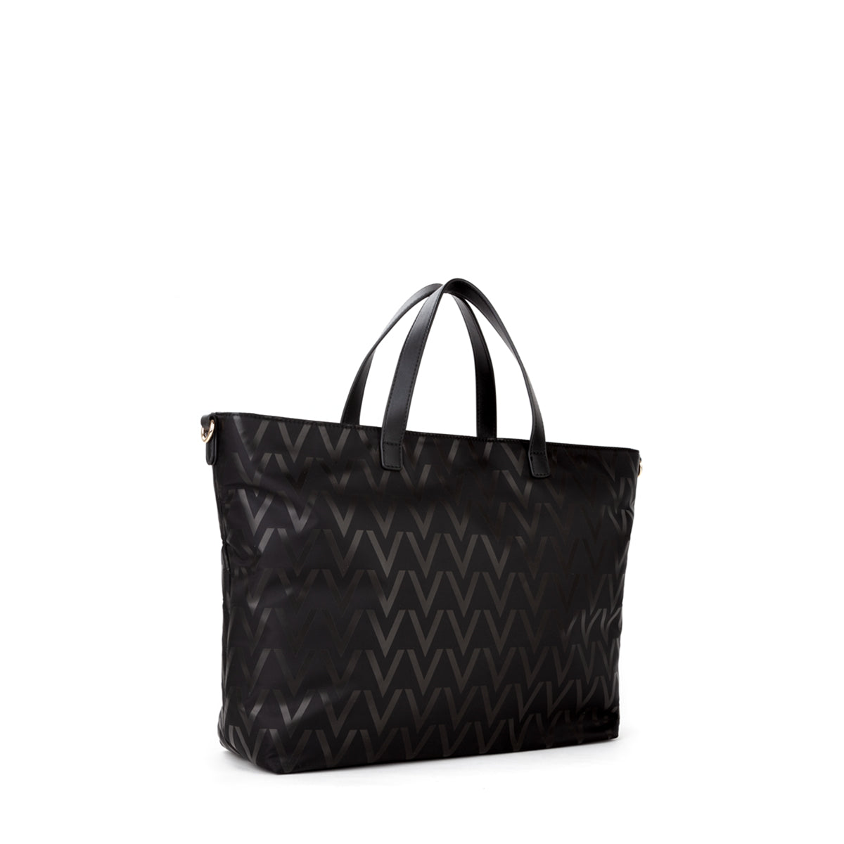 Shopping morbida a mano con tracolla estraibile, in nylon riciclato con stampa all over e maxi V in tono. dettagli in nappa riciclata in tono.