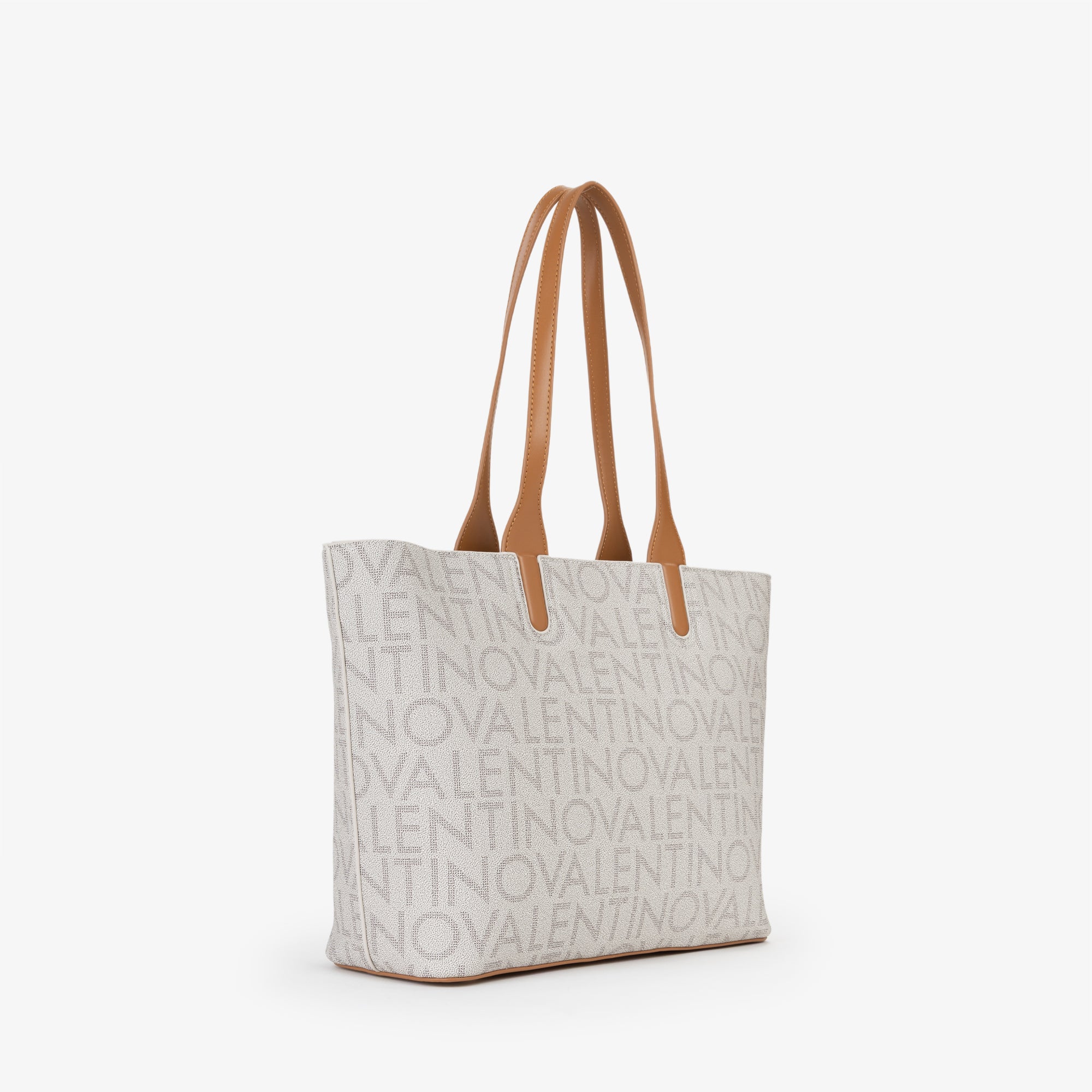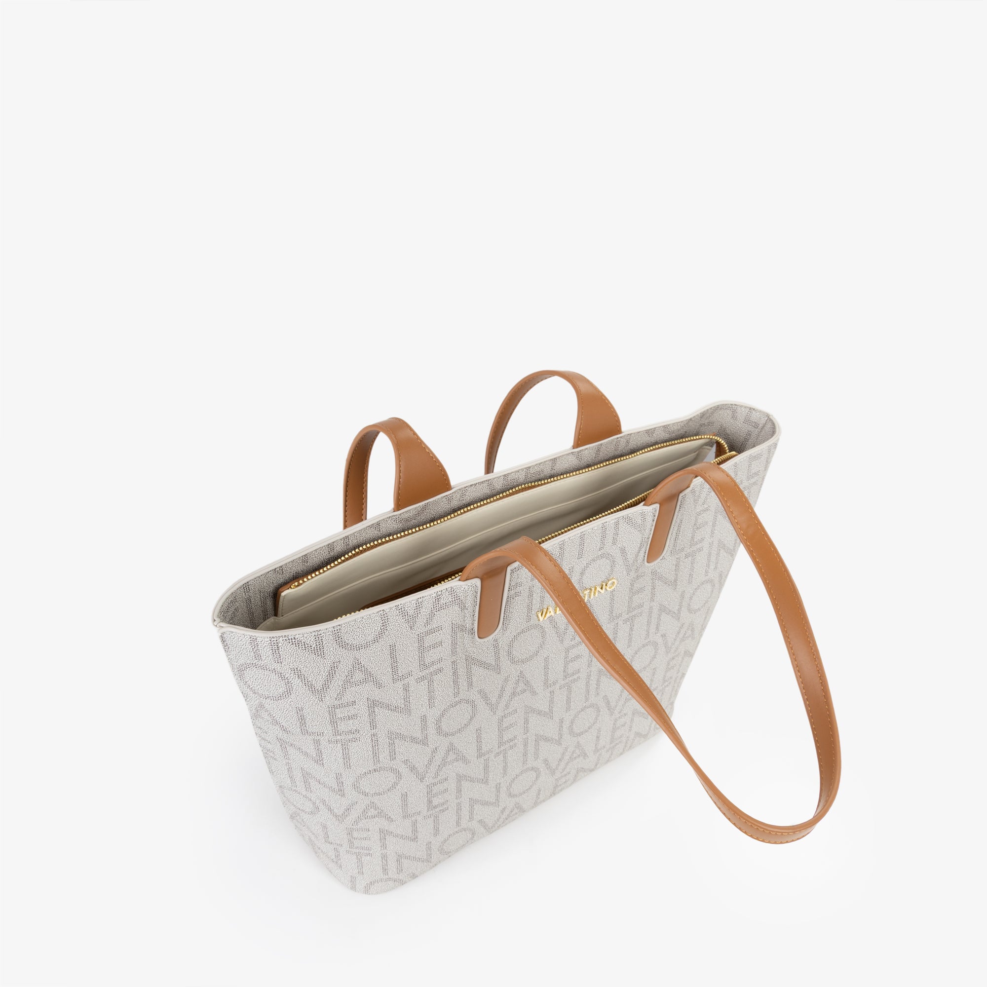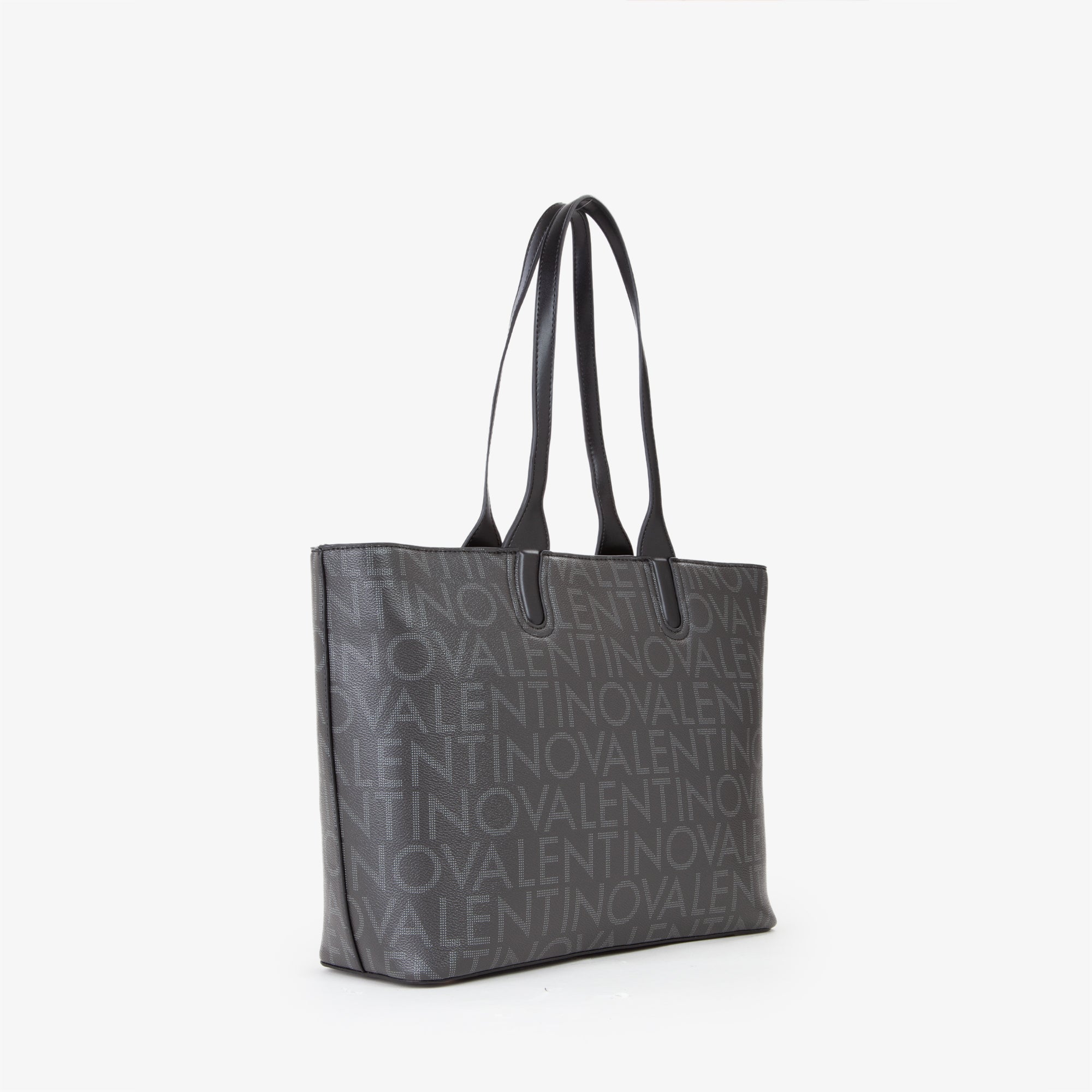 Borsa con stampa all over logato su base grana riciclata, e dettagli in nappa tracolla a nastro con logo jaquard in tono