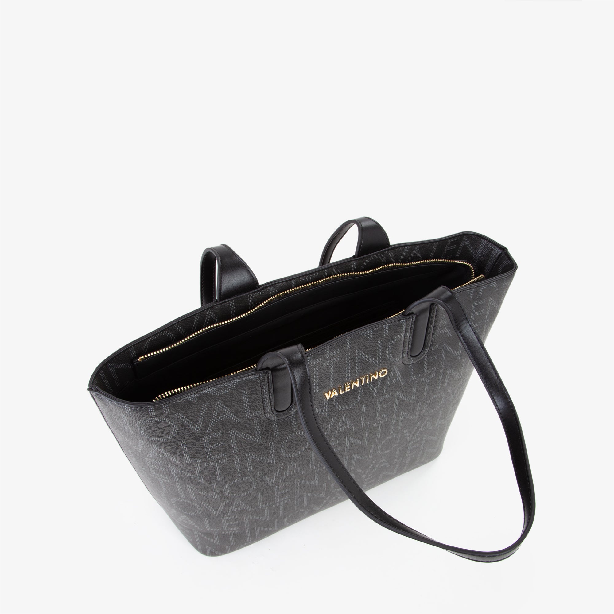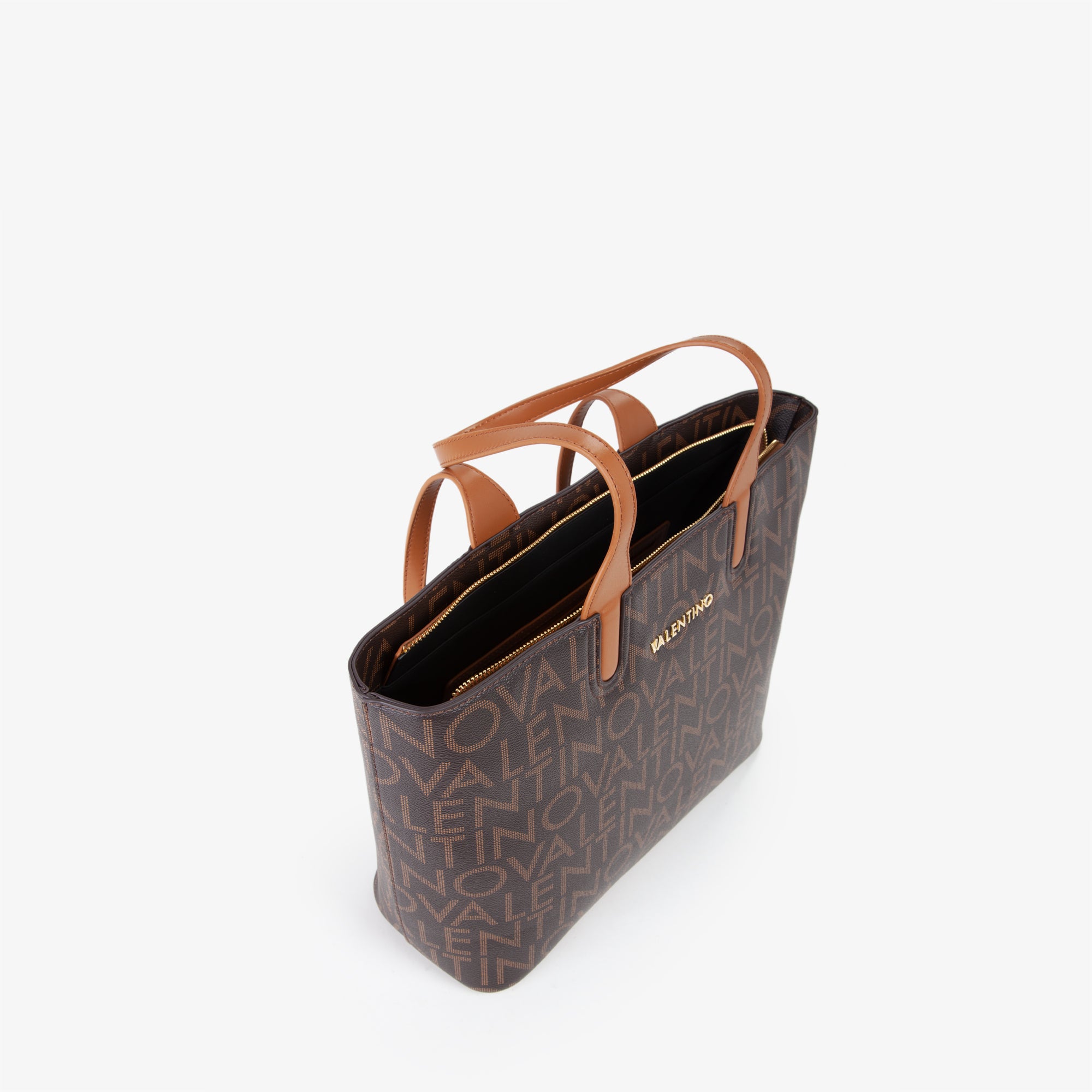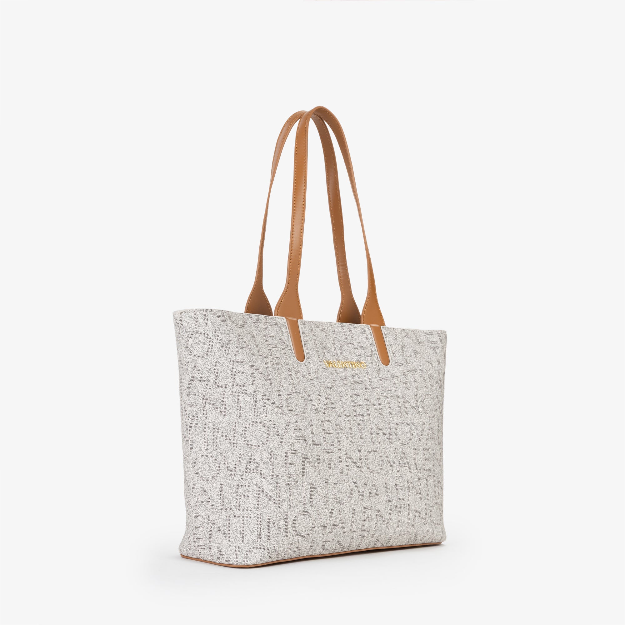Borsa con stampa all over logato su base grana riciclata, e dettagli in nappa tracolla a nastro con logo jaquard in tono