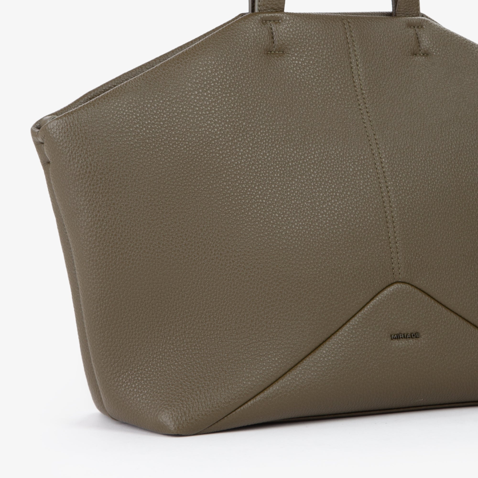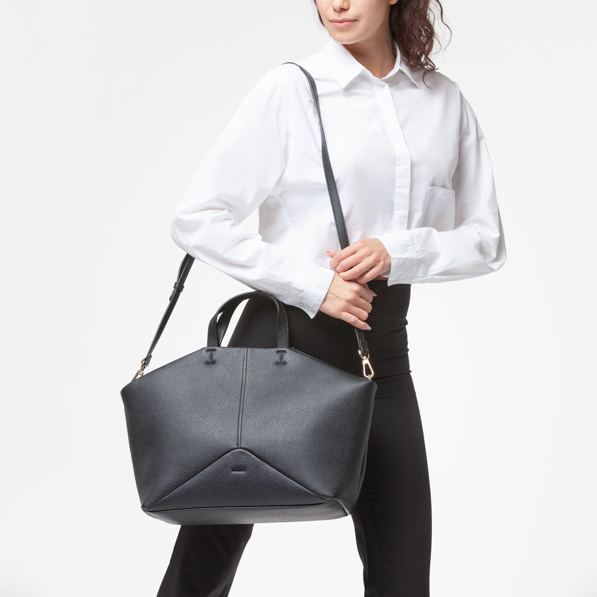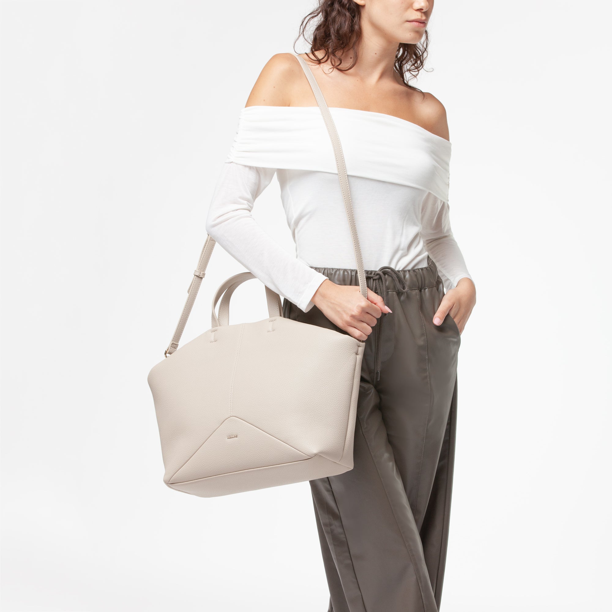La borsa è dotata di un manico che permette di portarla comodamente a mano. Inoltre, è presente una tracolla regolabile e staccabile, offrendo la versatilità di portarla anche a spalla. Questa combinazione di elementi rende la borsa ideale per l'uso quotidiano, adattandosi facilmente alle proprie esigenze.-Il dettaglio taglio sulla parte frontale forma una V rovesciata, creando un elemento distintivo che aggiunge un tocco di eleganza al design minimalista.-Perfetta per chi cerca un accessorio pratico e alla moda, questa borsa basica è un must-have nel guardaroba di ogni donna.