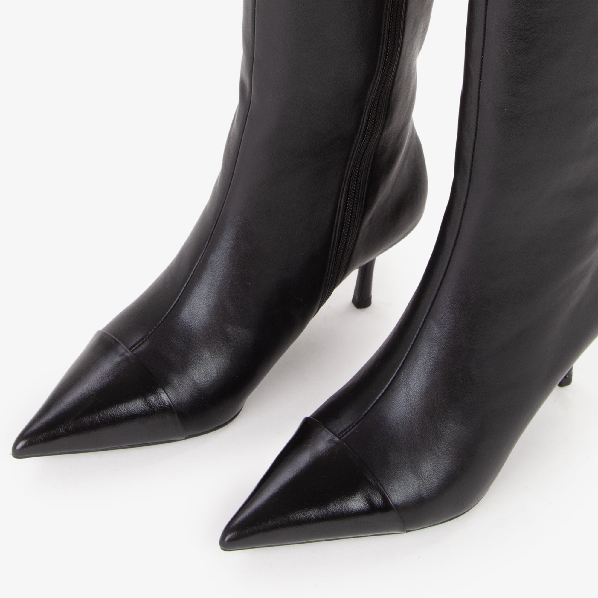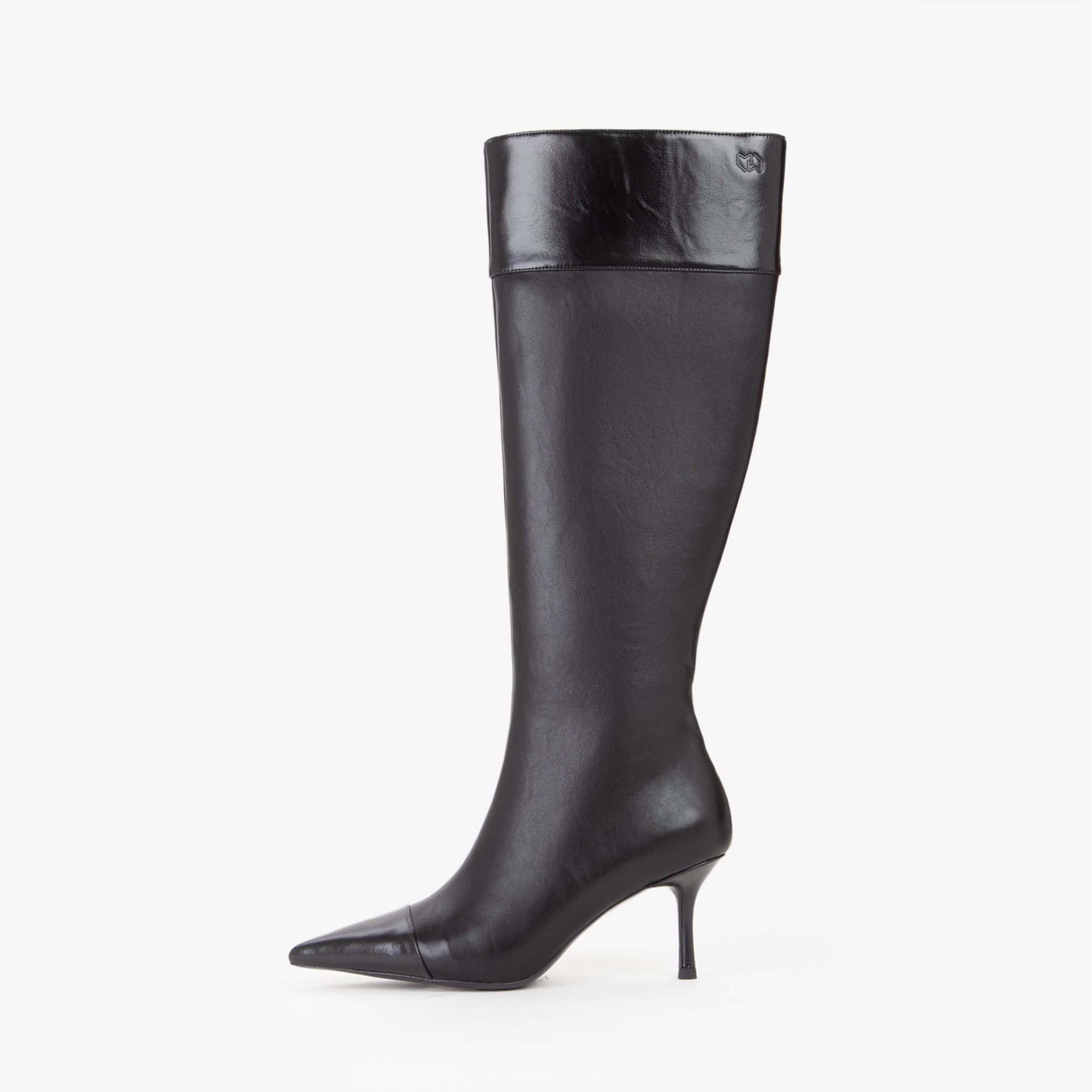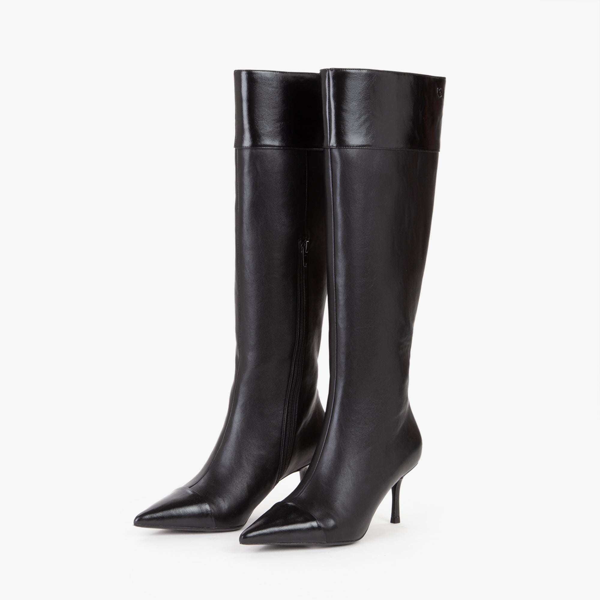 Stivale al ginocchio realizzato in materiale sintetico con finitura effetto pelle, caratterizzato da una tomaia affusolata e gambaledritto con inserto lucido a contrasto sul bordo superiore. La silhouette è completata da una punta sfilata e da un tacco sottile leggermente incurvato, che slancia senza sacrificare la stabilità. La suola è in materiale sintetico flessibile, ideale per un uso quotidiano. Perfetto con abiti midi o gonne longuette, per un look metropolitano raffinato.undefined