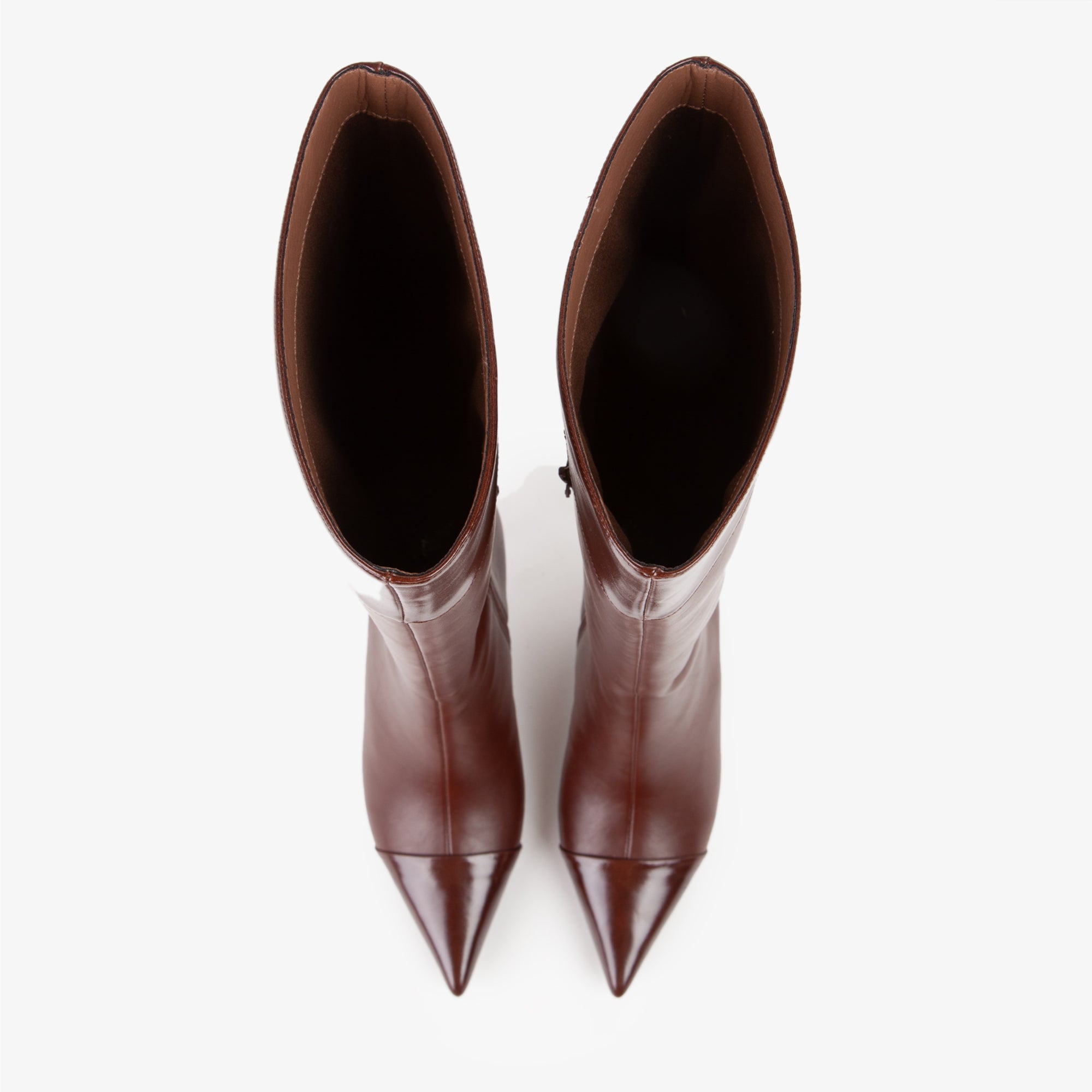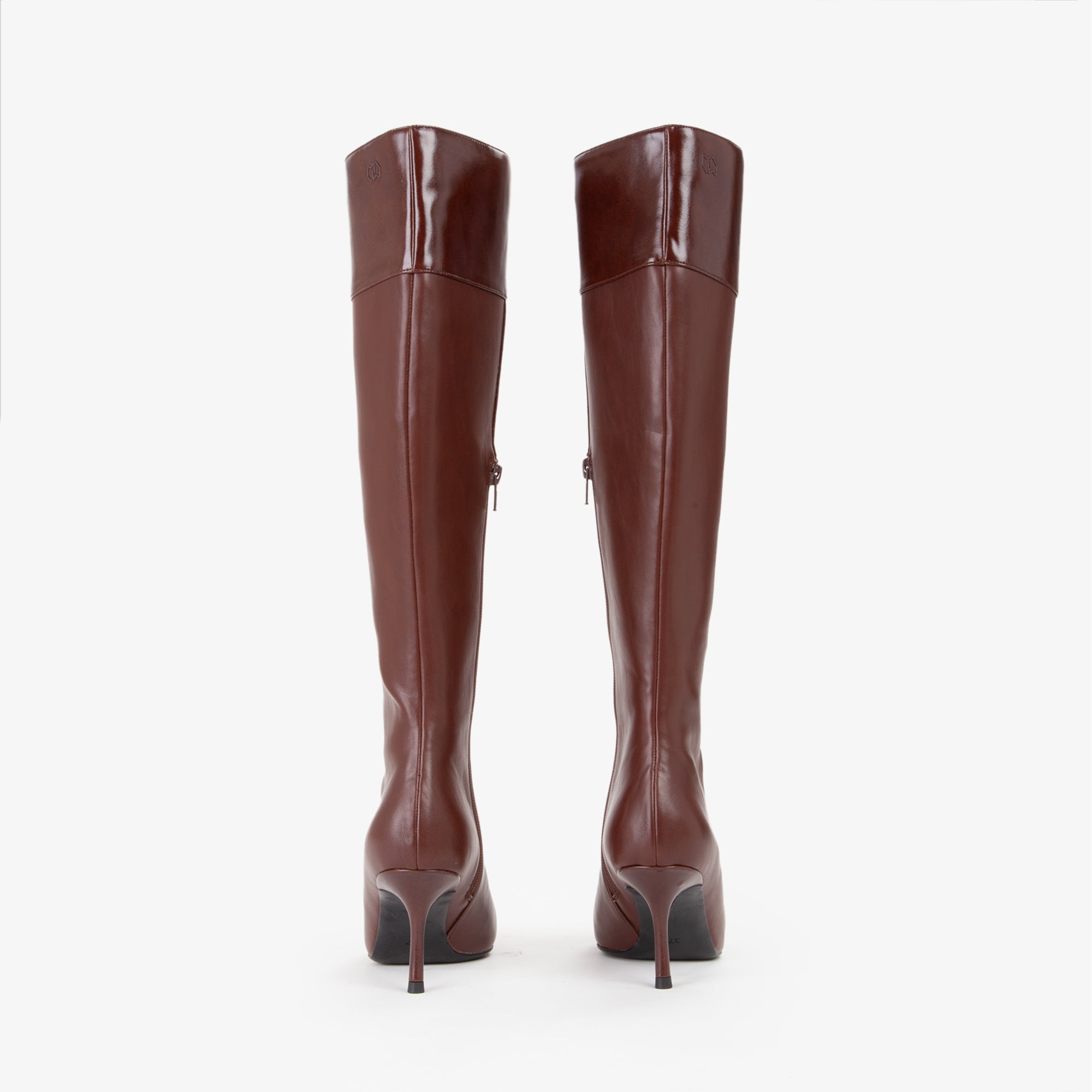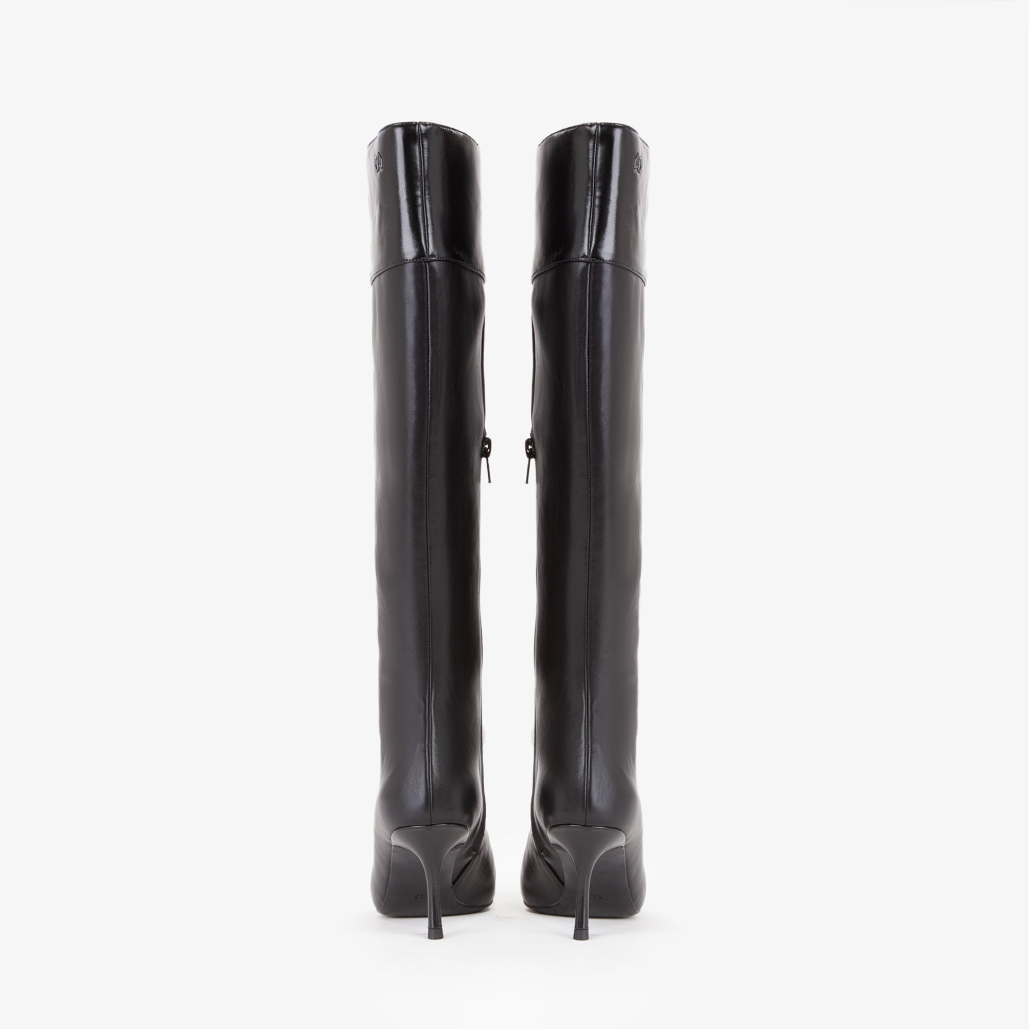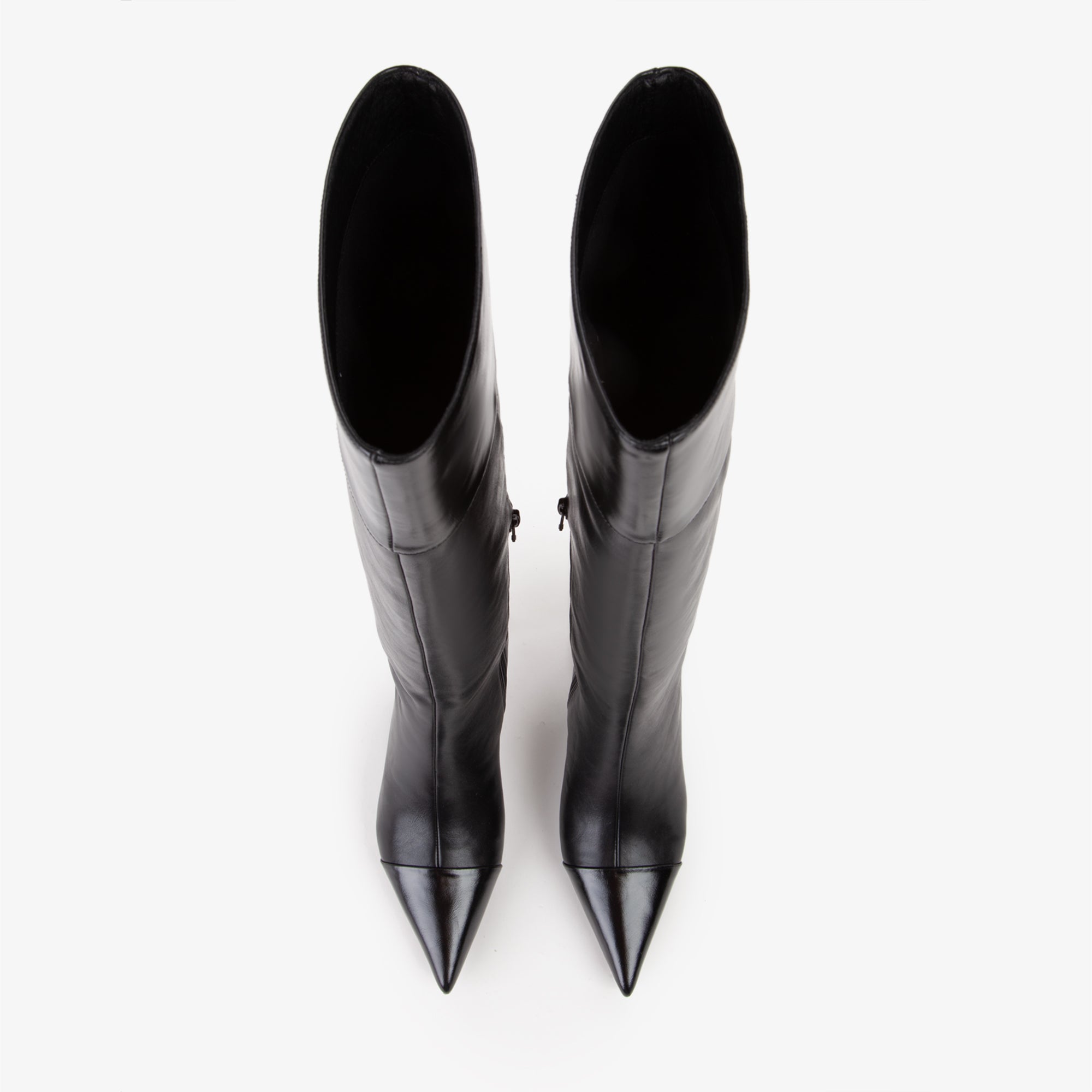 Stivale al ginocchio realizzato in materiale sintetico con finitura effetto pelle, caratterizzato da una tomaia affusolata e gambaledritto con inserto lucido a contrasto sul bordo superiore. La silhouette è completata da una punta sfilata e da un tacco sottile leggermente incurvato, che slancia senza sacrificare la stabilità. La suola è in materiale sintetico flessibile, ideale per un uso quotidiano. Perfetto con abiti midi o gonne longuette, per un look metropolitano raffinato.undefined