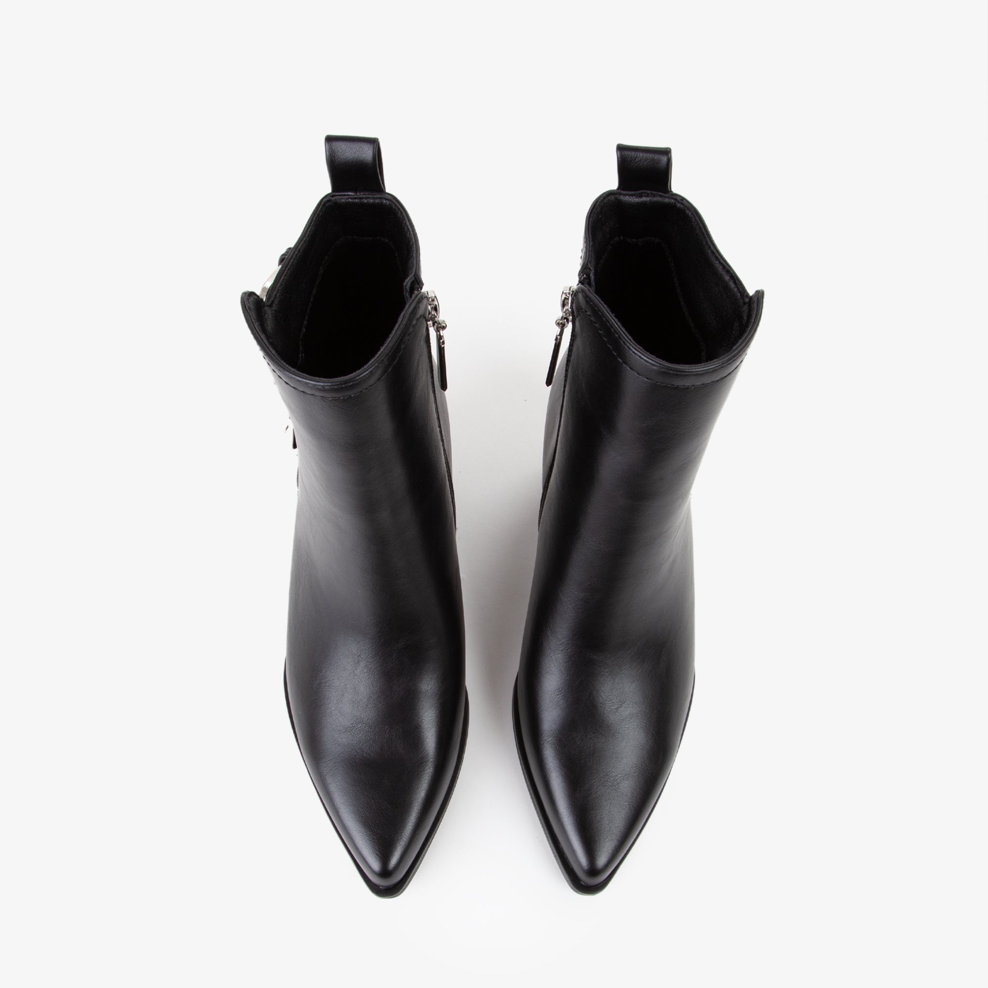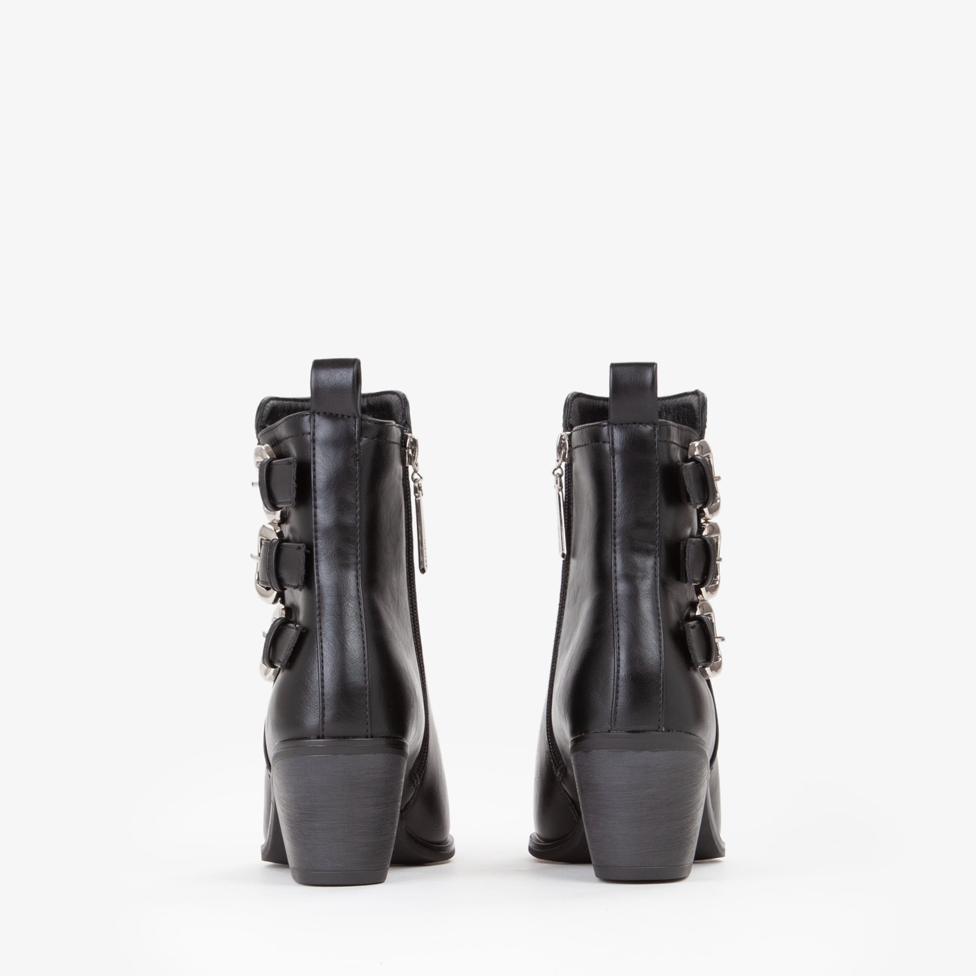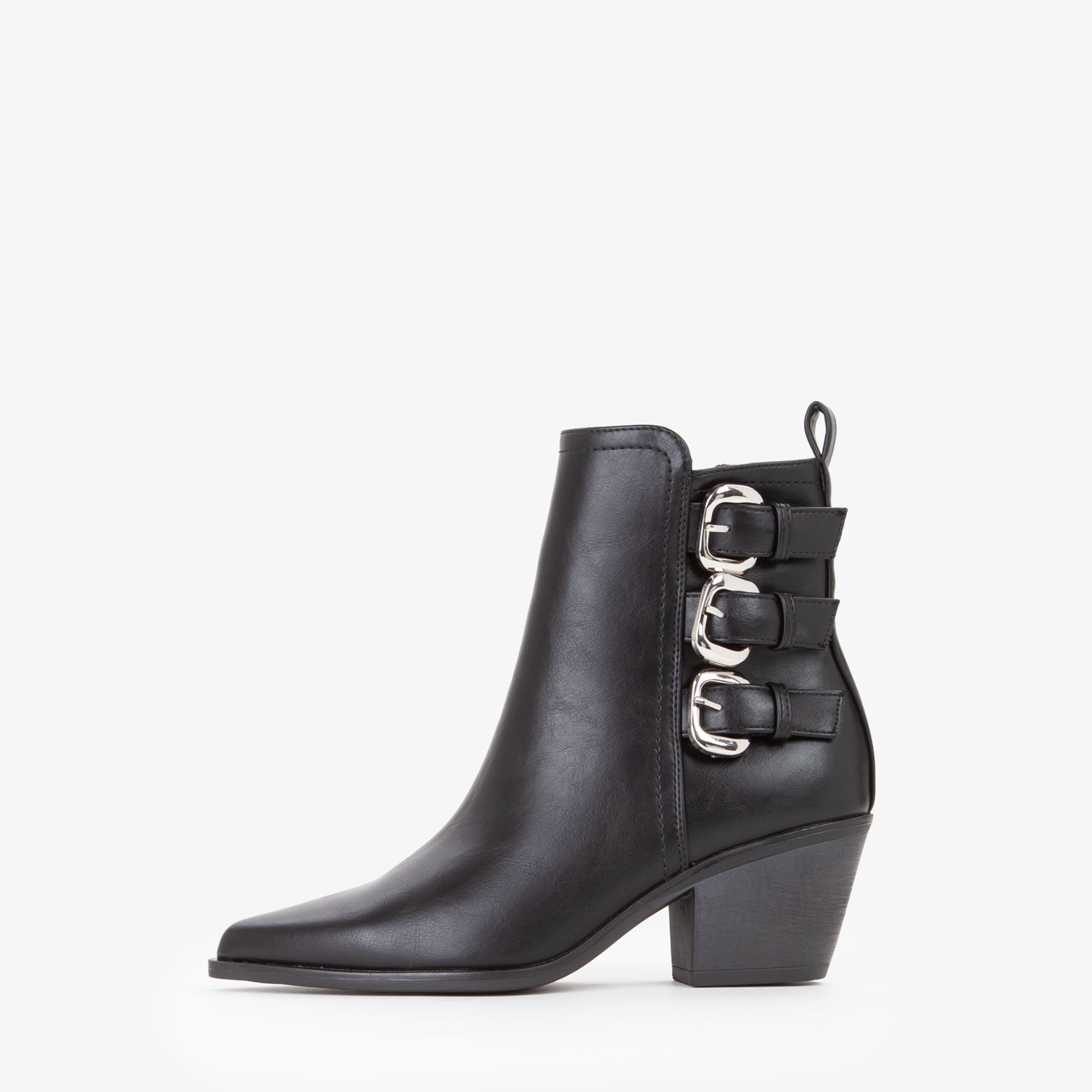 Tronchetto texano dal design deciso e versatile, caratterizzato da tre cinturini laterali con fibbie in metallo argento che donano un tocco rock-chic. Il tacco medio squadrato assicura comfort e stabilità, rendendolo adatto sia per luso quotidiano sia per seratedal look grintoso. Perfetto da abbinare a jeans skinny, abiti corti o gonne in pelle per un outfit dal carattere audace.undefined