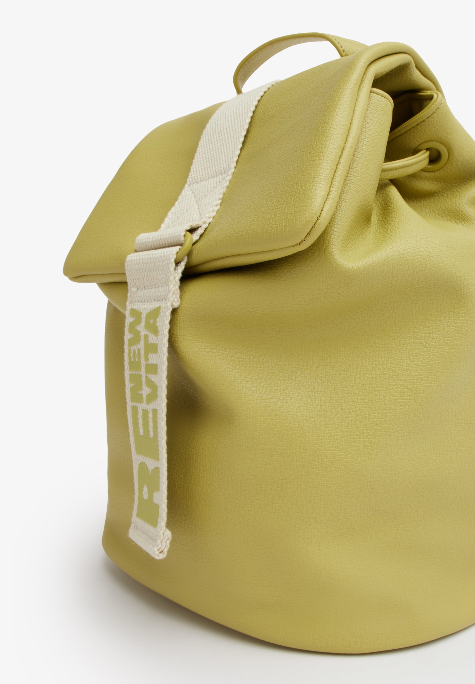 questo modello gioca sui contrasti per chi non vuole passare inosservato. La morbidezza del materiale incontra la rigidità tecnica del nastro, creando un accessorio che è pura attitudine urbana. Il nastro in webbing non è solo un supporto, ma l'anima del design, attraversato dalla scritta stampata verticale RE NEW VITA a contrasto.